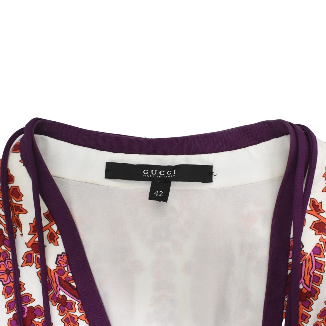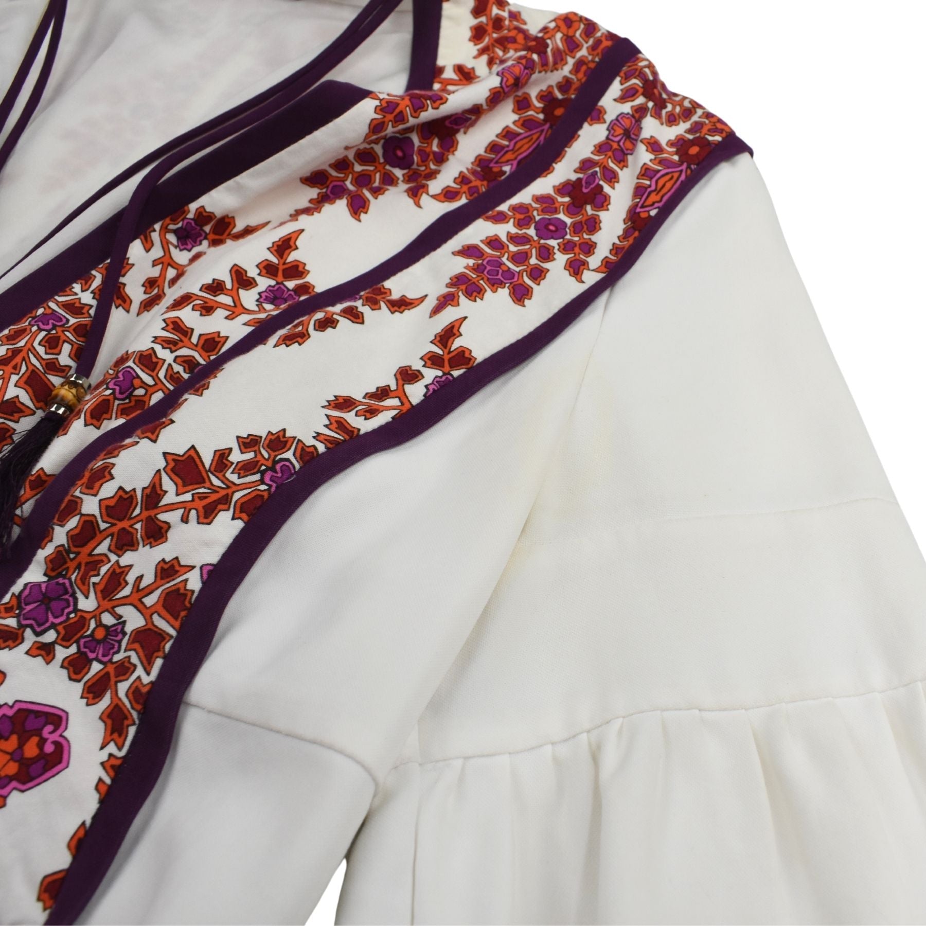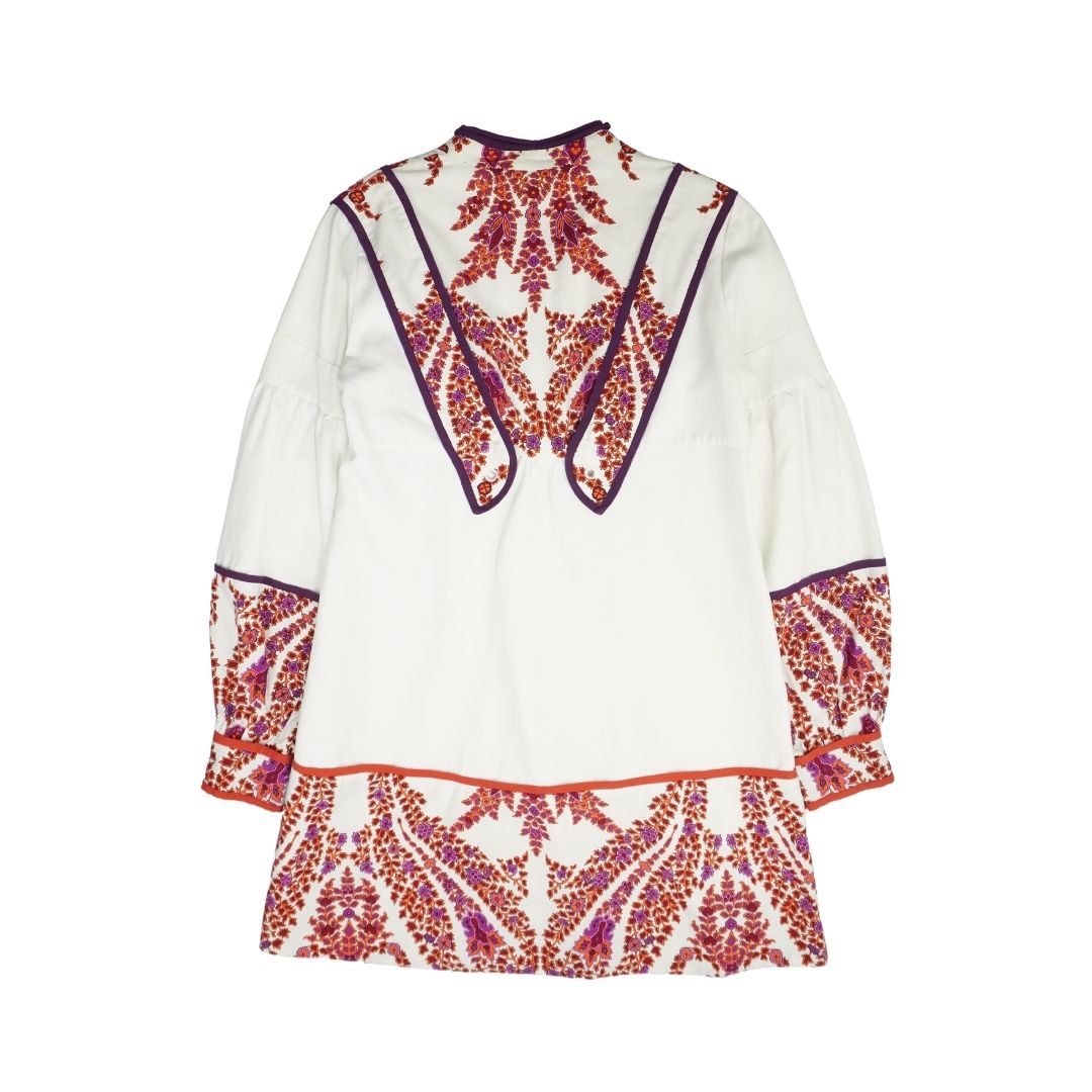 Gucci mini dress in white cotton with with red, purple, and pink floral panels, purple trim, and drawstrings at the neck with bamboo beads and tassels.