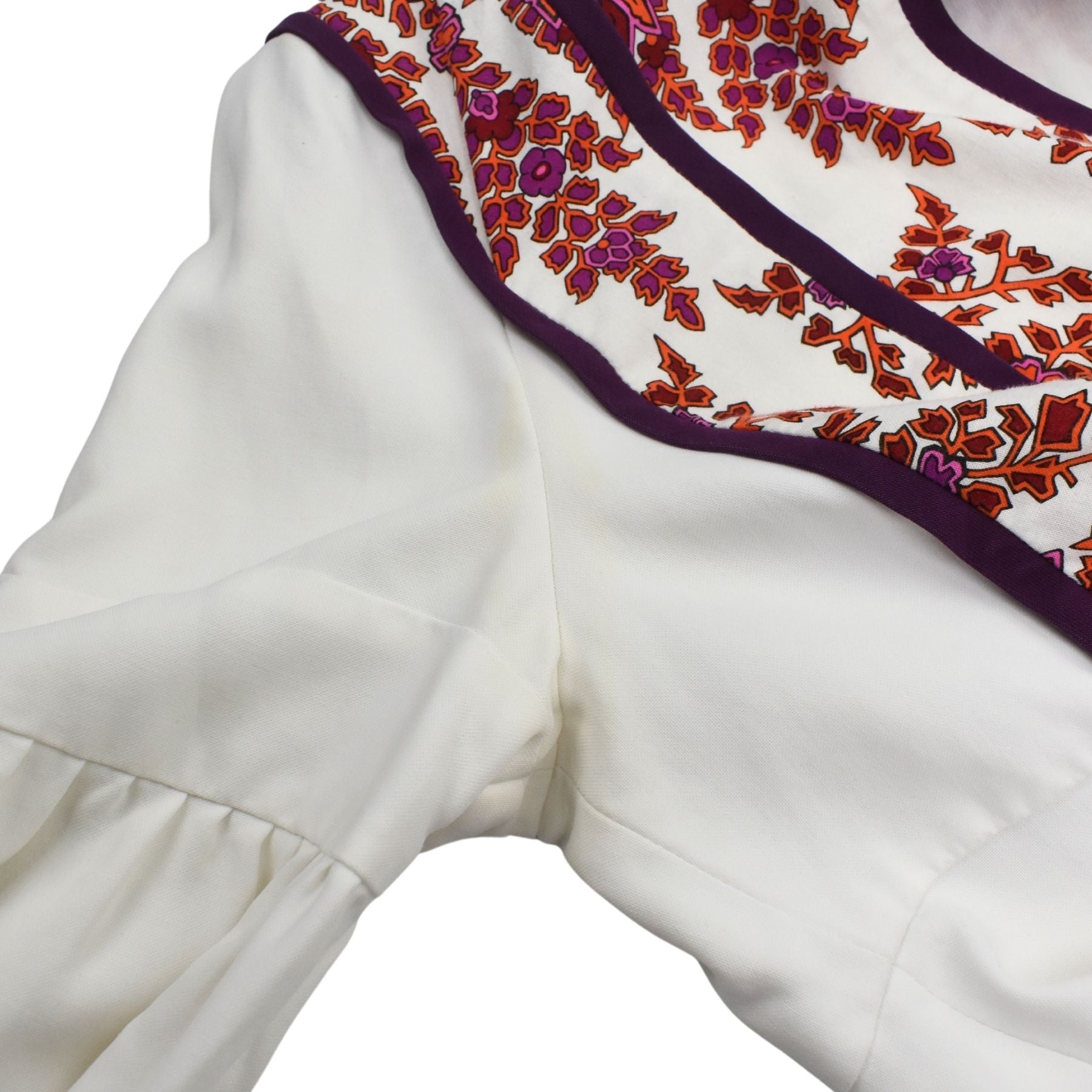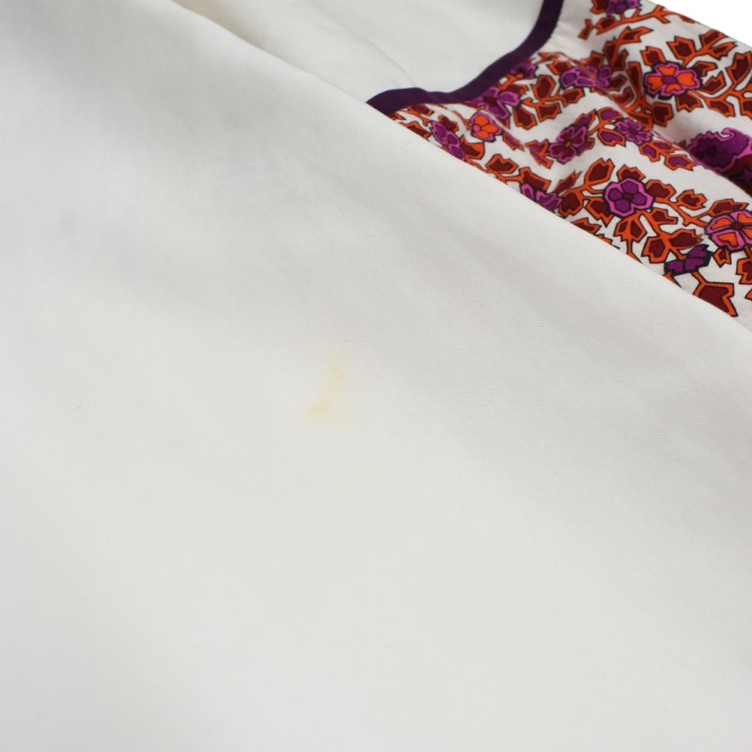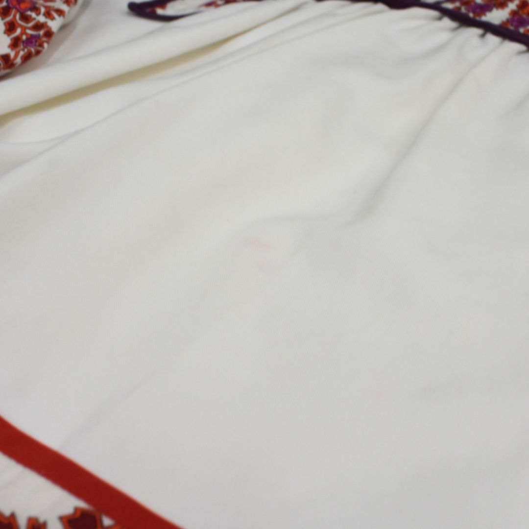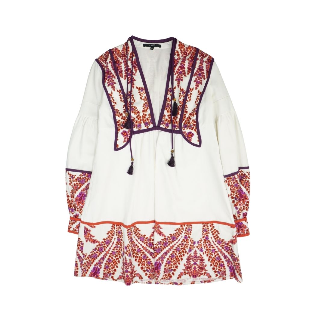 Gucci mini dress in white cotton with with red, purple, and pink floral panels, purple trim, and drawstrings at the neck with bamboo beads and tassels.