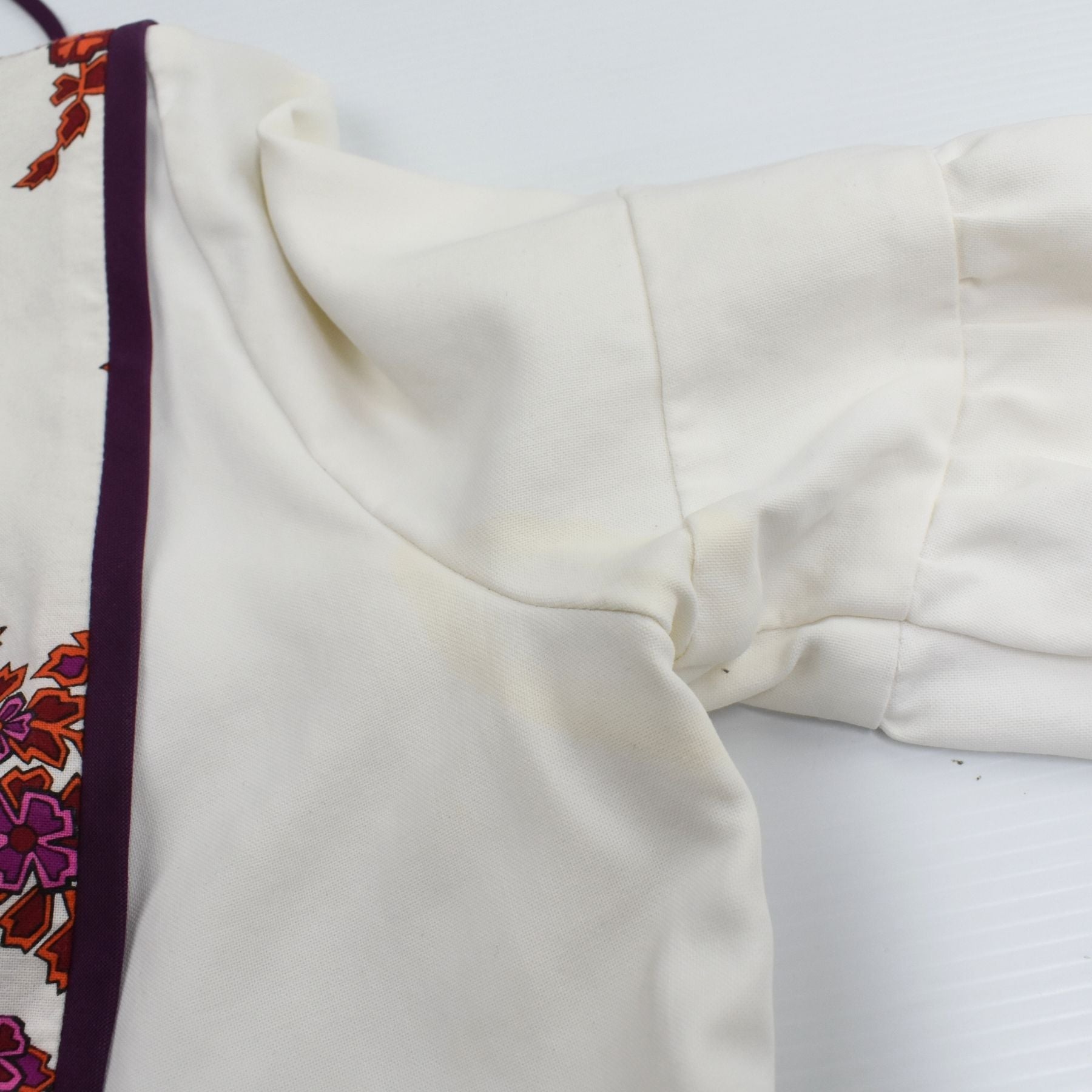 - Condition = 7/10, Good. Light staining on front of skirt and underarm area