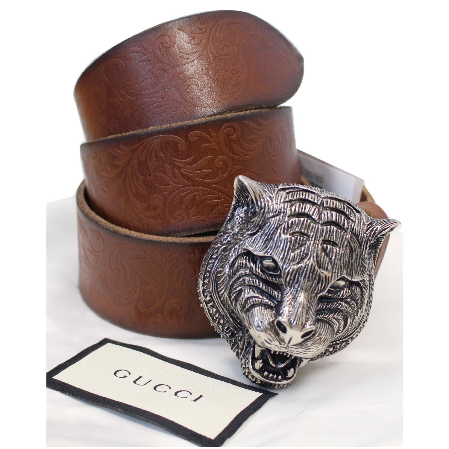 Gucci Feline Buckle Calfskin Leather Belt Brown