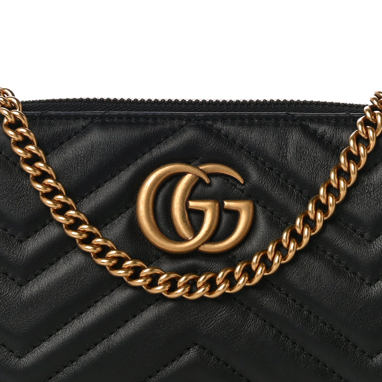 This small bag features an antiqued gold chain crossbody strap and an aged gold interlocking GG logo on the front. The top zipper opens to a beige microfiber interior with a zipper pocket and card slots.