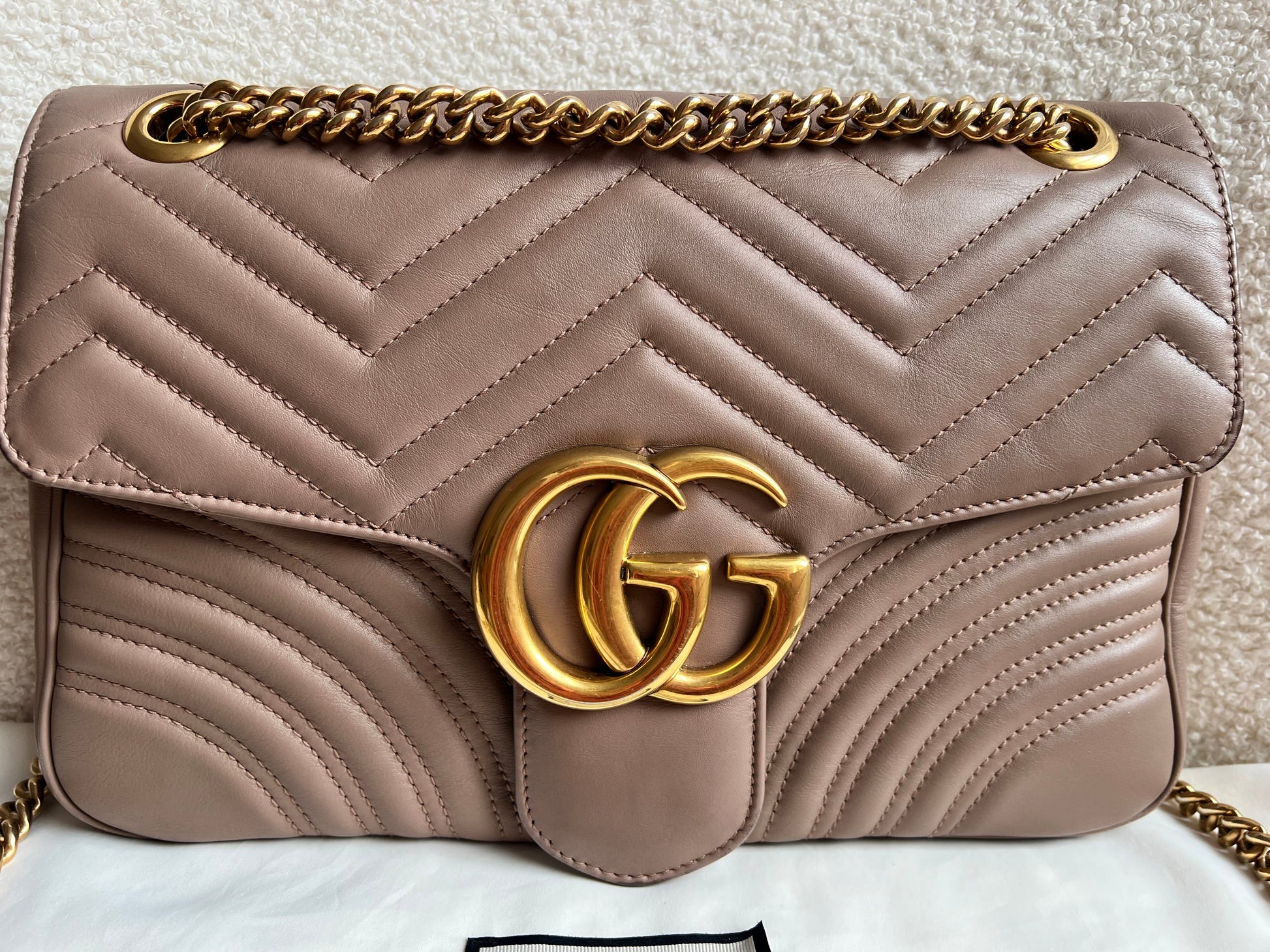 Gucci GG Marmont medium shoulder bag in dusty pink matelasse chevron leather with gold hardware. This medium Marmont bag has a softly structured shape and an oversized flap with GG hardware and heart detail on the back. The sliding chain can be worn multiple ways either doubled up or lengthened. Effortlessly chic and sophisticated, this style can be worn both with a casual outfit or for evening wear. Suitable for both day to day or occasion wear and ideal for those who prefer a cross body option.