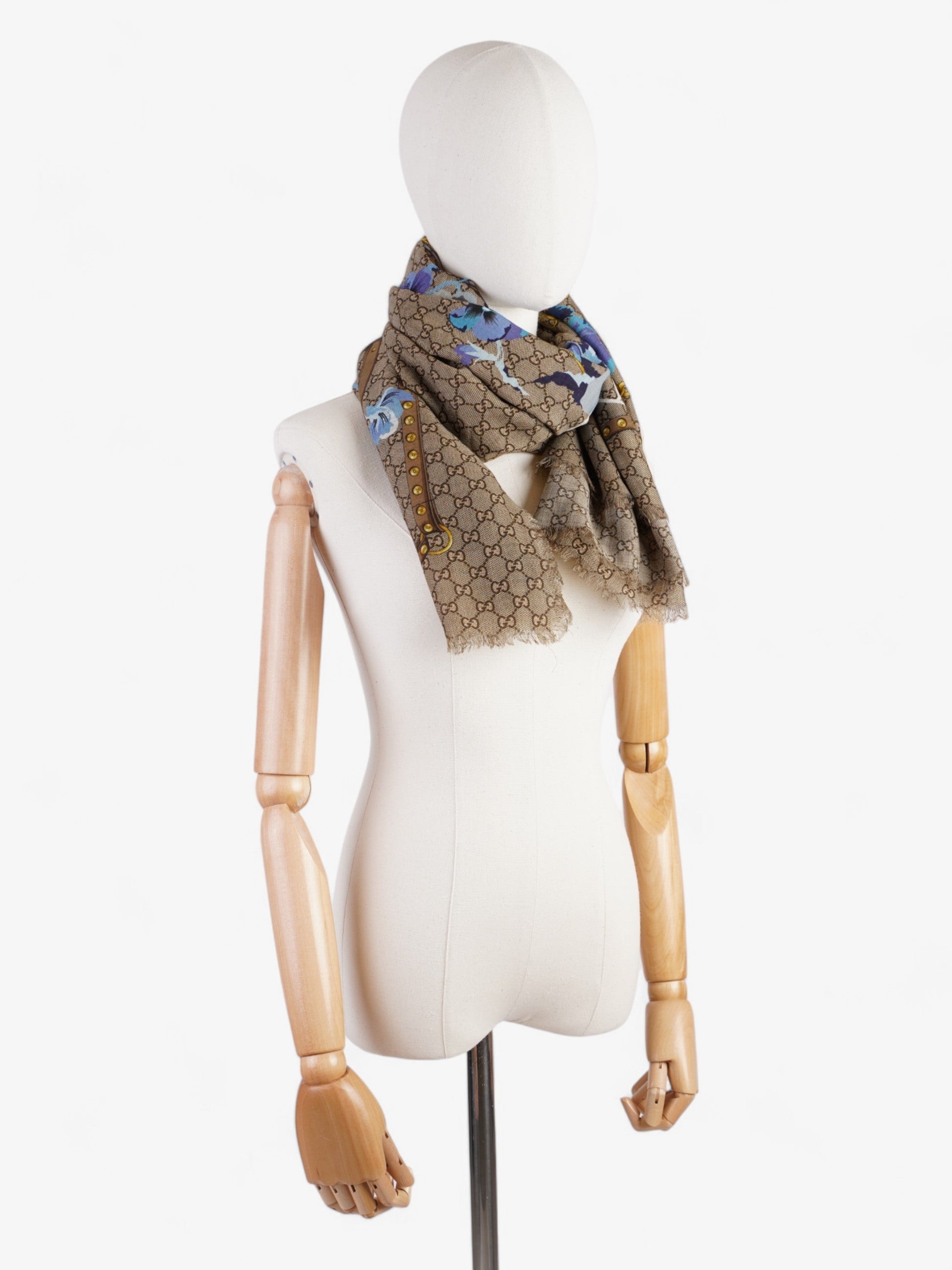 Gucci GG Floral Print Scarf GG Supreme / Blue / Gold Wool