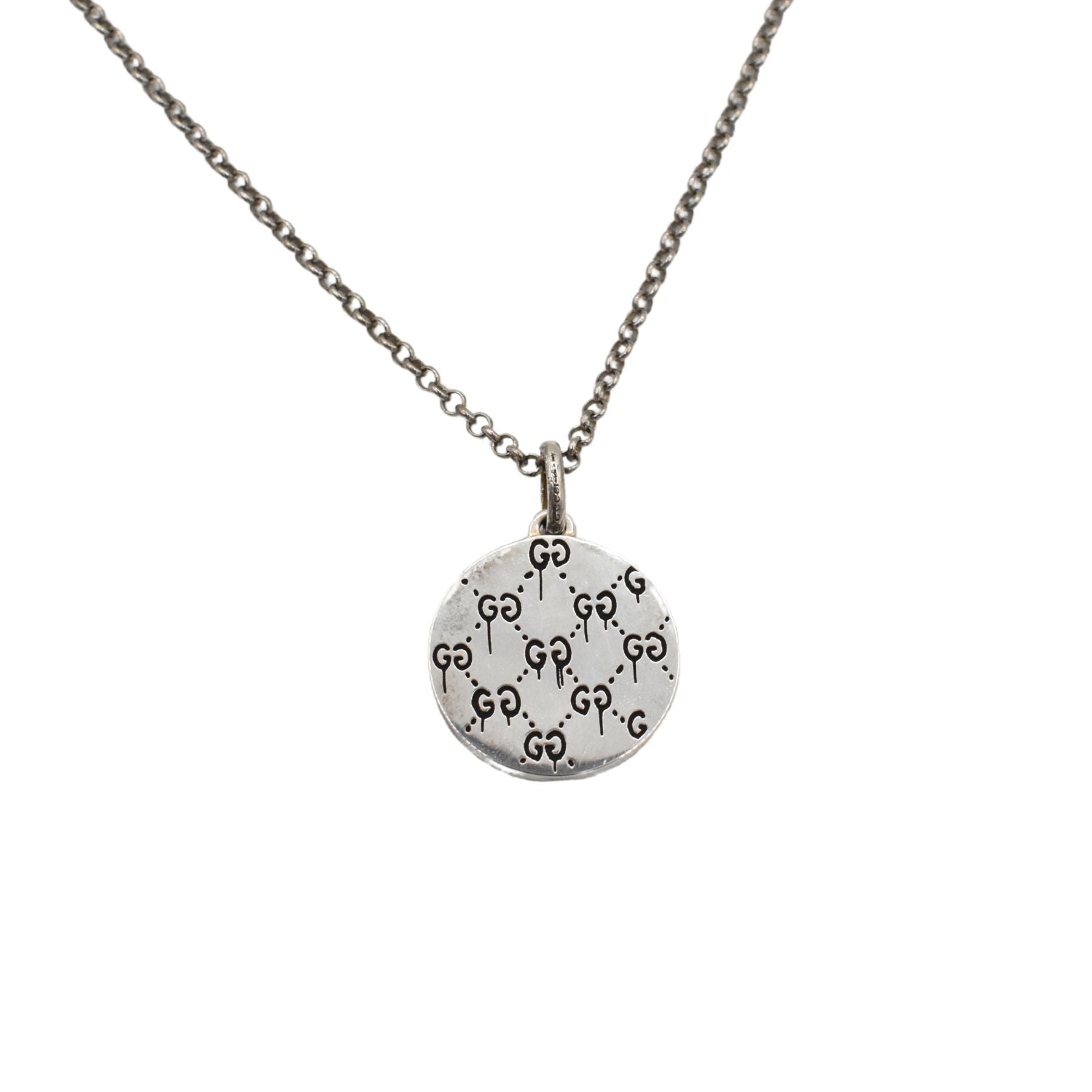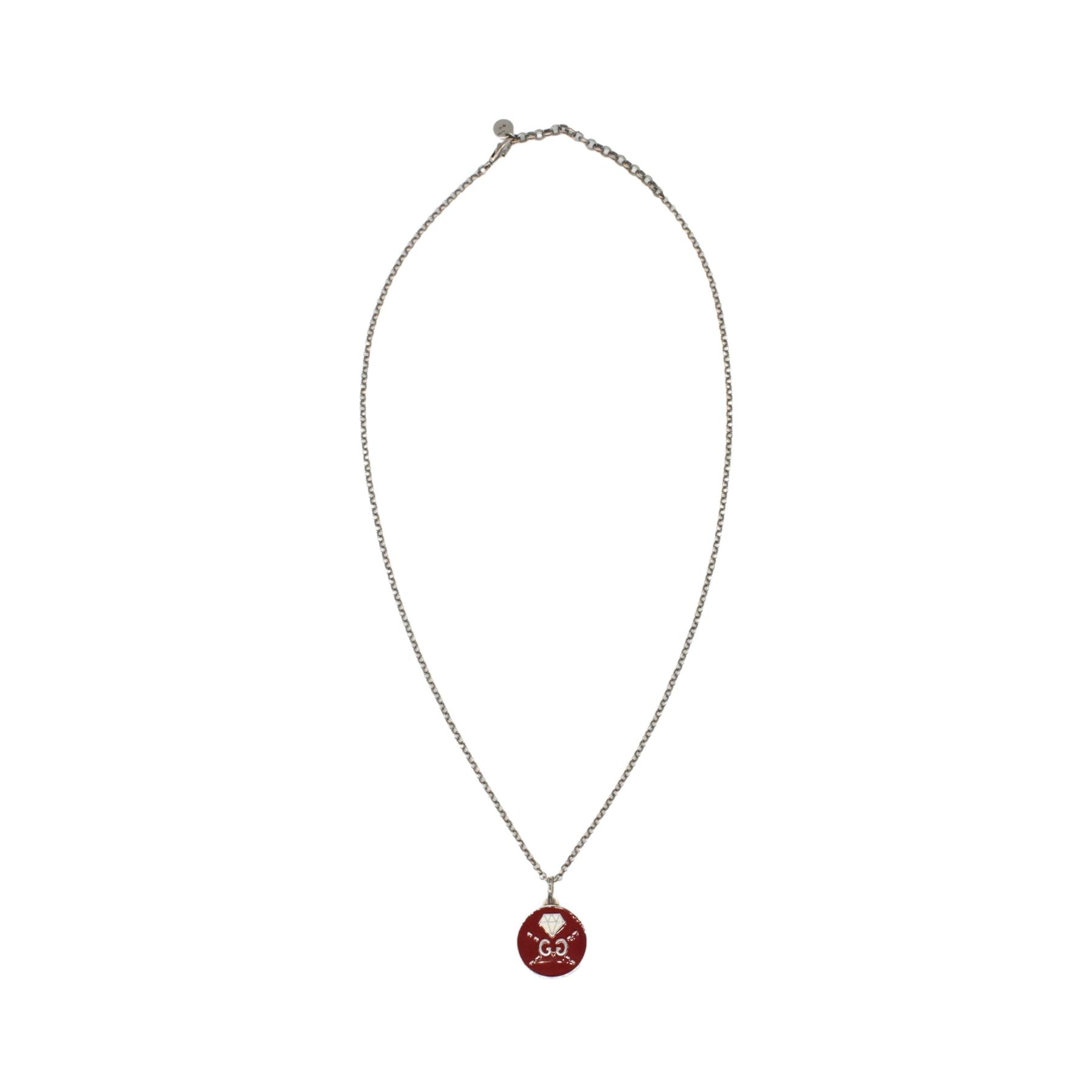Gucci 'GG Ghost' necklace in 925 sterling silver with a circular red enamel pendant with a diamond logo and a 'ghost' logo embossed back.