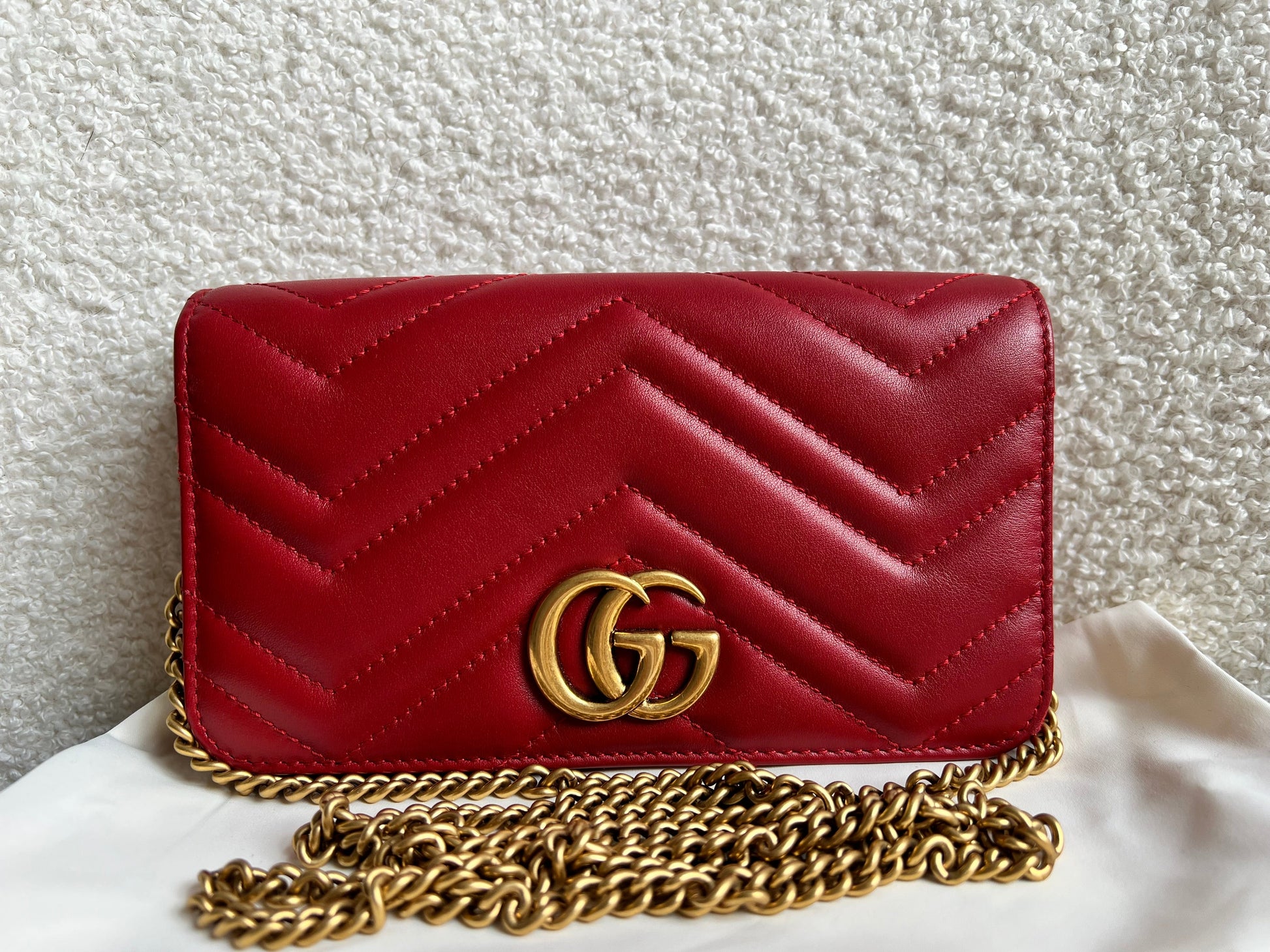 Gucci GG Marmont 2.0 Chain Flap Wallet in hibis is red matelasse chevron leather with gold hardware. This flap chain wallet is perfect for evening wear and fits the essentials. Fits a small mobile phone. Can be carried over should or cross body using the chain strap or used as a handheld clutch as the chain is removable.