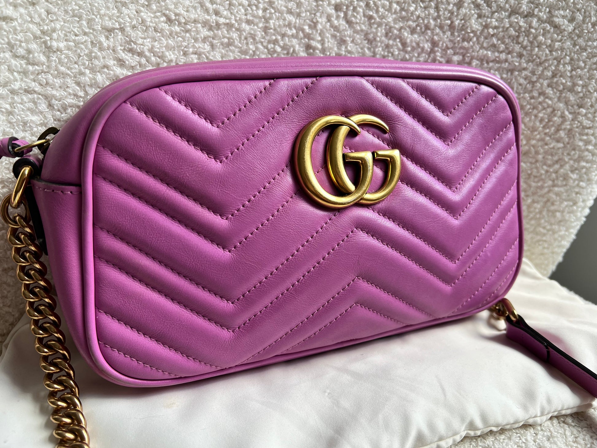 Gucci GG Marmont small shoulder bag in hot pink chevron matelassé leather with antique gold hardware. This small Marmont chain camera style bag has a softly structured shape and zip top closure. Effortlessly chic and sophisticated, this style can be worn both with a casual outfit or for evening wear. Suitable for both day to day or occasion wear and ideal for those who prefer a cross body option.