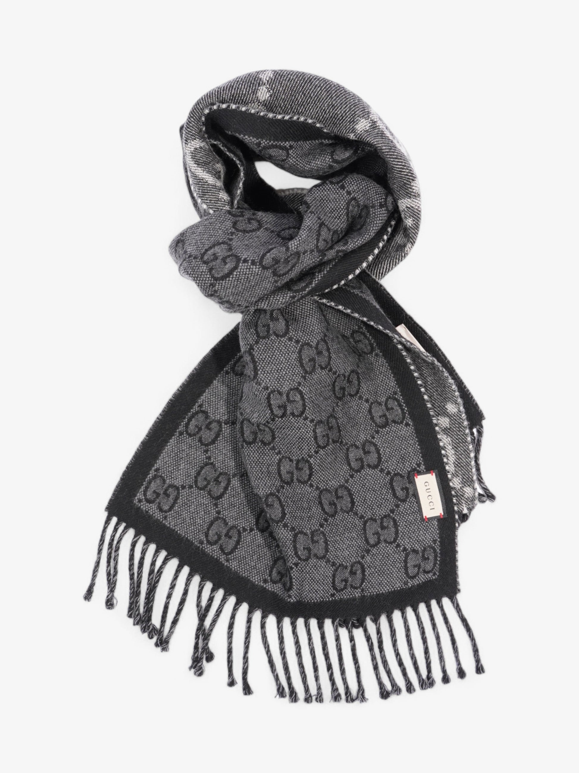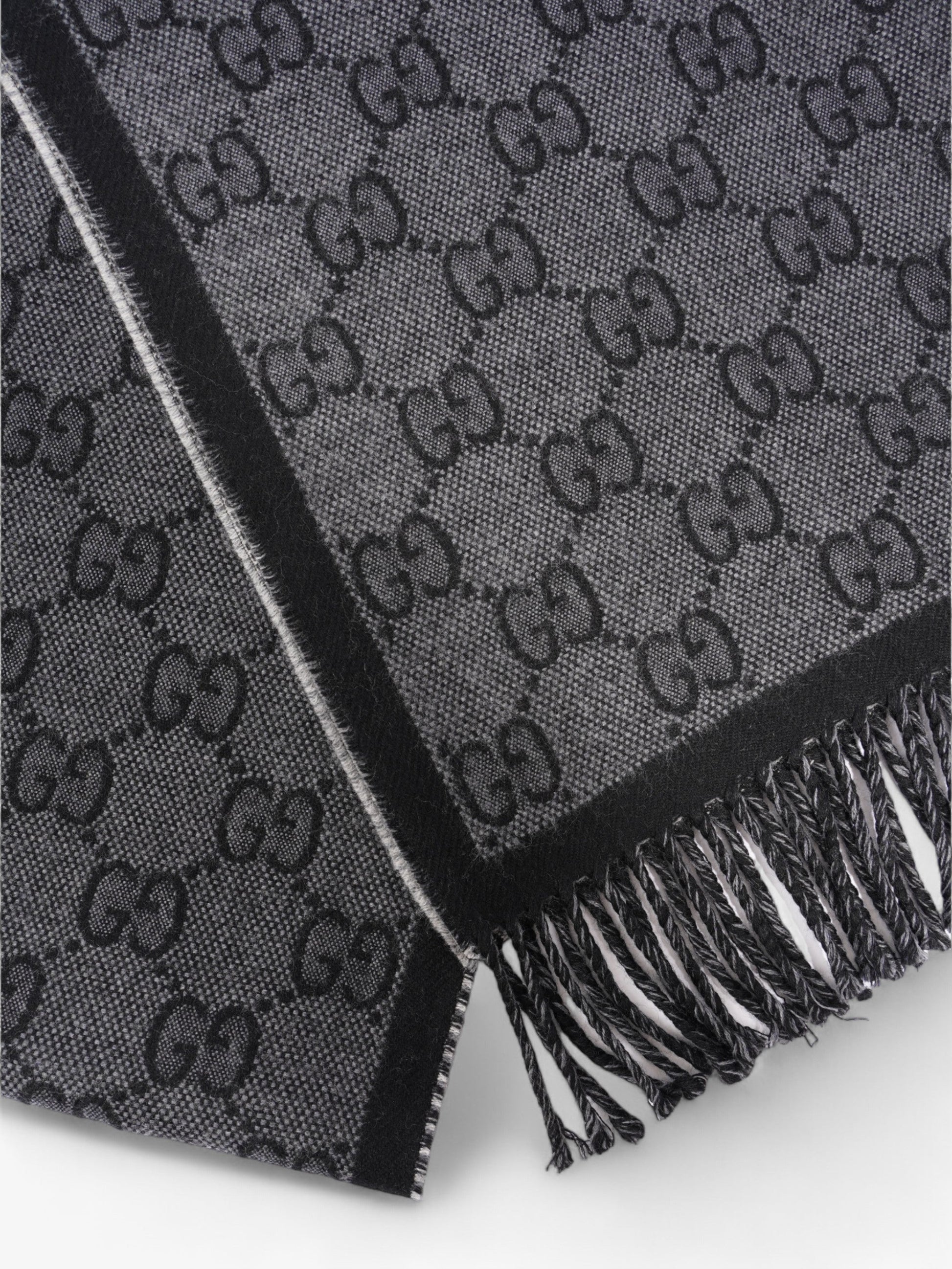 Gucci GG Jacquard Pattern Scarf with Tassels GG Supreme / Black / Grey Wool