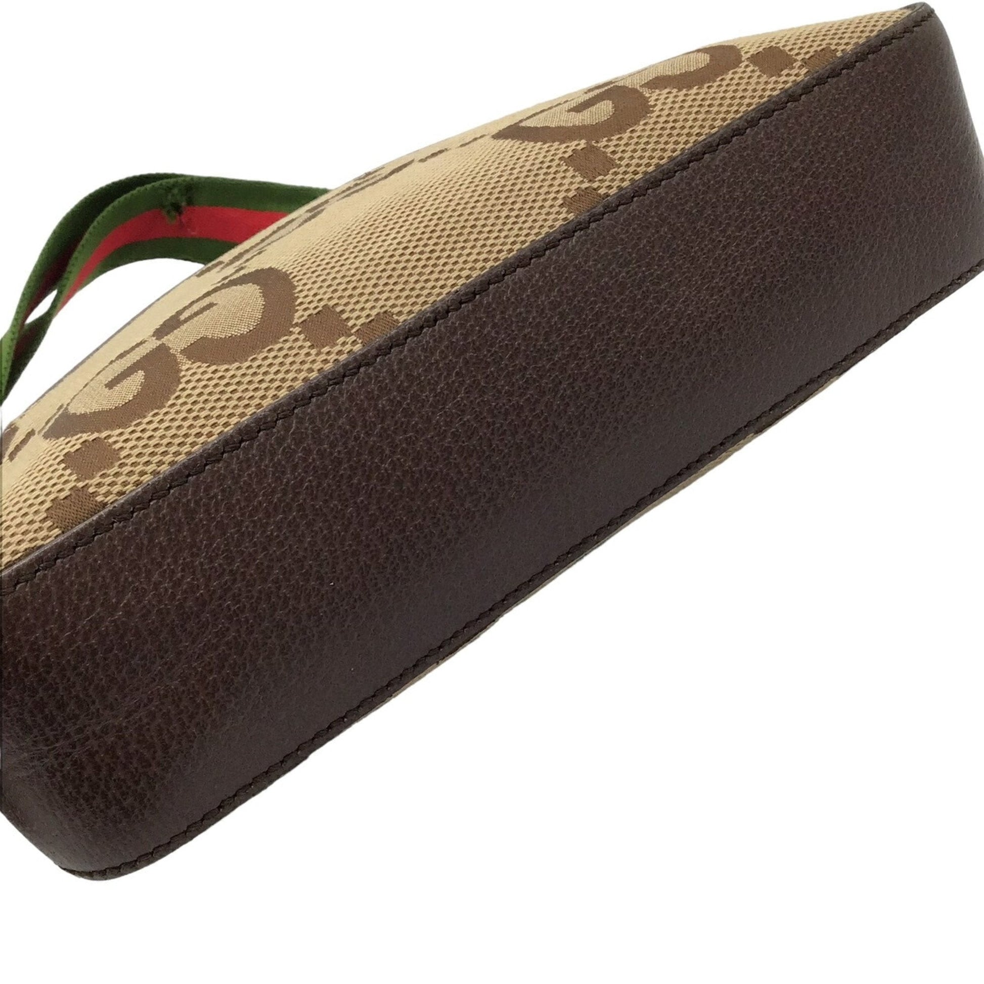 This Gucci GG Jumbo shoulder bag, crafted from GG canvas and leather in a sophisticated camel color, is a versatile accessory suitable for both men and women. The bag's classic design and high-quality materials make it a timeless piece.