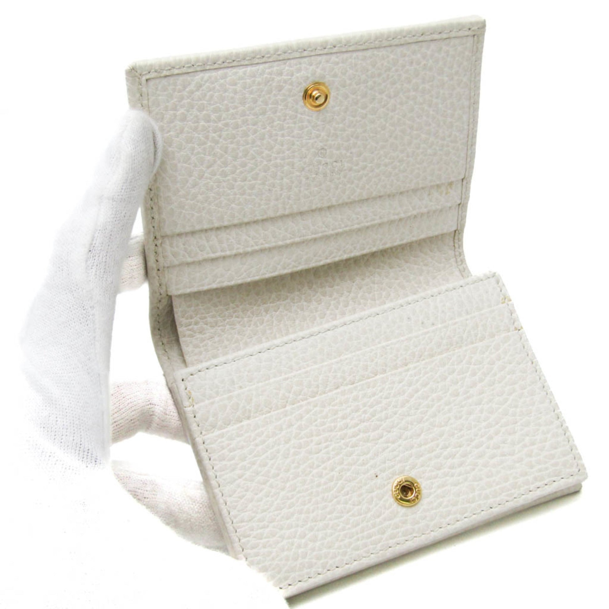 This Gucci GG Marmont 456126 bi-fold wallet is crafted from off-white leather and originates from Italy. Designed for women, it features a sleek and elegant style.