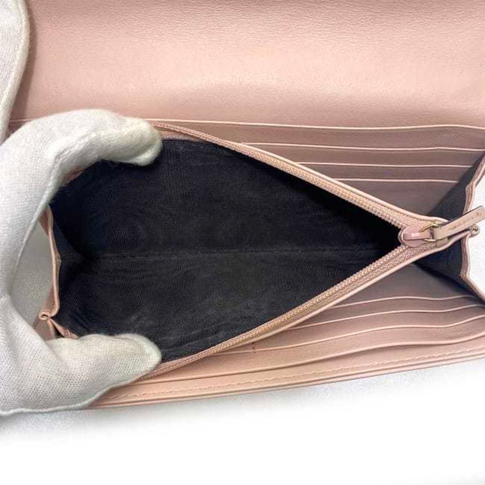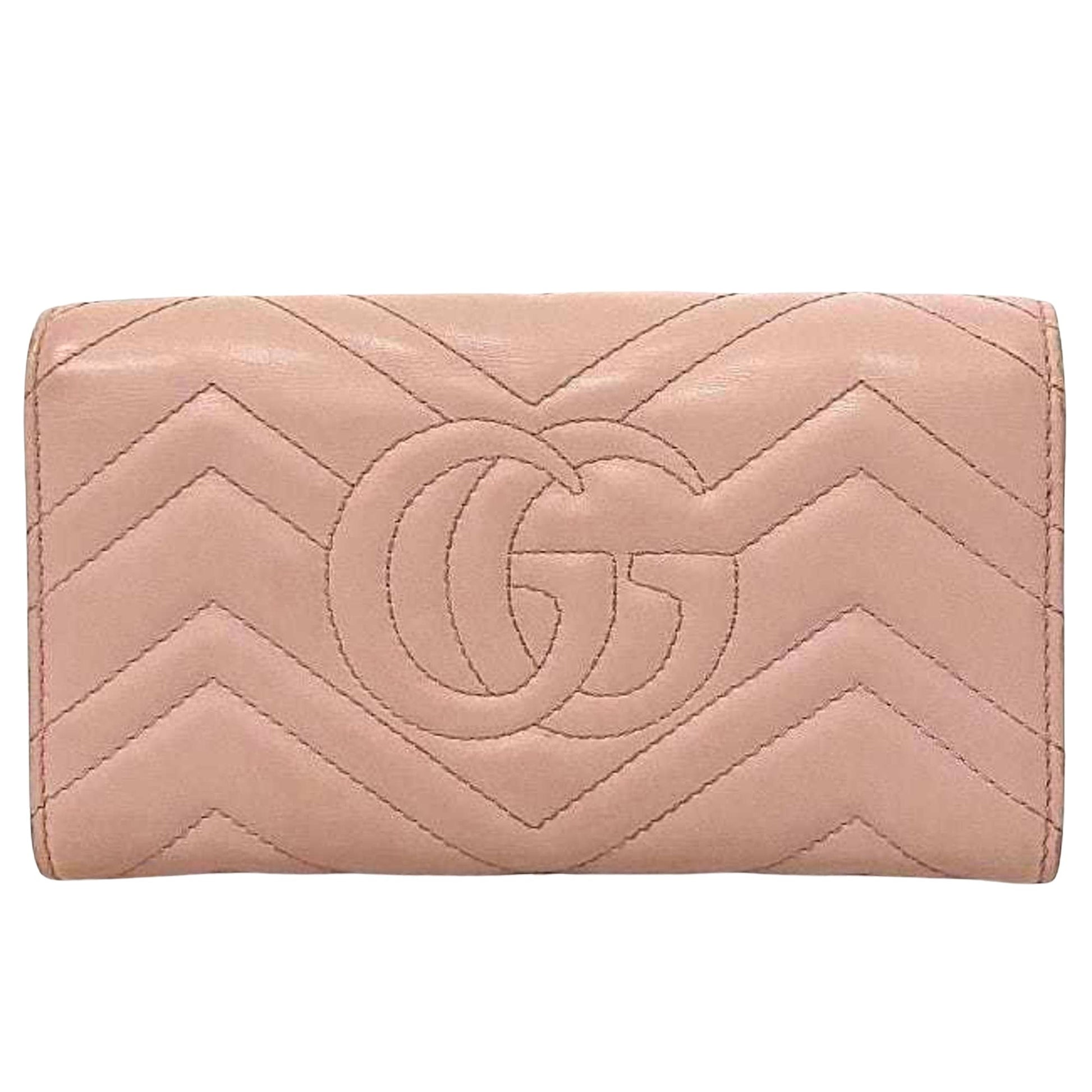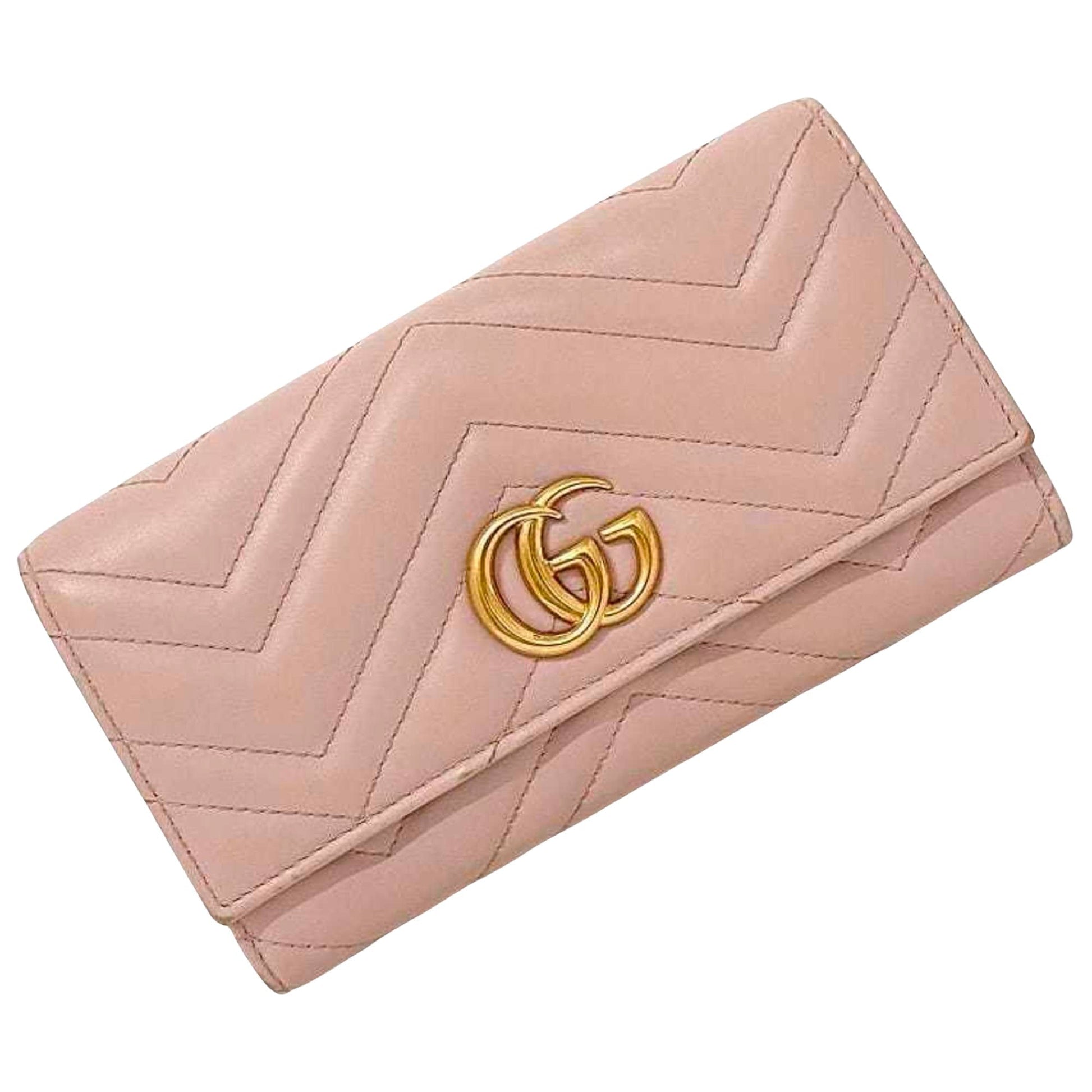 The Gucci GG MARMONT long wallet, designed for women, boasts a sophisticated bi-fold design and is crafted from luxurious leather in a captivating combination of gold and pink hues.