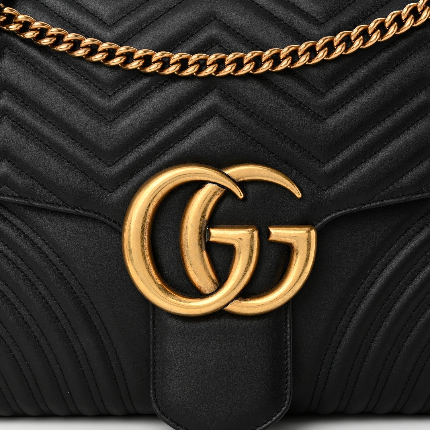This Large Chic Shoulder- Handbag bag is crafted of smooth and supple calfskin leather in black. This bag features an aged gold chain with a leather shoulder strap and an gold GG logo on the front. The bag opens to a beige microfiber interior with zipper and patch pockets.