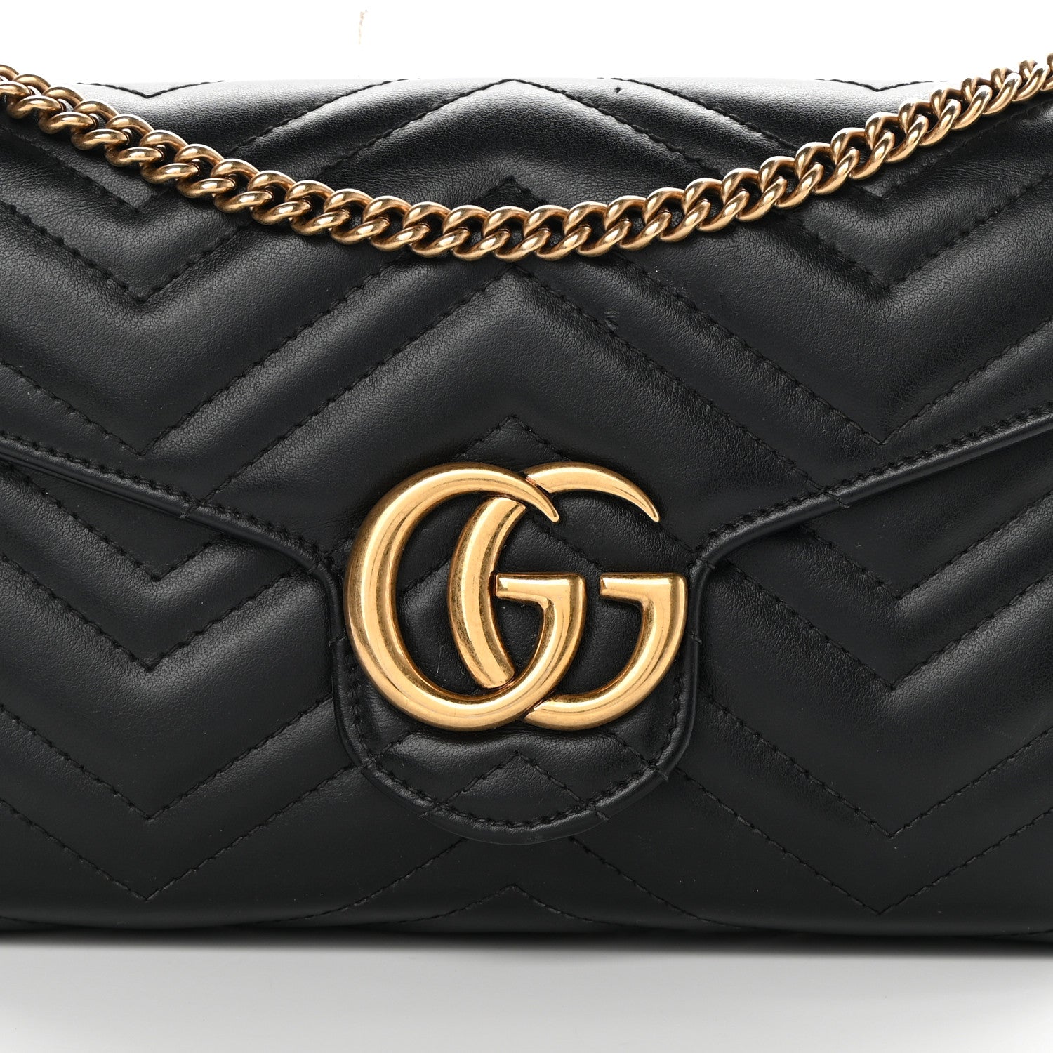 Black leather GG Marmont mini bag from Gucci featuring signature Double G logo, quilted finish, chain-link shoulder strap, Aged gold-tone hardware, press-stud fastening, internal zip-fastening pocket, and internal card slots.