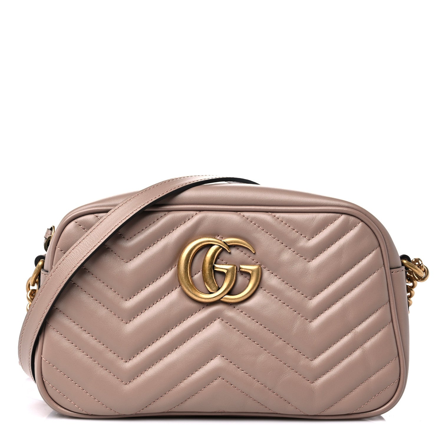The small GG Marmont chain shoulder bag has a softly structured shape and a zip-top closure with the Double G hardware. The chain shoulder strap has a leather shoulder detail. Made in Matelassé leather with a chevron design.