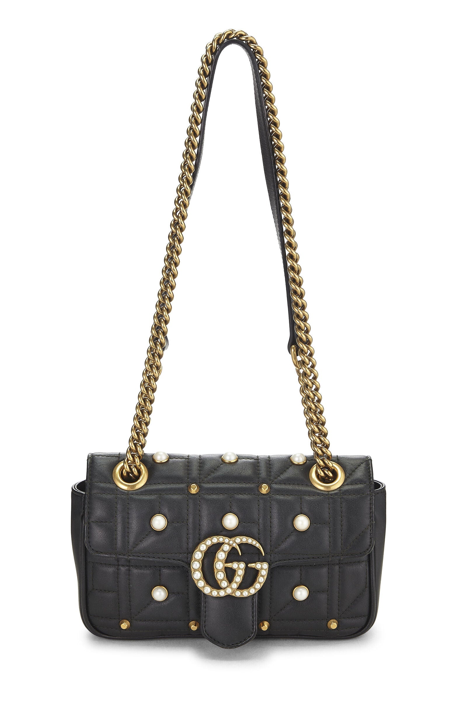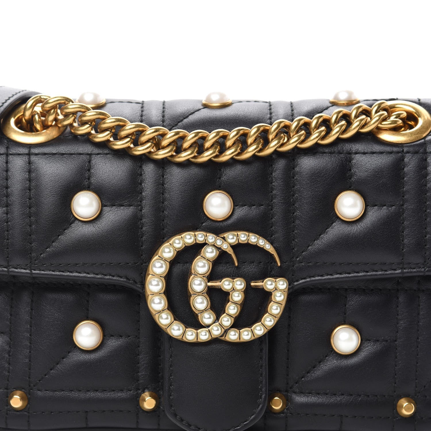 It features a quilted Black Calfskin leather facade with luxurious faux pearl embellishments and the Marmont-signature GG hardware in the same finish.