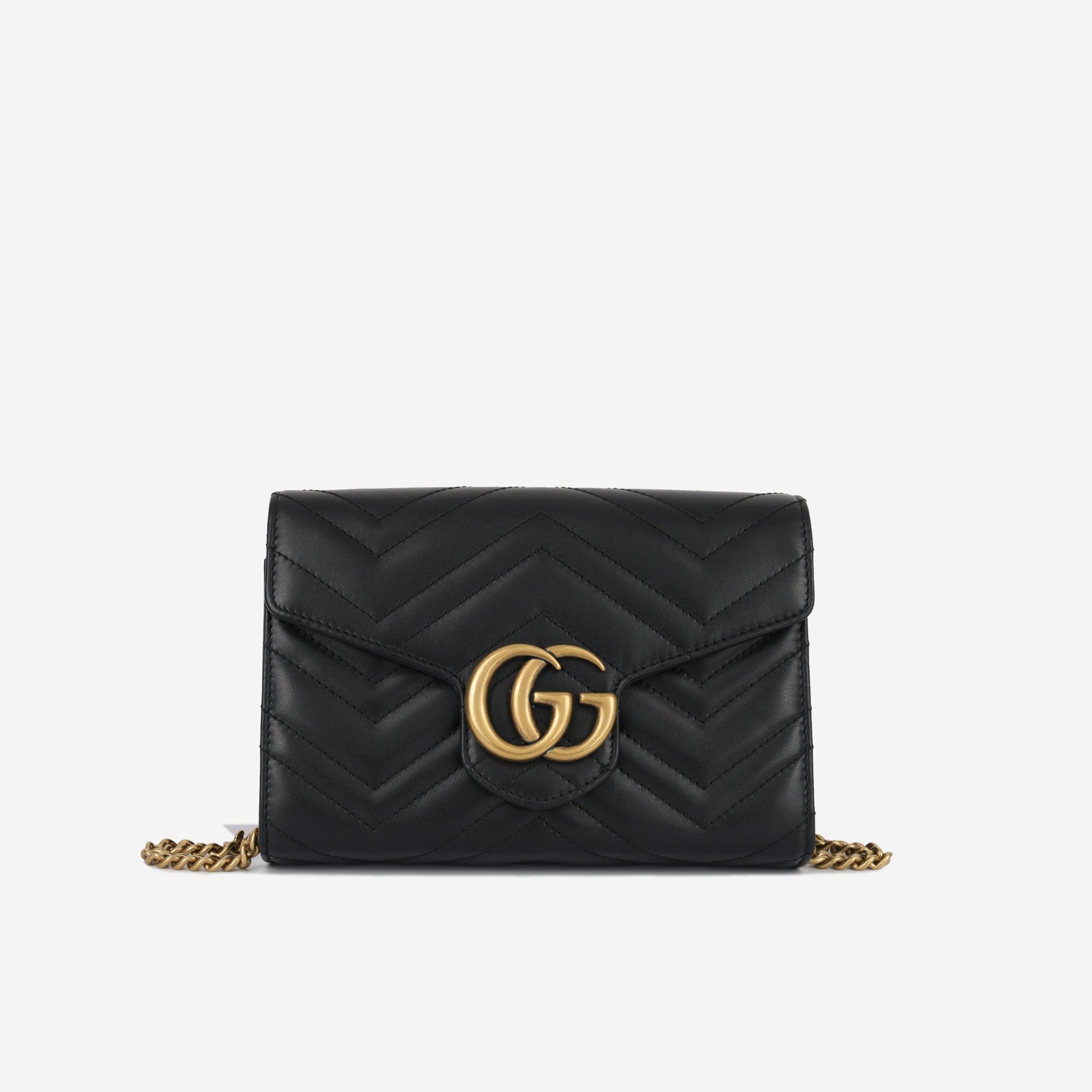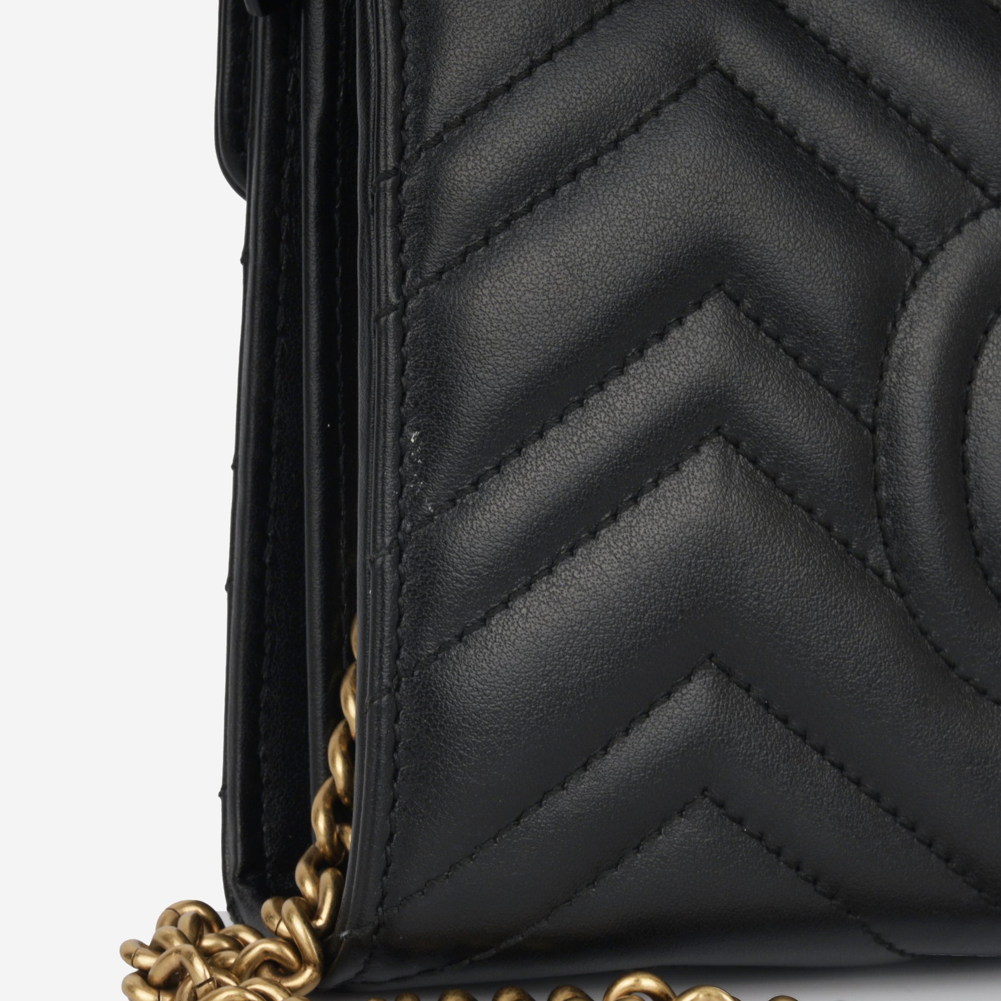 Introducing the Black GG Marmont Quilted Wallet on Chain: Where Style Meets Functionality. Immerse yourself in the world of elegance with this exquisite accessory. The iconic GG Marmont quilting, rendered in classic black, adds a touch of opulence to any ensemble. Transition seamlessly from day to night as this wallet on chain holds your essentials effortlessly. Elevate your look with the perfect blend of sophistication and convenience – the Black GG Marmont Quilted Wallet on Chain
