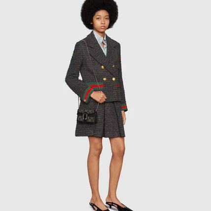 Reminiscent of an archival symbol, the textured tiger head spur is the Dionysus' defining feature. The feline appears throughout the universe, expressing the GUCCI House's fascination with the wild beauty of the natural world. Here, the antique silver-toned hardware is paired with a black and ivory GG denim jacquard.