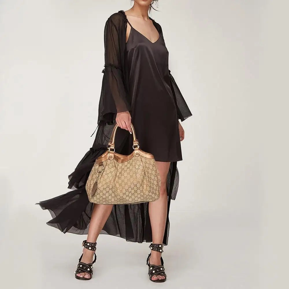 The Gucci GG Monogram Medium Sukey Tote Bag is a sophisticated and stylish accessory. It features the iconic GG monogram pattern, made from high-quality canvas material, and is accented with leather trimmings. This medium-sized tote bag has dual handles, making it a versatile choice for carrying your essentials. The interior of the bag is lined and has multiple compartments and pockets, offering ample storage space and organization. Whether used for work, travel, or everyday wear, the Gucci GG Monogram Medium Sukey Tote Bag is the perfect combination of fashion and function.