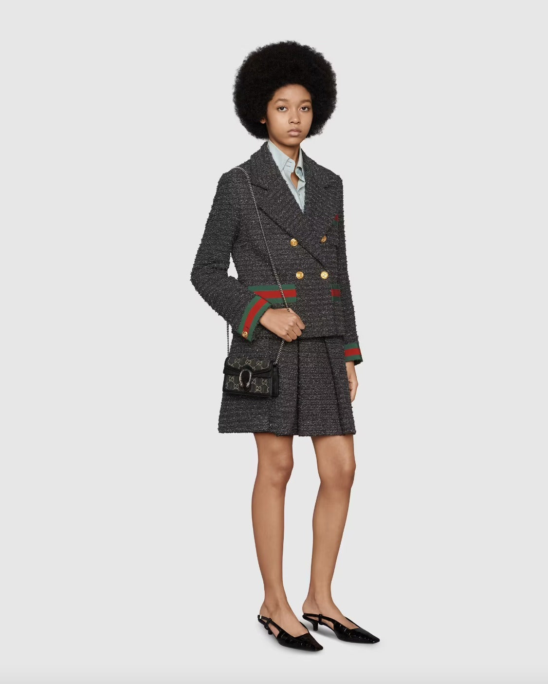 A structured GG Supreme canvas chain super mini shoulder bag with a key ring that can be used to attach this bag to a separate larger bag. The closure has the textured tiger head spur closure-a unique detail referencing the Greek god Dionysus, who in myth is said to have crossed the river Tigris on a tiger sent to him by Zeus. The accessory can also be worn as a crossbody bag.