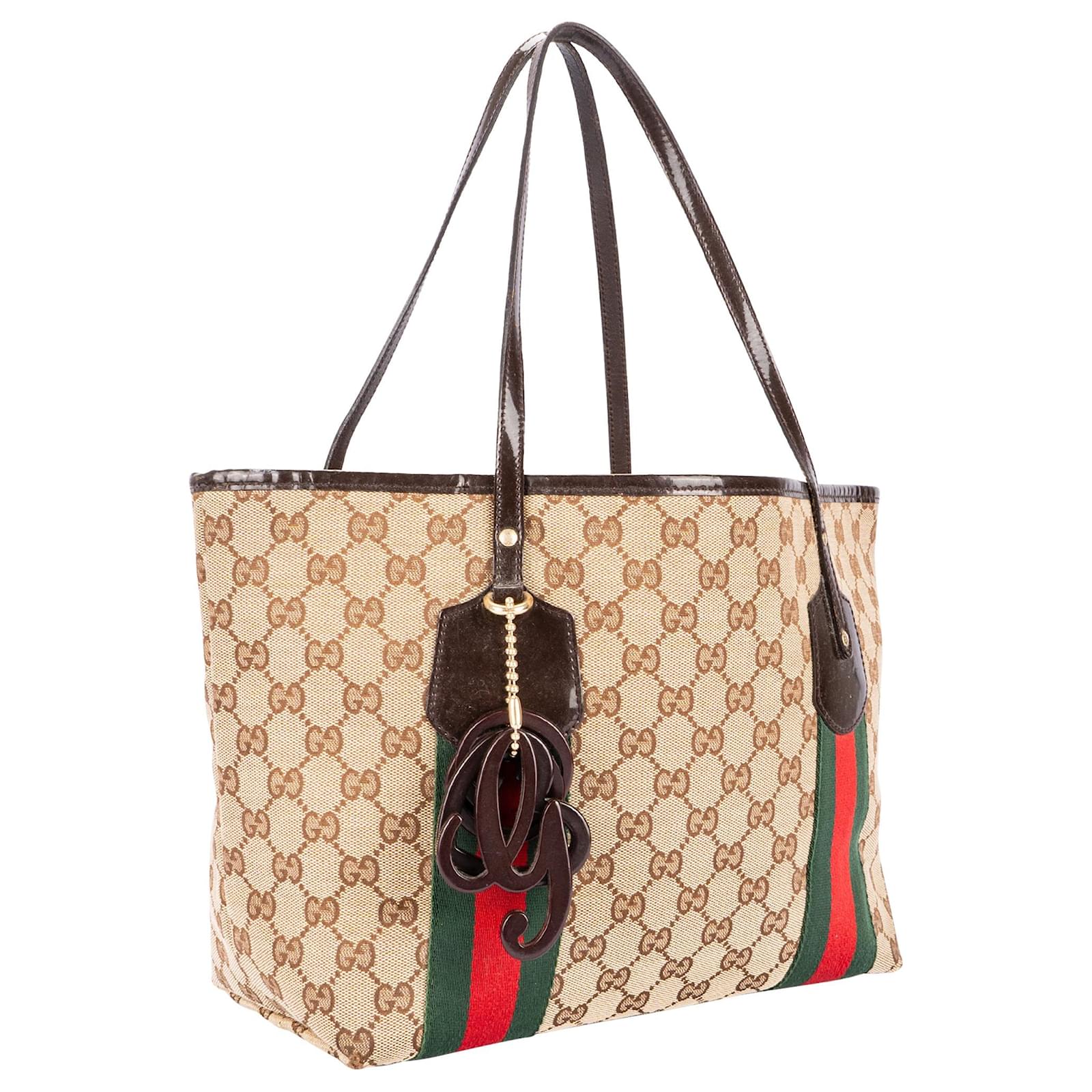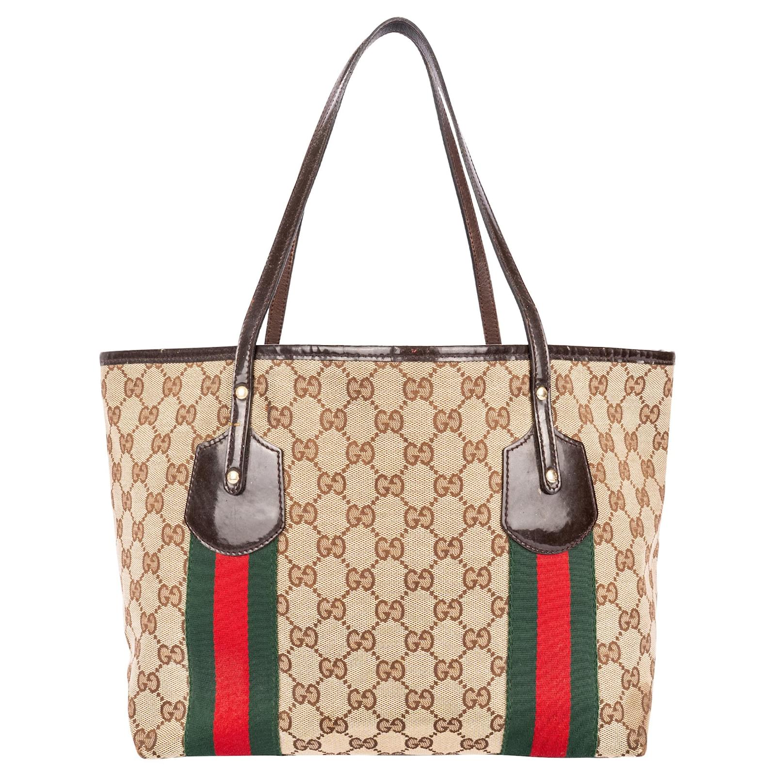 This Super Stylish Tote Bag is Crafted of Signature Brown on beige Gucci GG Monogram canvas with a classic Web red and green stripe.