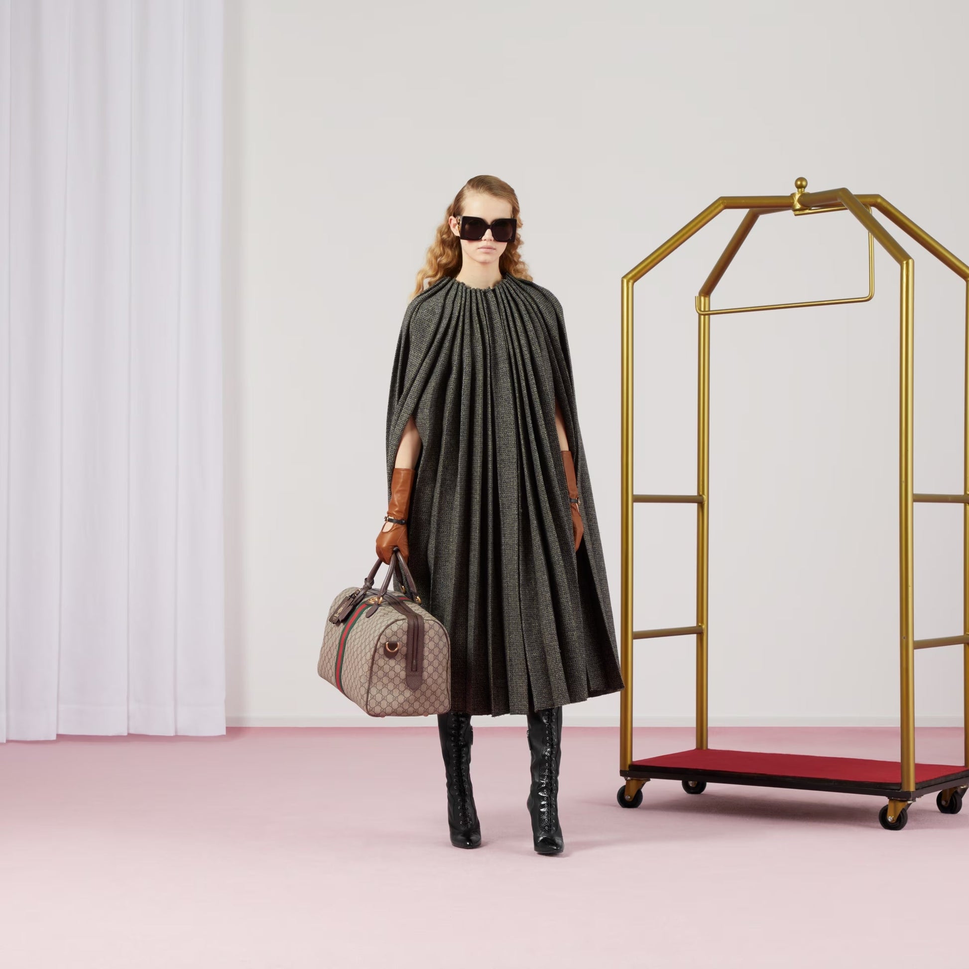 This Stylish Bag is crafted in soft GG Supreme canvas with inlaid green and red Web stripe. A contemporary take on a Gucci archival belt buckle from the '70s, the Double G is repurposed and appears atop a textured leather tab detail. The carry-on is completed with a detachable and adjustable strap, lock with key holder and luggage tag.