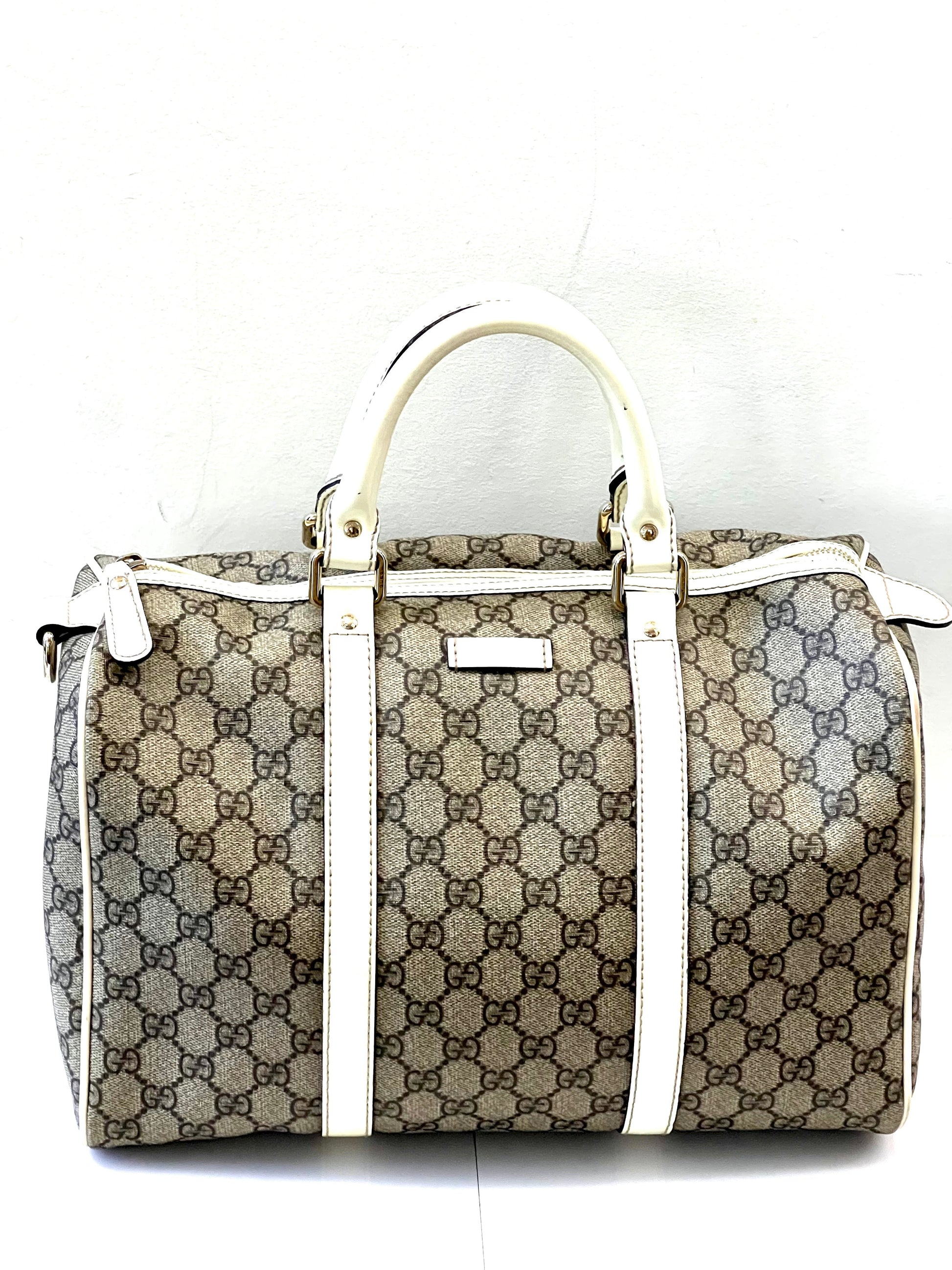 The Gucci Beige/White GG Coated Canvas Medium Joy Boston Bag is big enough for all that we need to carry. This sleek bag features durable beige GG coated canvas with white patent leather trim. A sophisticated bag for everyday wear.
