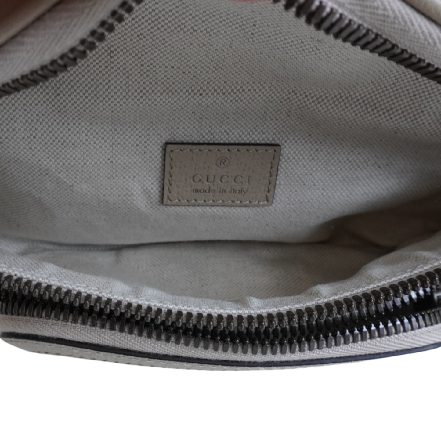 Gucci 'GG Supreme' belt bag in cream and beige monogram coated canvas with beige leather accents and aged gold hardware. Features two front zip pockets and a back zip pocket with cream canvas lining. Can be worn around the waist or crossbody with the adjustable red-green racing stripe belt.