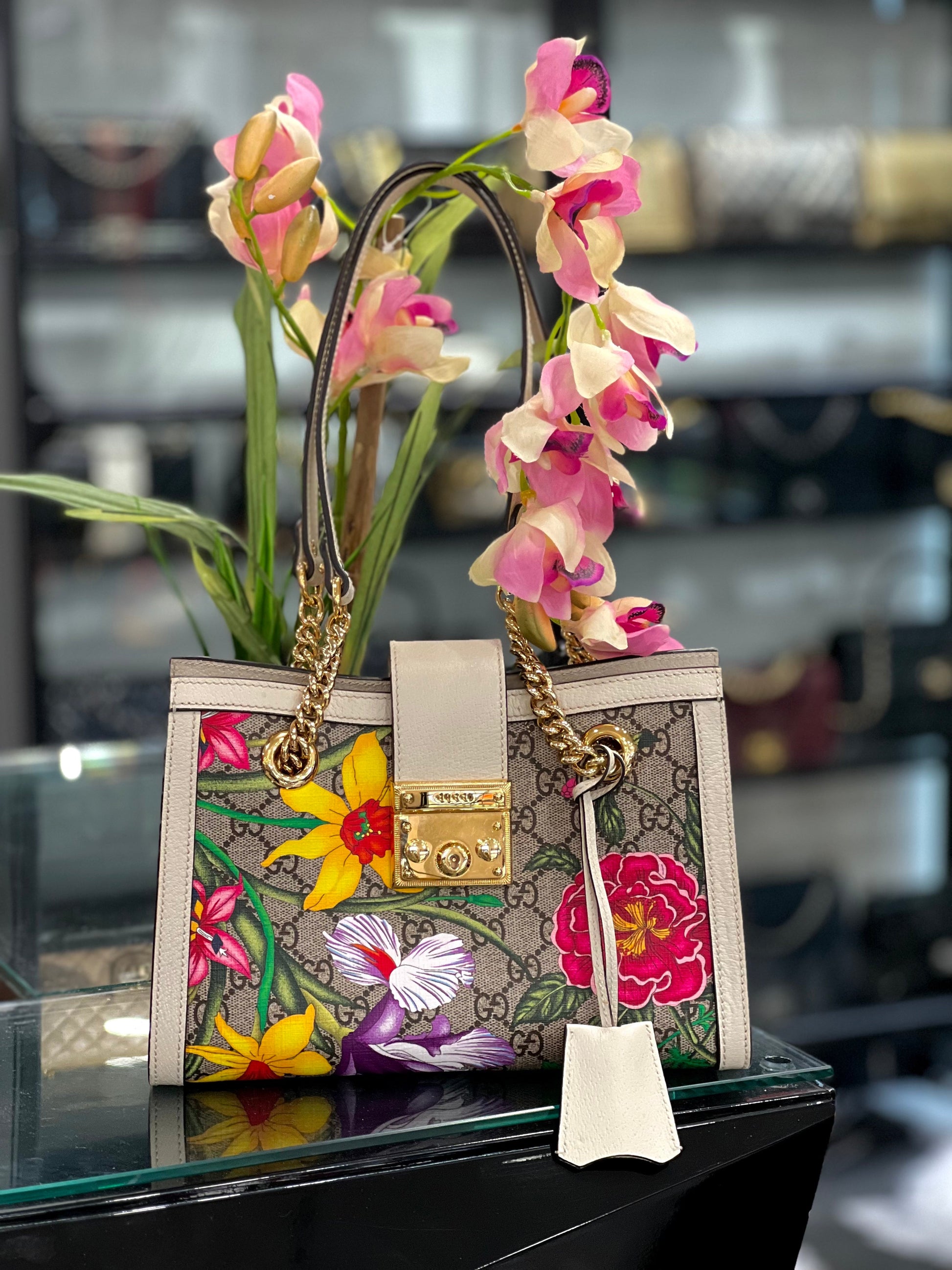 GUCCI GG SUPREME FLORA PADLOCK CHAIN SMALL TOTE BAG
