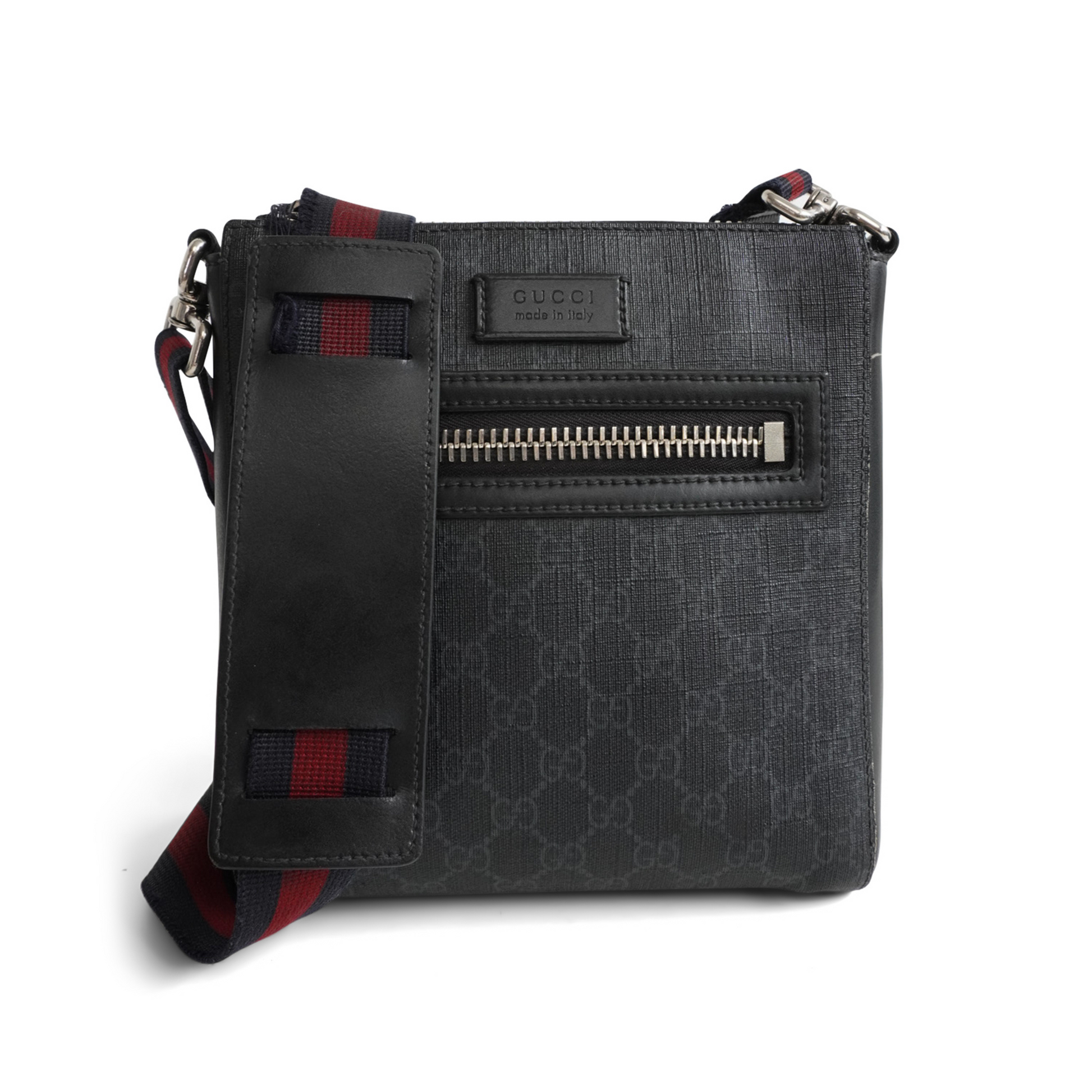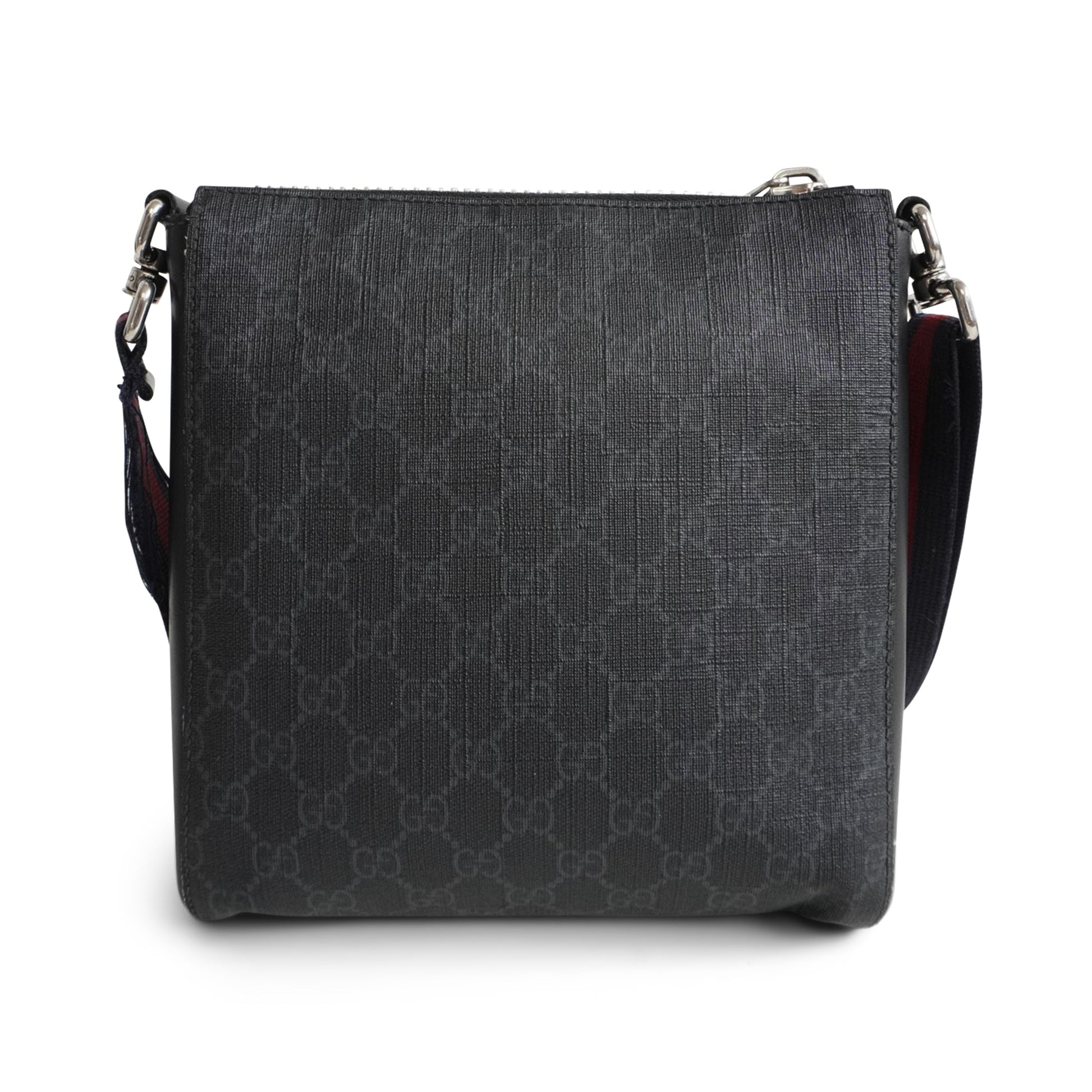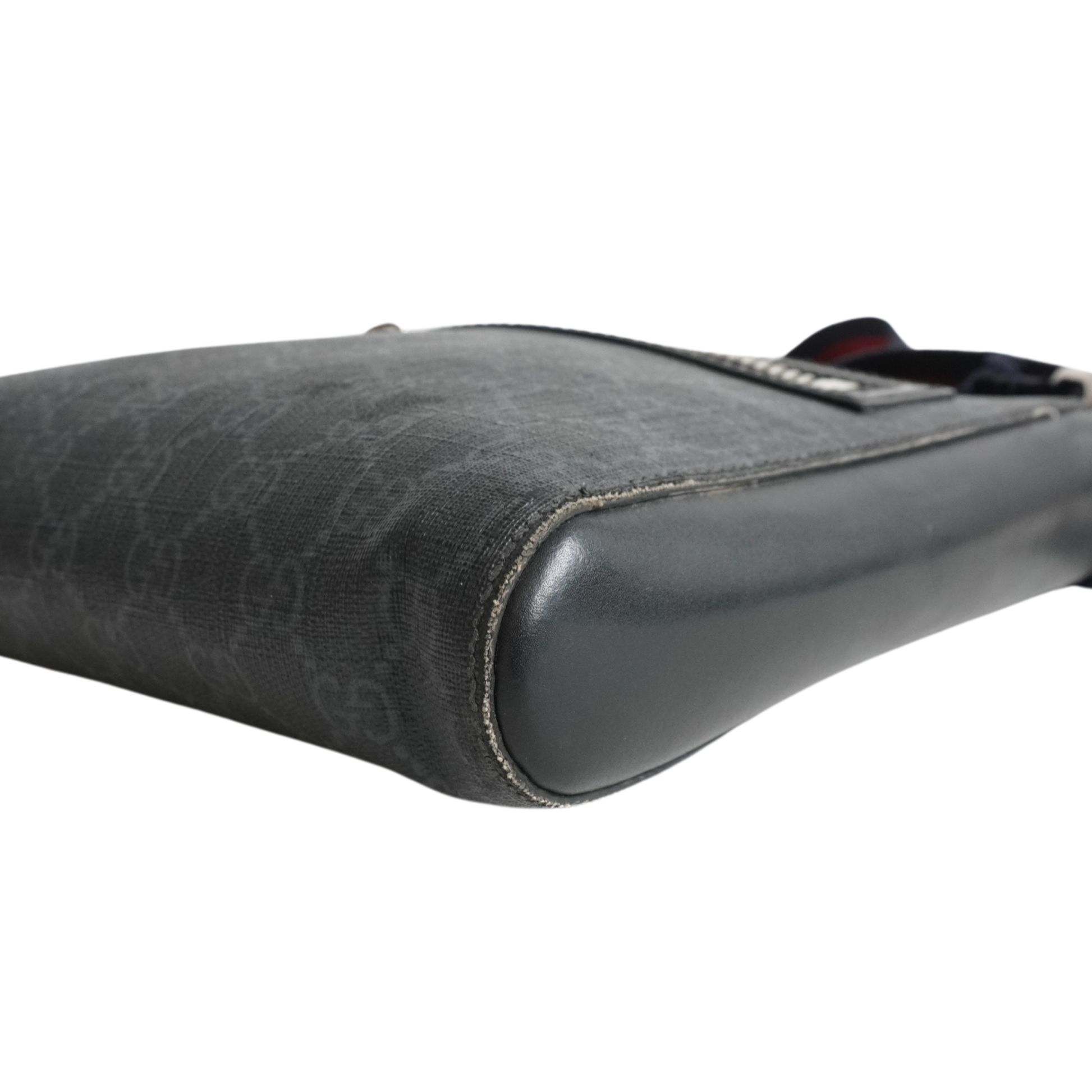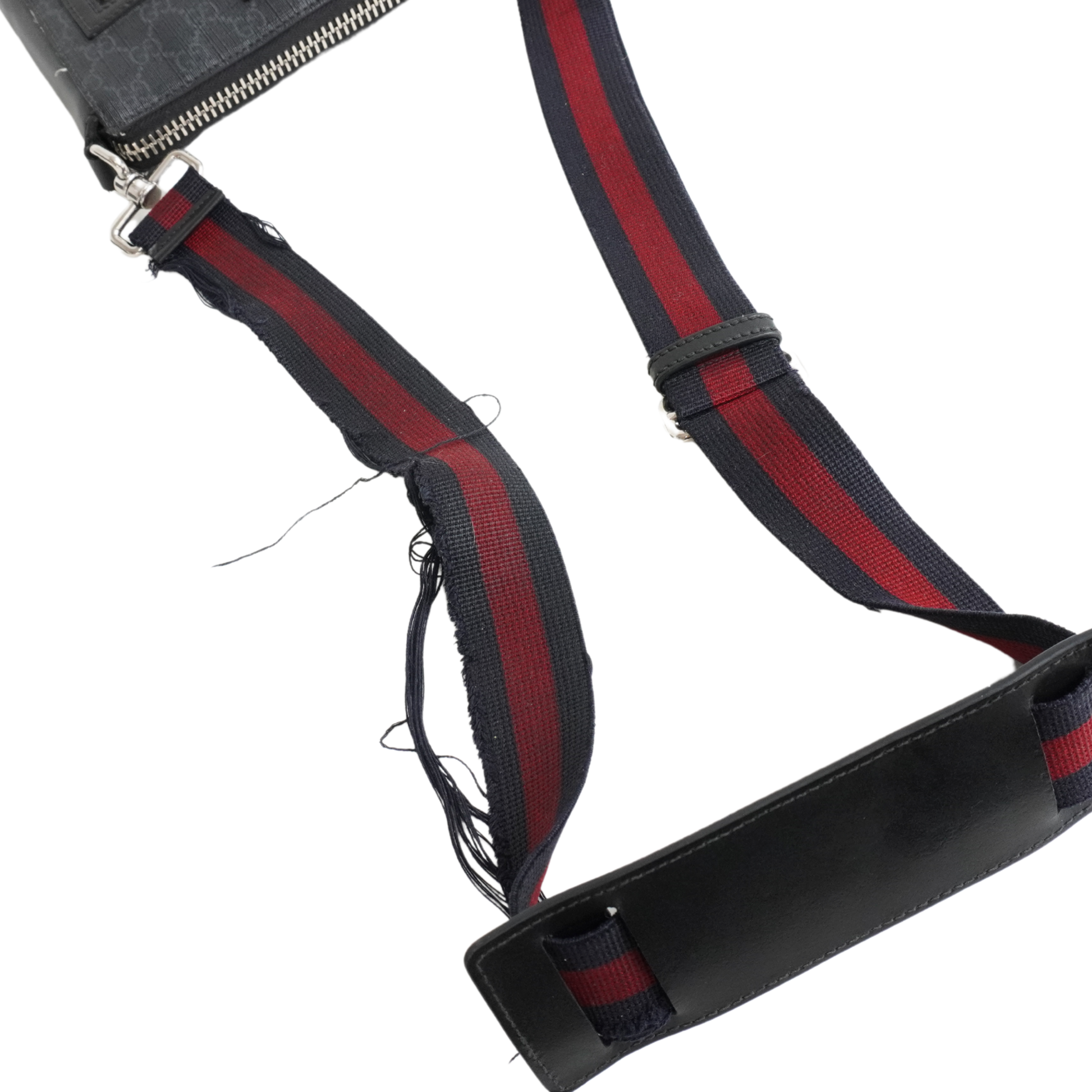 Gucci 'GG Supreme' messenger bag in black and grey monogram printed coated canvas with black leather trim, a front zip pocket in silver hardware and an adjustable red and navy canvas racing stripe crossbody strap. The bag has a top-zip opening in silver hardware revealing a black canvas interior lining with a zip pocket.