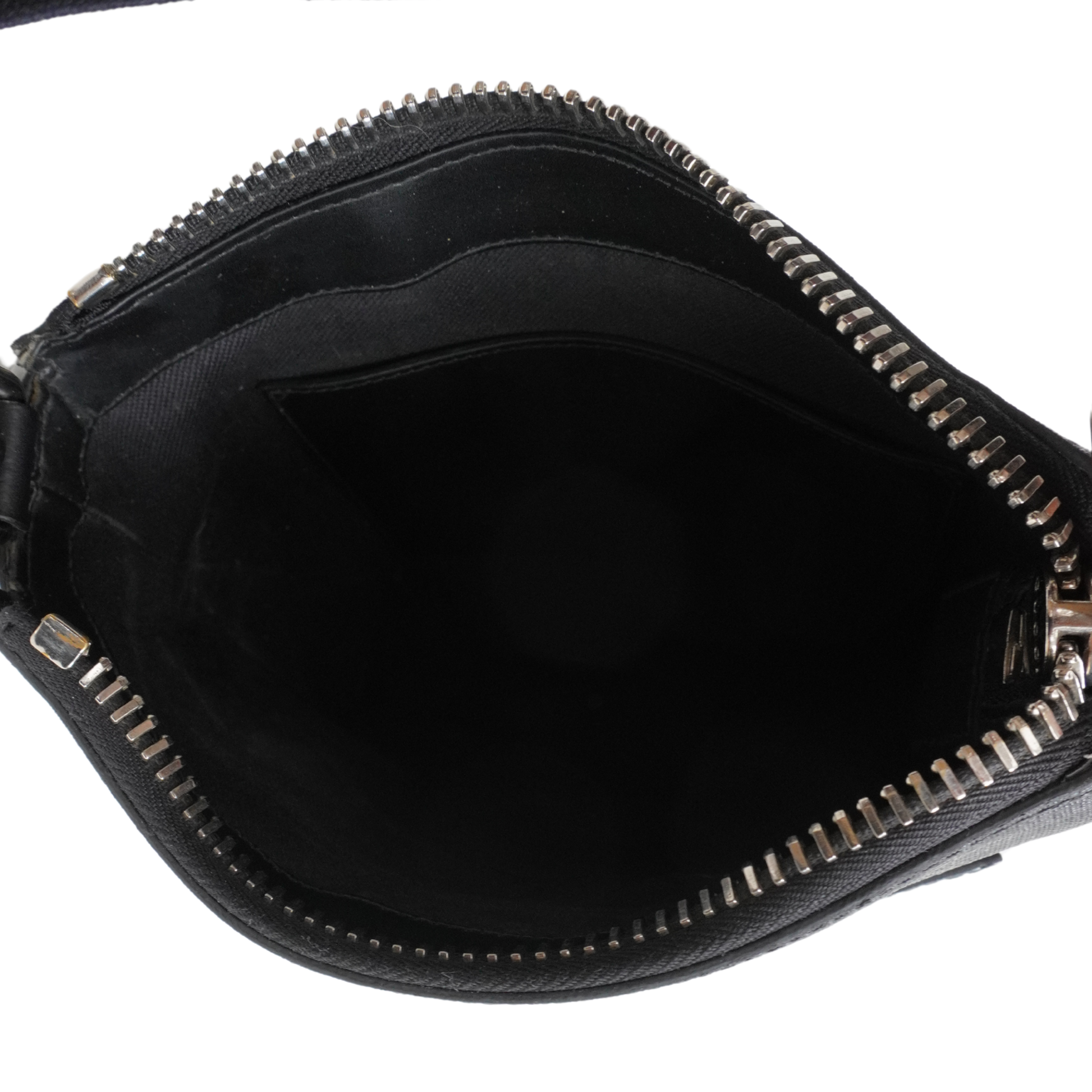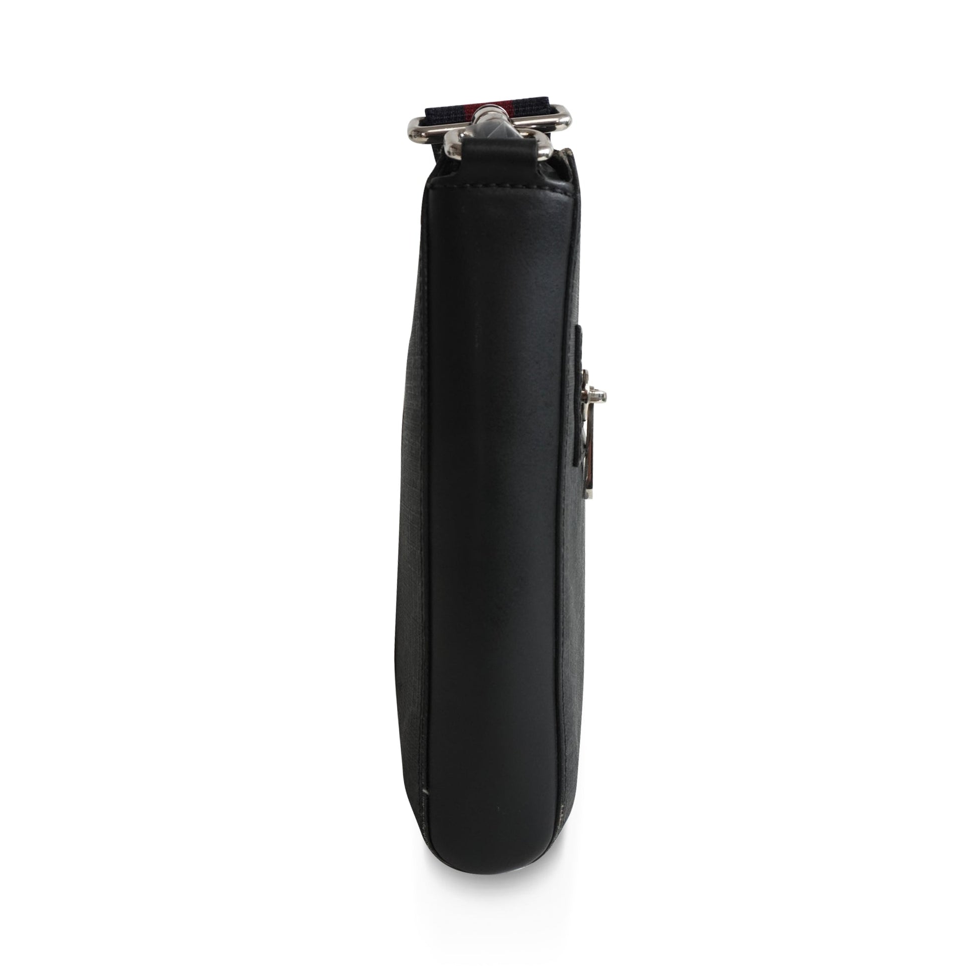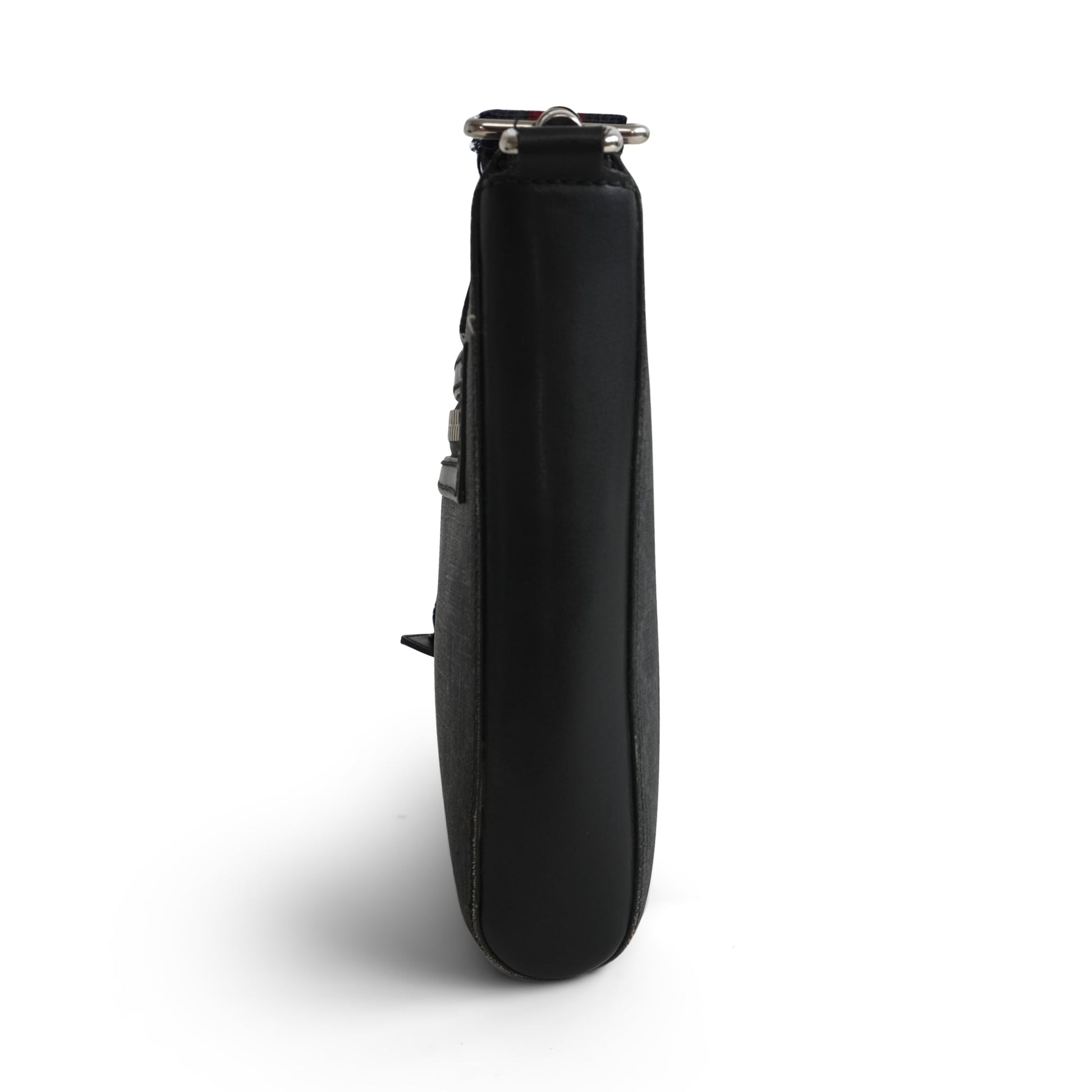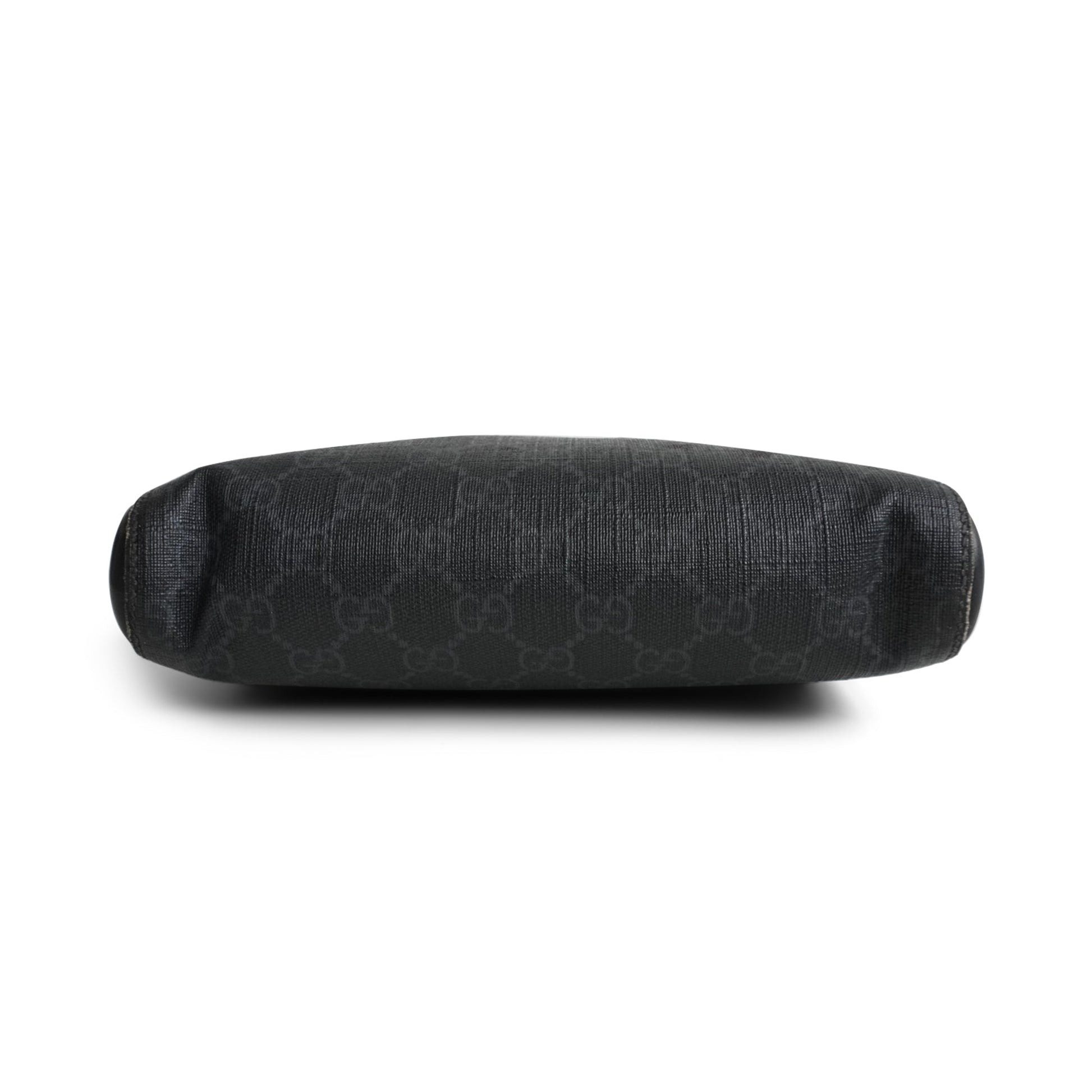 Gucci 'GG Supreme' messenger bag in black and grey monogram printed coated canvas with black leather trim, a front zip pocket in silver hardware and an adjustable red and navy canvas racing stripe crossbody strap. The bag has a top-zip opening in silver hardware revealing a black canvas interior lining with a zip pocket.