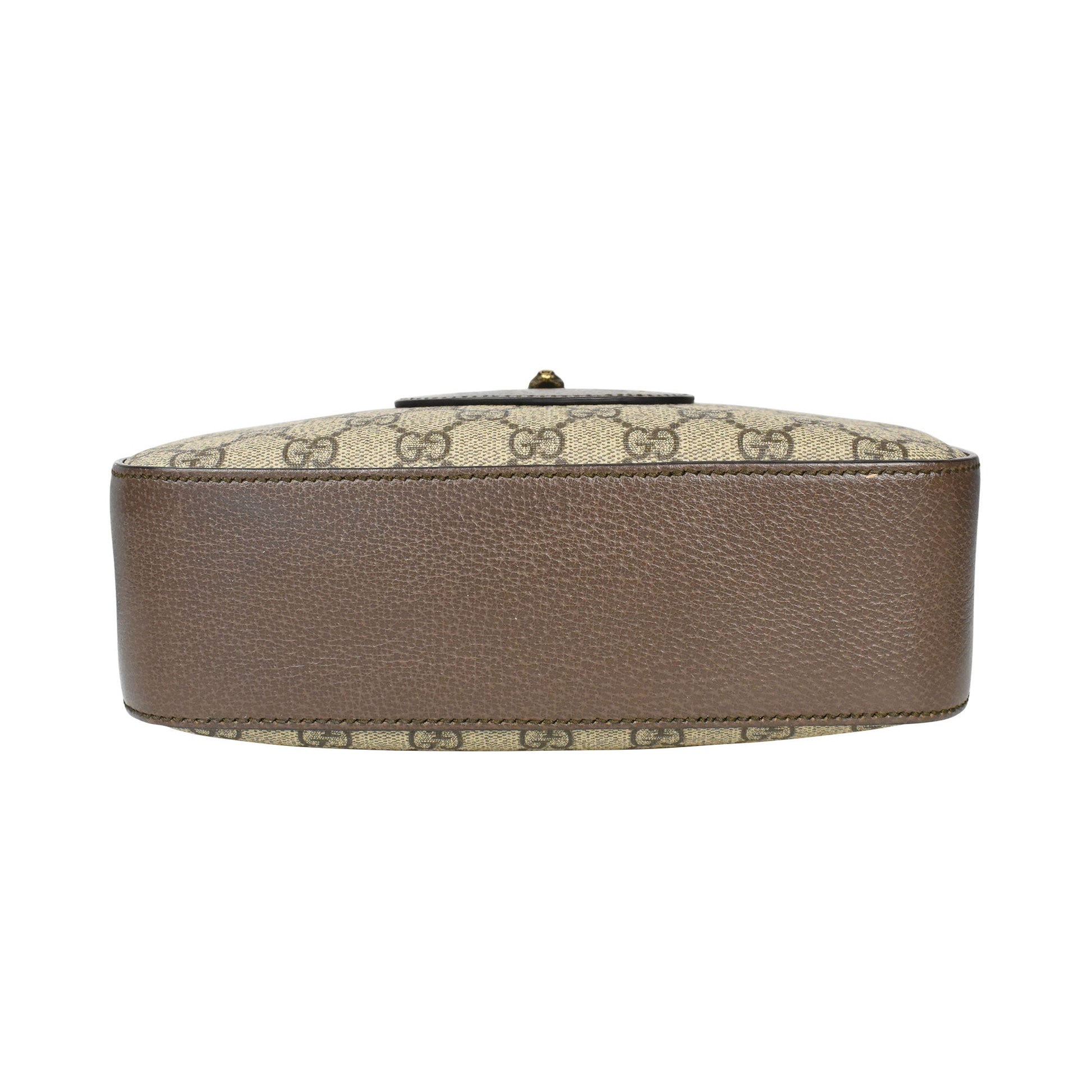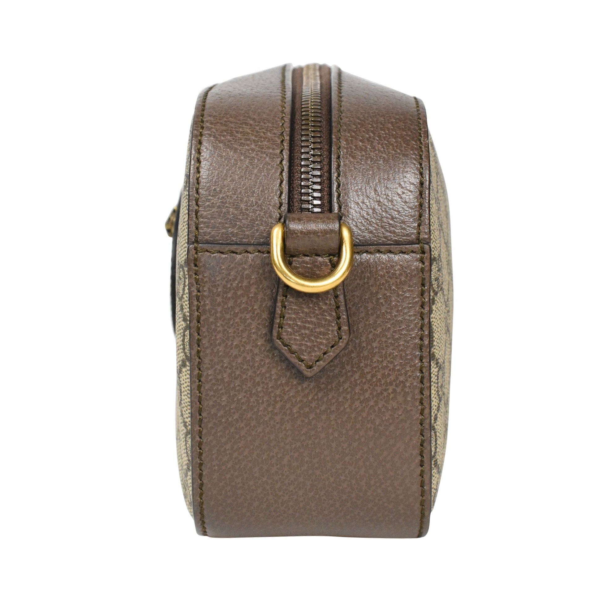Gucci 'GG Supreme Neo Vintage' camera bag in beige and brown 'GG' monogram coated canvas with brown leather sides. Features a removable red and green racing stripe canvas crossbody strap with gold hardware clamps, brown leather logo patch on the front with gold foil logo and gold hardware tiger head, and a zip closure with a yellow leather zipper pull. The interior is cream and pink floral patterned lined with a slip pocket.