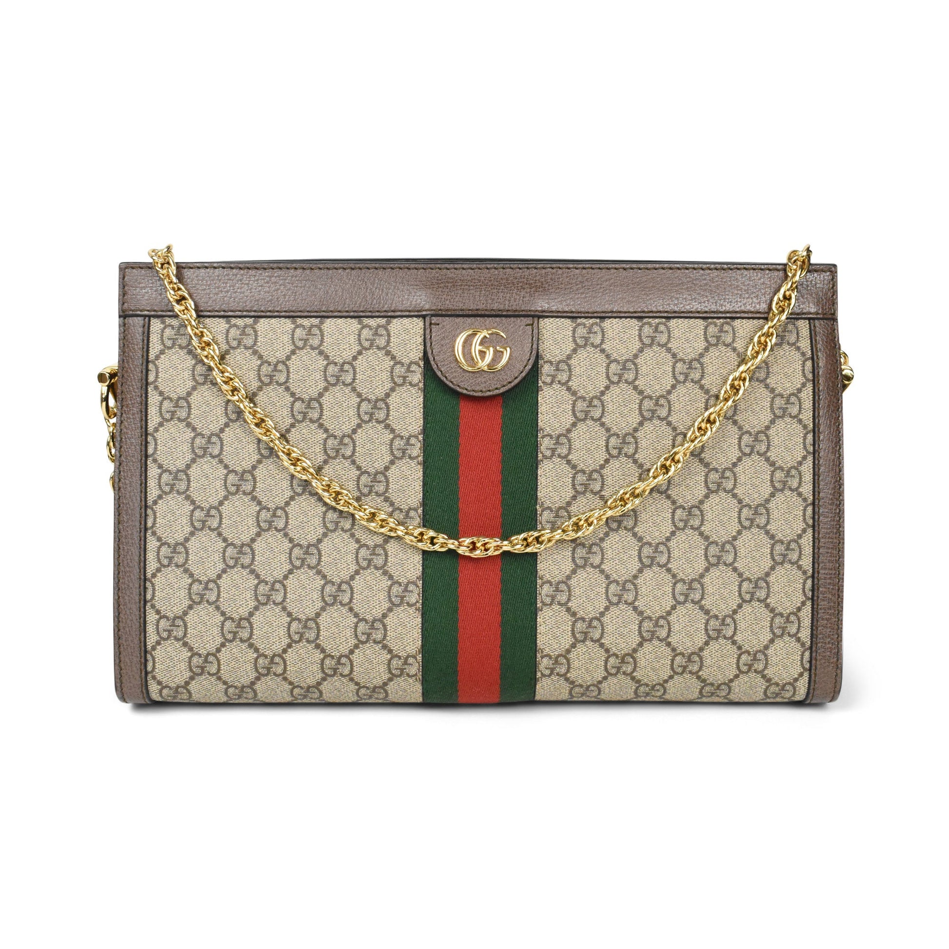 Gucci 'GG Supreme Ophidia' shoulder bag in brown logo monogram coated canvas. Features brown leather trim, a green and red canvas racing stripe down the centre, 'GG' gold hardware logo on the front, gold hardware chain strap, and a magnetic closure. The interior is blue satin lined with 2 main compartments, a zip pocket, and a slip pocket.