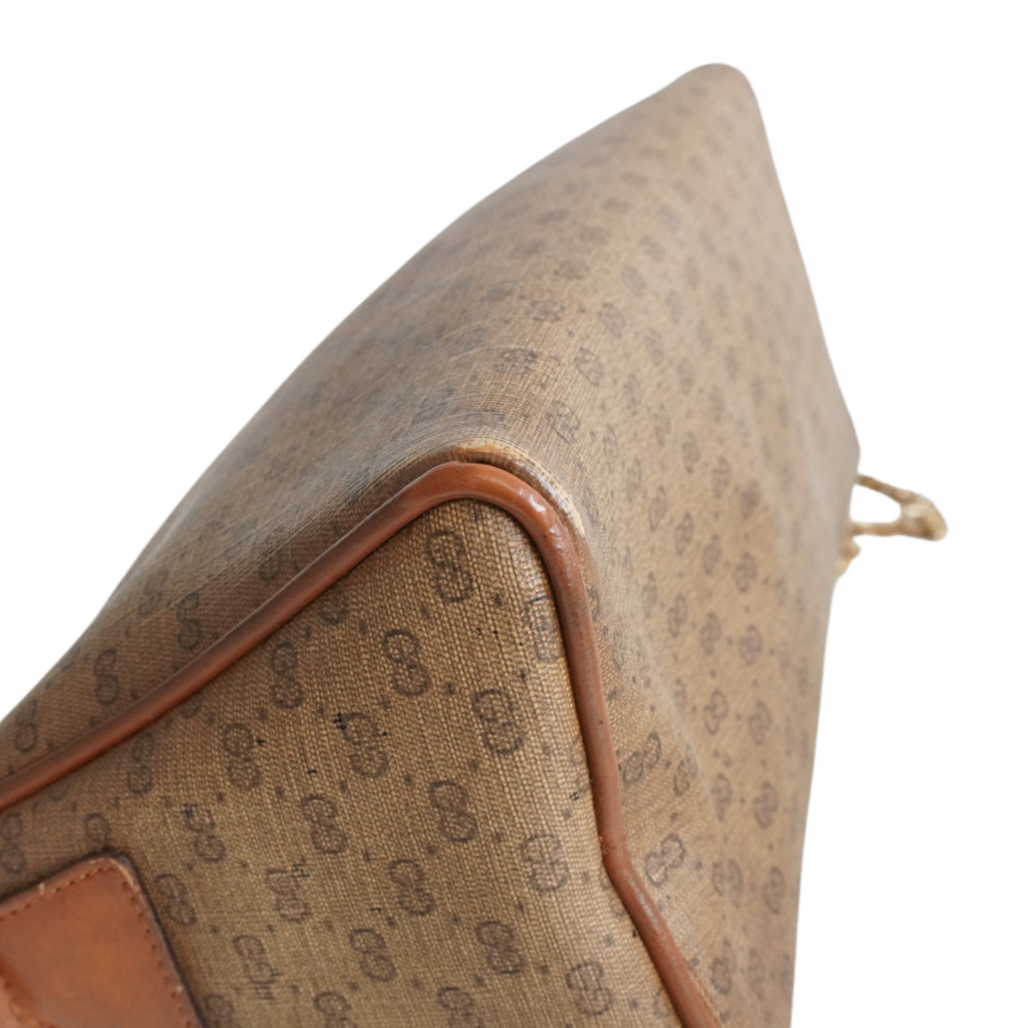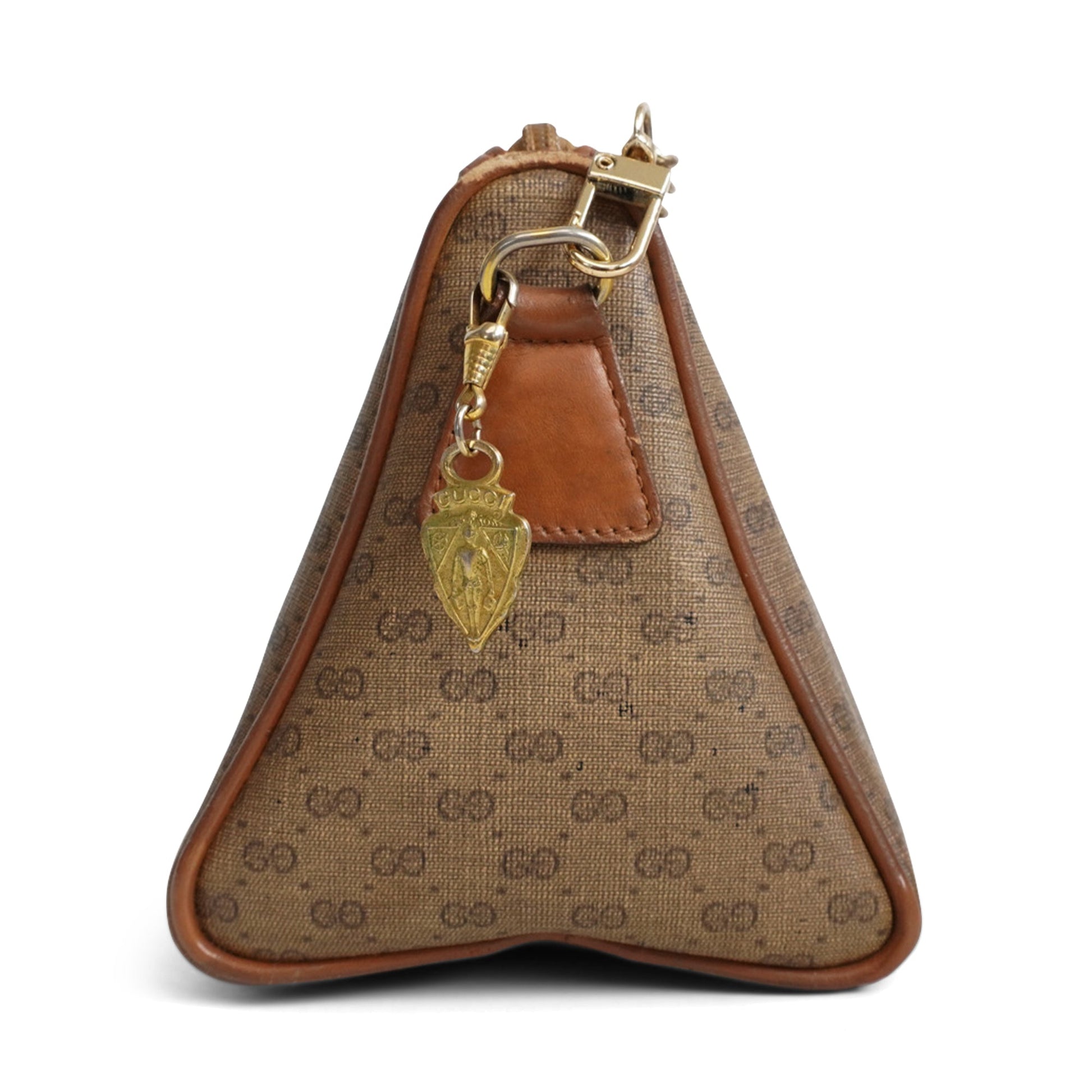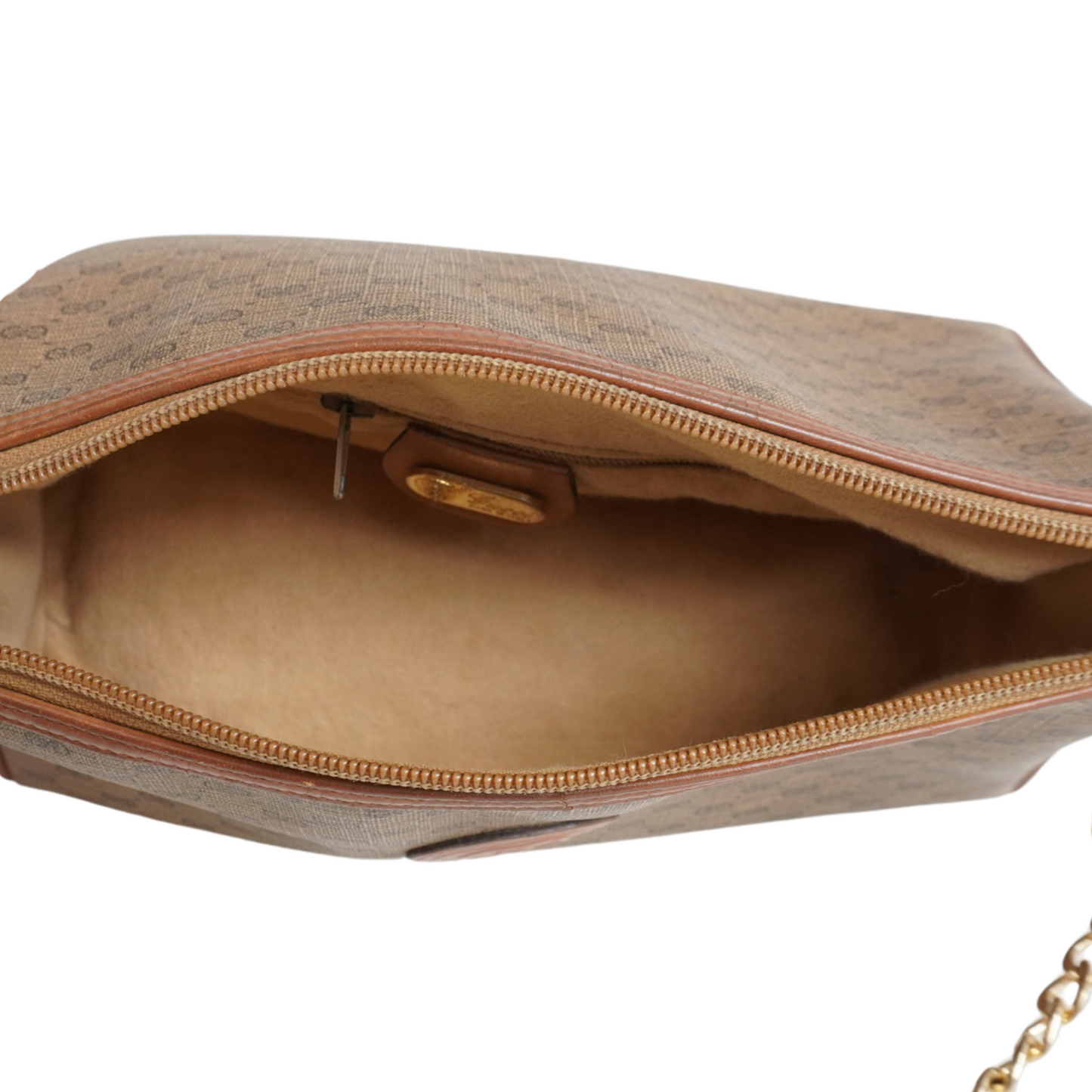 Gucci 'GG Supreme' pouch bag in camel coated canvas with a micro GG monogram print with a brown leather logo on the front and dark brown leather trim. Interior features on slip zipper pocket and beige felt lining.