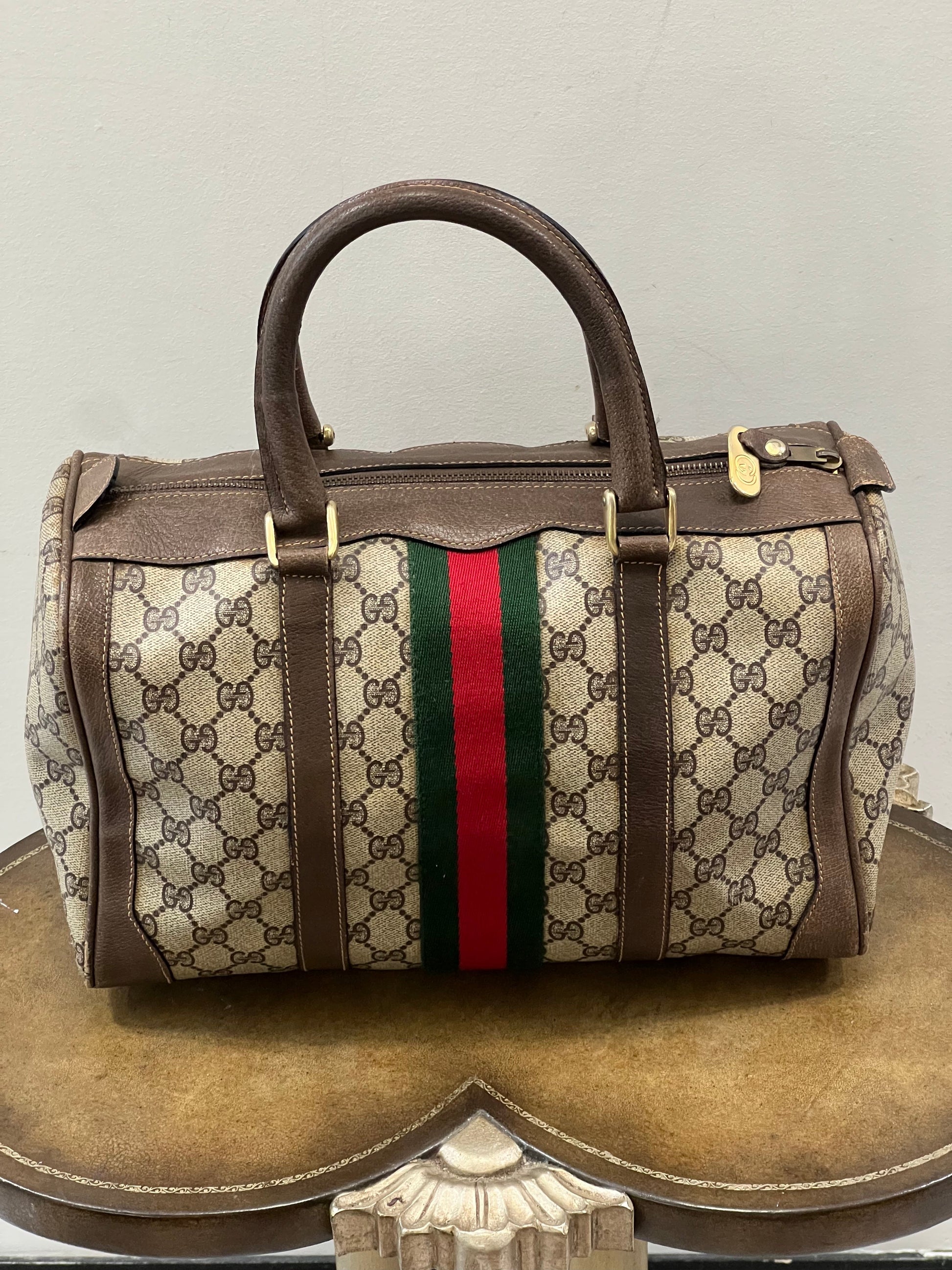 Gucci Web Stripe Boston Bag. This bag is in GG supreme canvas and brown leather with a signature web accent and gold hardware. It features a top zip closure, two rolled leather top handles, GG logo on front, and a suede interior.