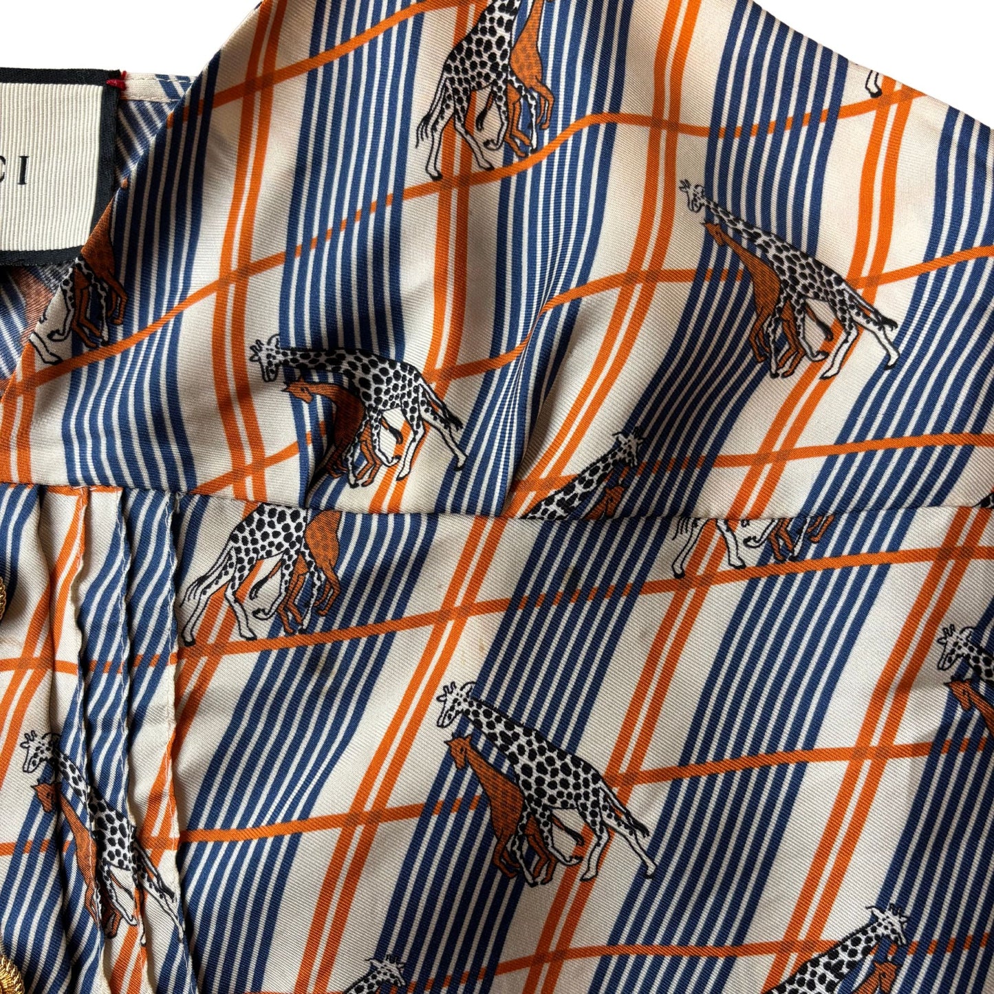 Gucci cream silk camisole with orange and blue striped and giraffe motif throughout. Features decorative gold GG buttons down the front.