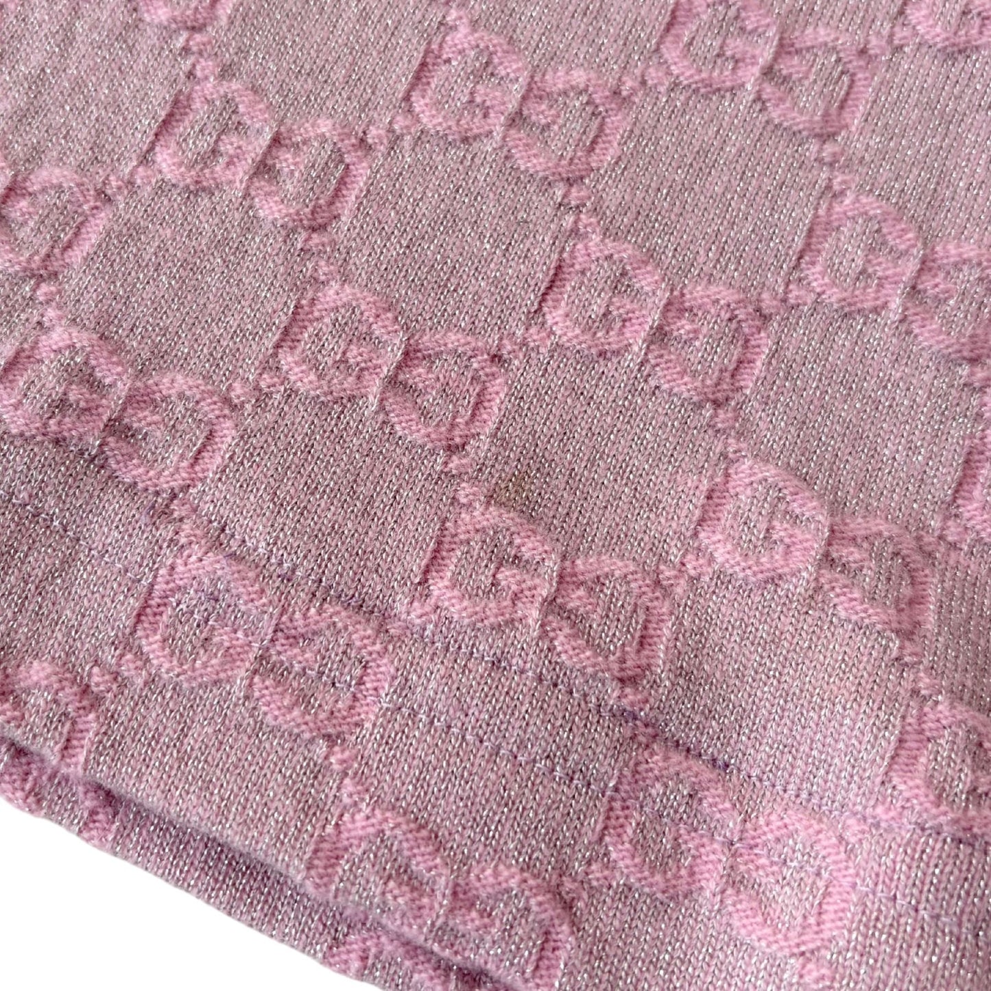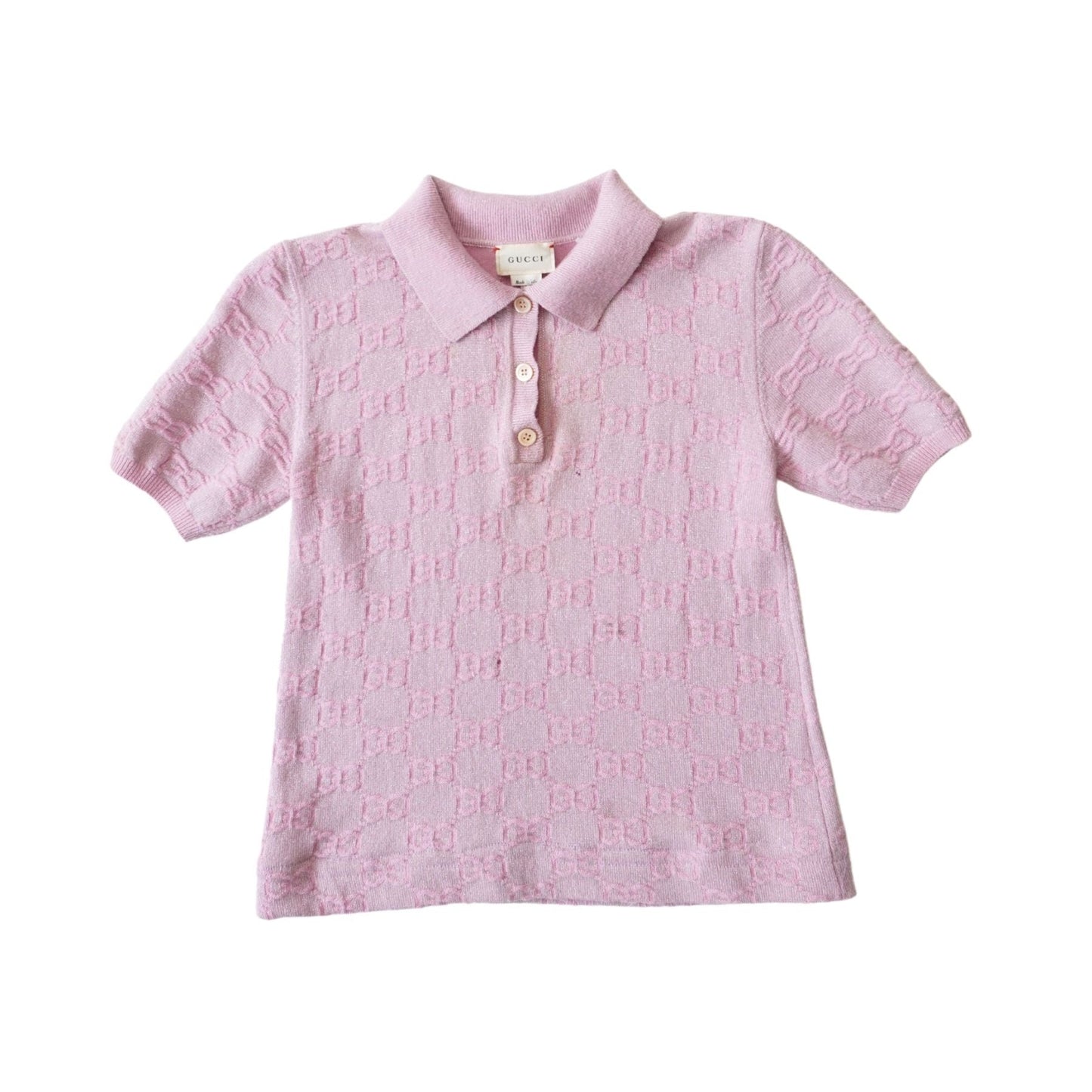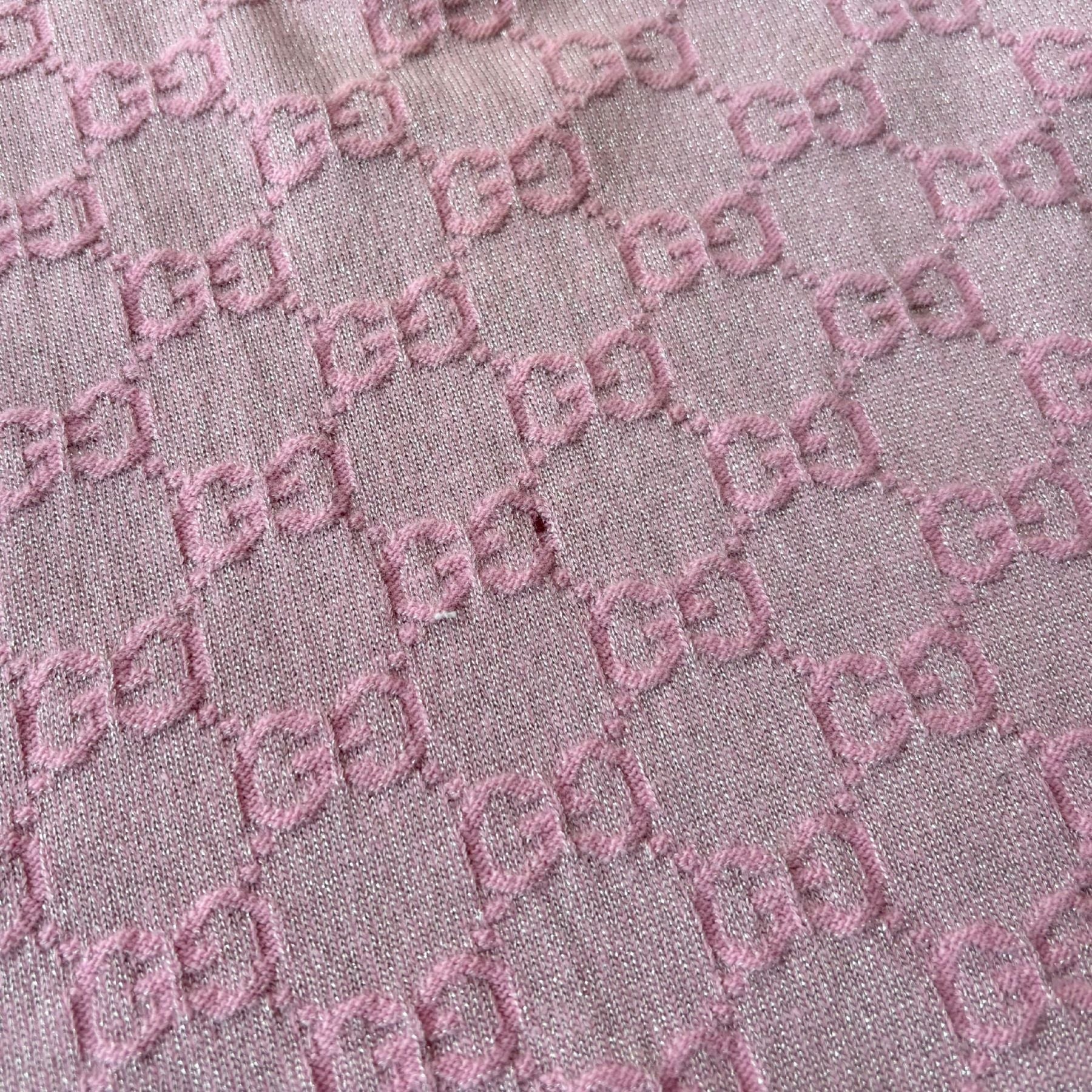 Gucci re-worked polo shirt in pink metallic knit with an all-over 'GG' guccissima print, beige buttons, and a collar. This top was re-worked from a dress.