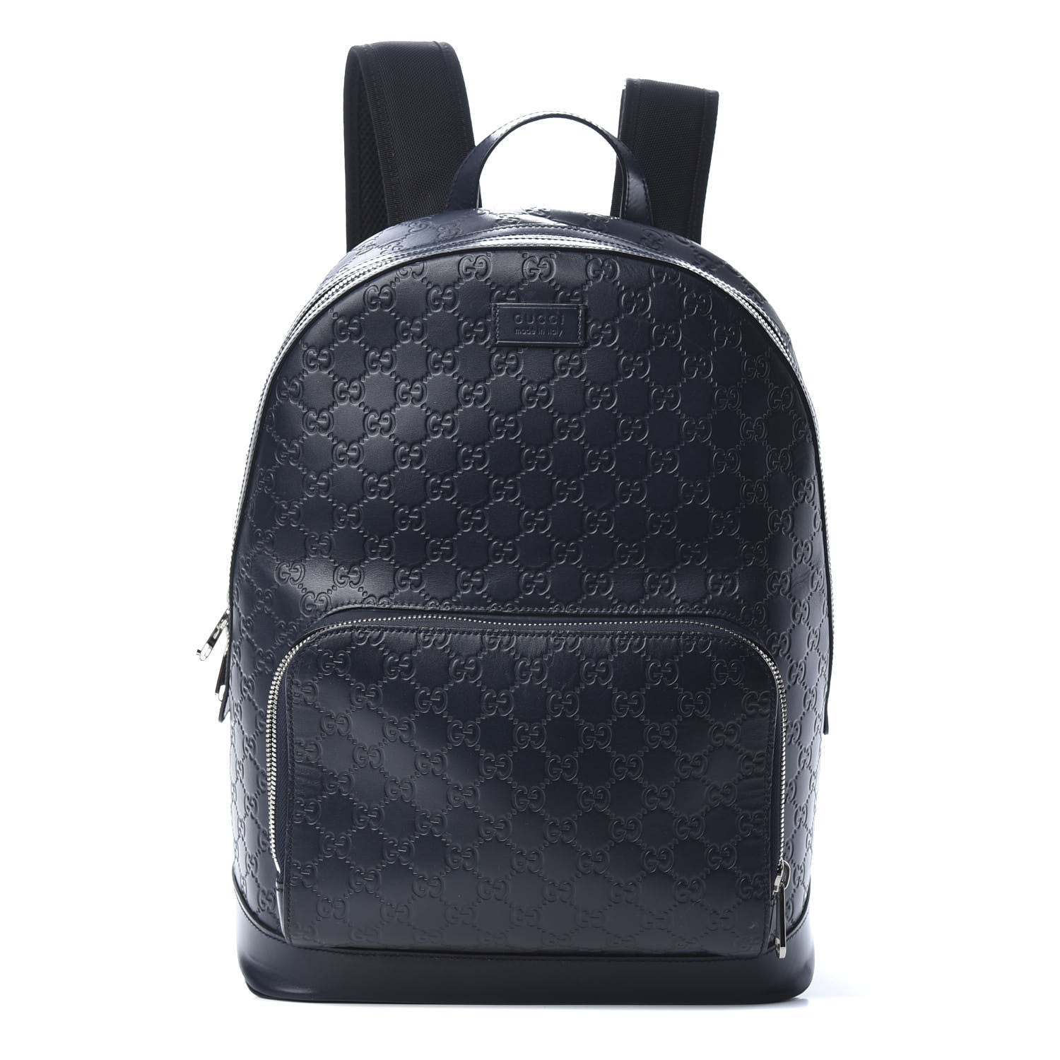This stylish backpack is crafted of Gucci Guccissima embossed leather in navy blue. The bag features an external zipper pocket, a smooth navy blue leather top handle, and adjustable black nylon shoulder straps. The polished silver wrap-around zippers open the bag to a taupe microfiber interior with patch pockets, and a padded compartment suitable for an iPad, tablet, or laptop.