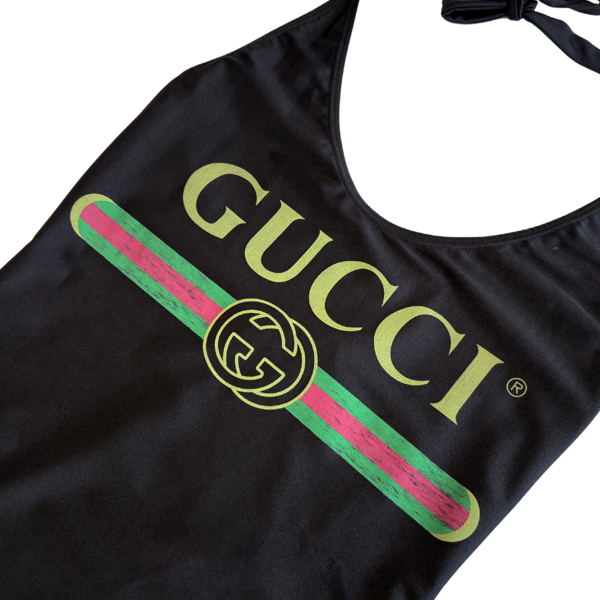 Gucci one piece swimsuit in black nylon with adjustable straps and a large logo and racing stripe graphic on the chest.