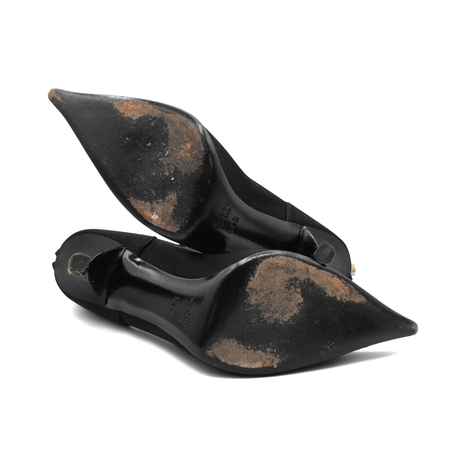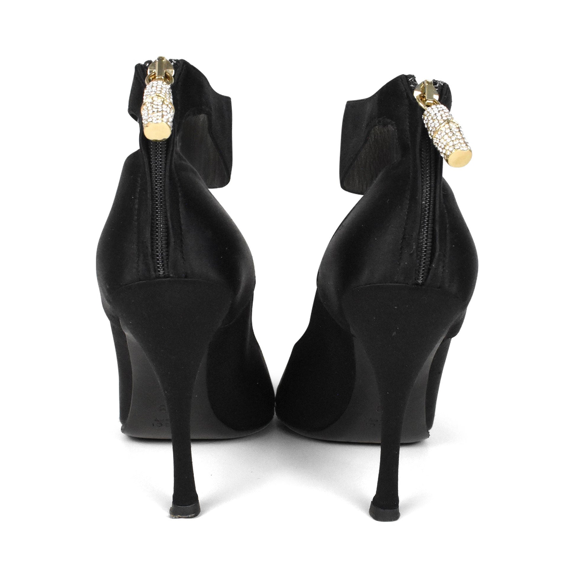 Gucci by Tom Ford pumps in black satin with a mary jane ankle strap, a back zip opening with a large gold rhinestone encrusted pull tab, and a pointed toe.