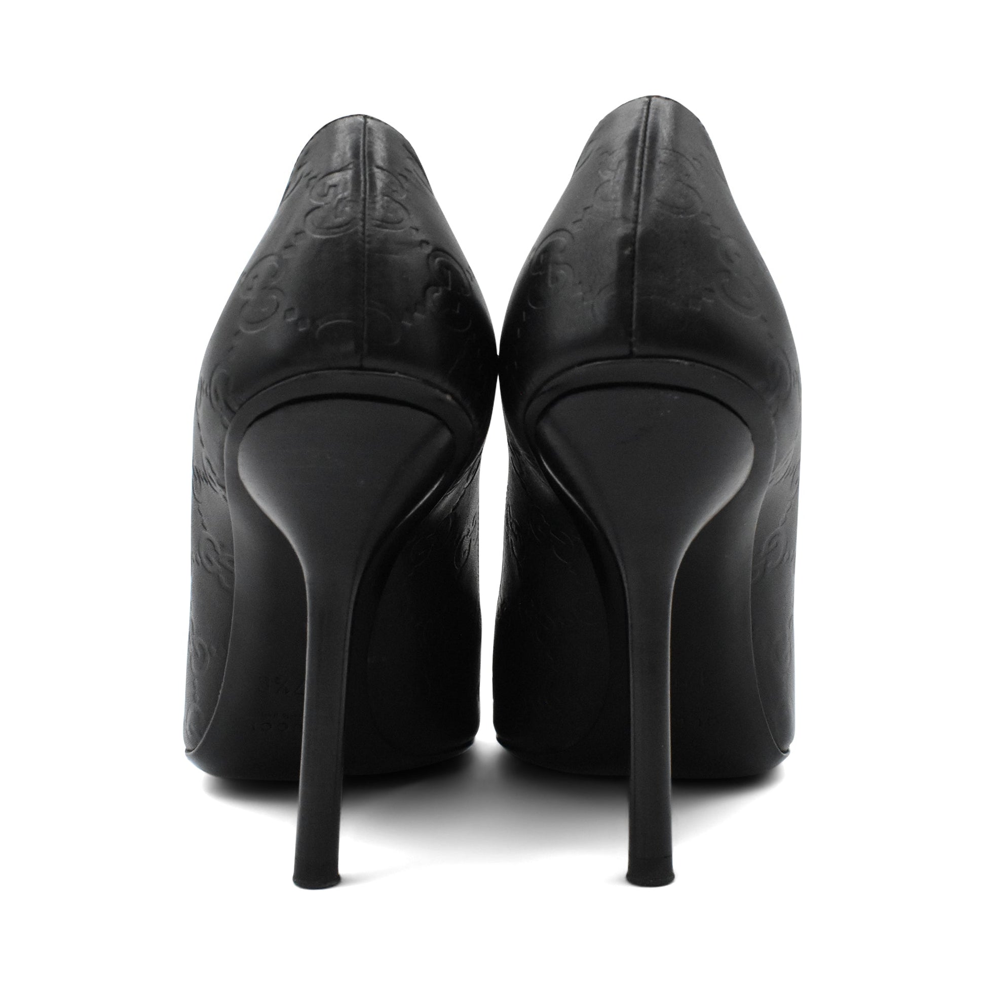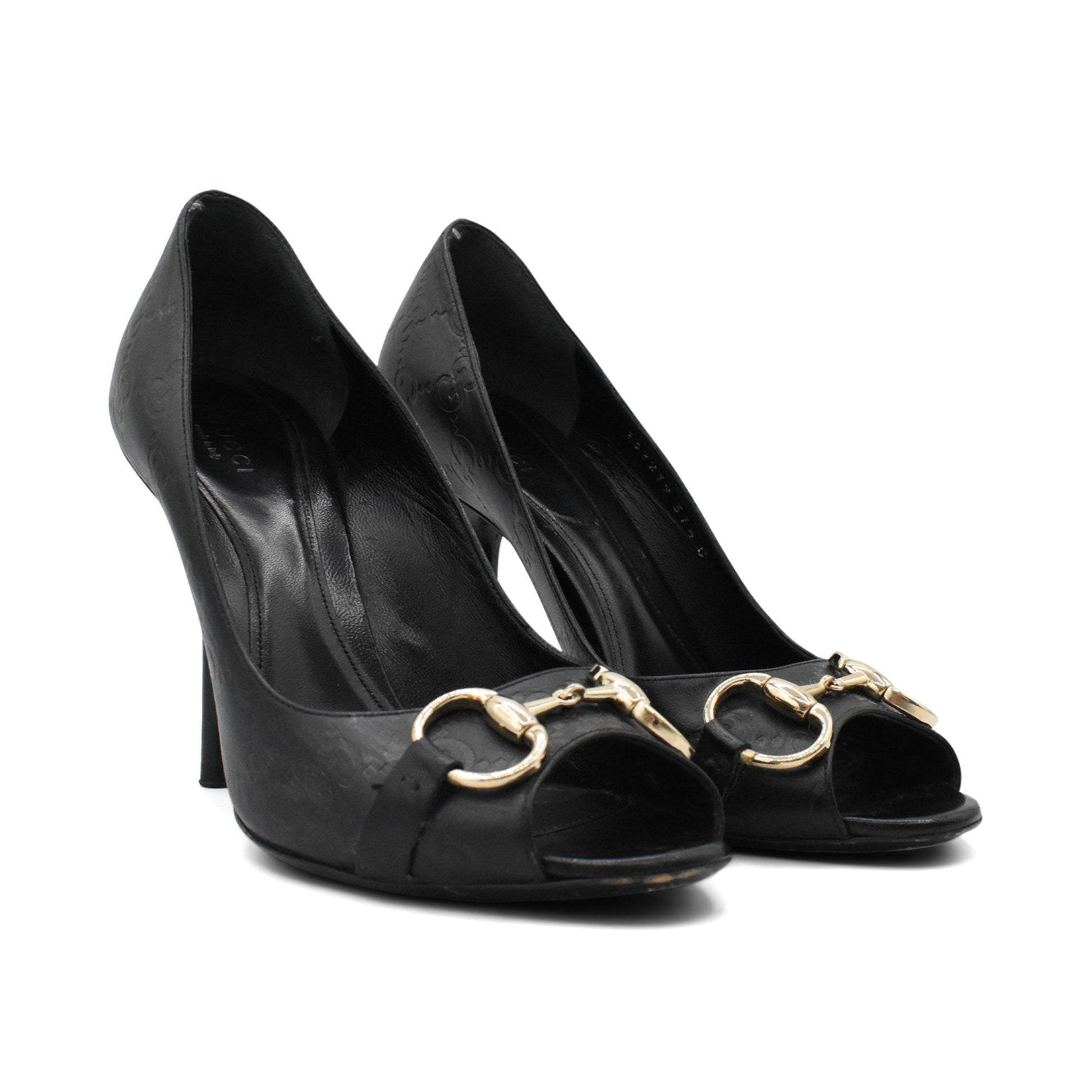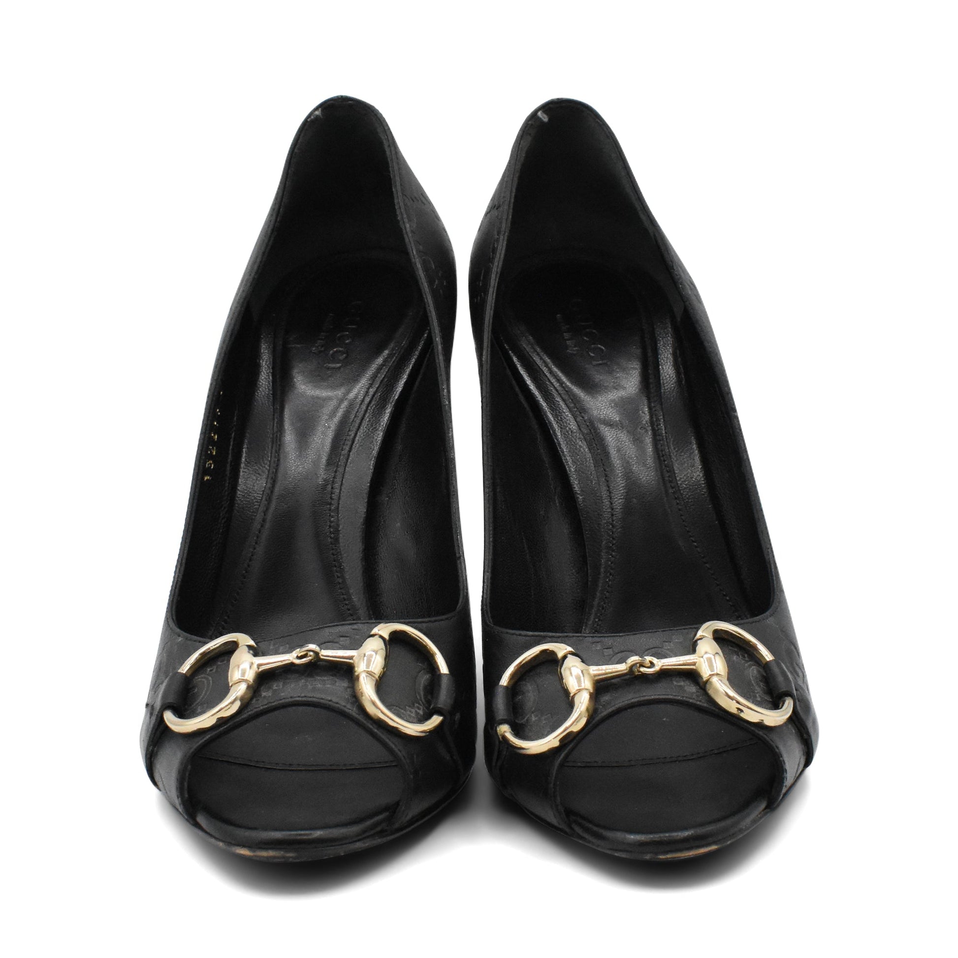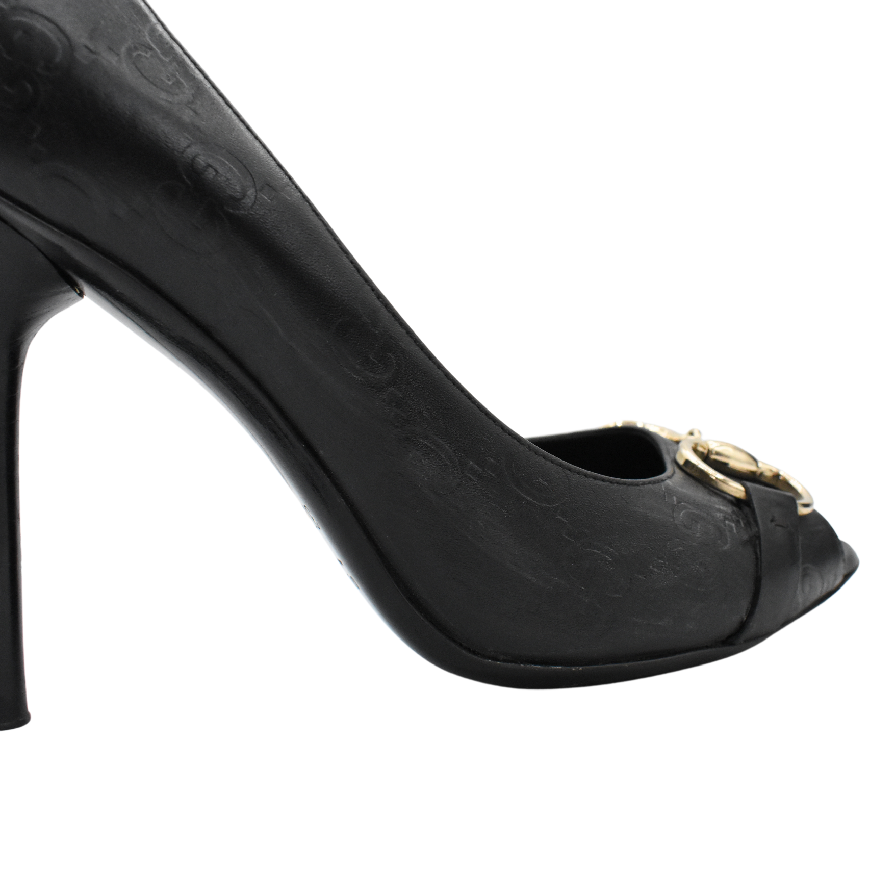 Gucci 'Horsebit' pumps in black leather with all-over 'GG' monogram embossing, a peep-toe, and a soft gold horsebit buckle on the toe.