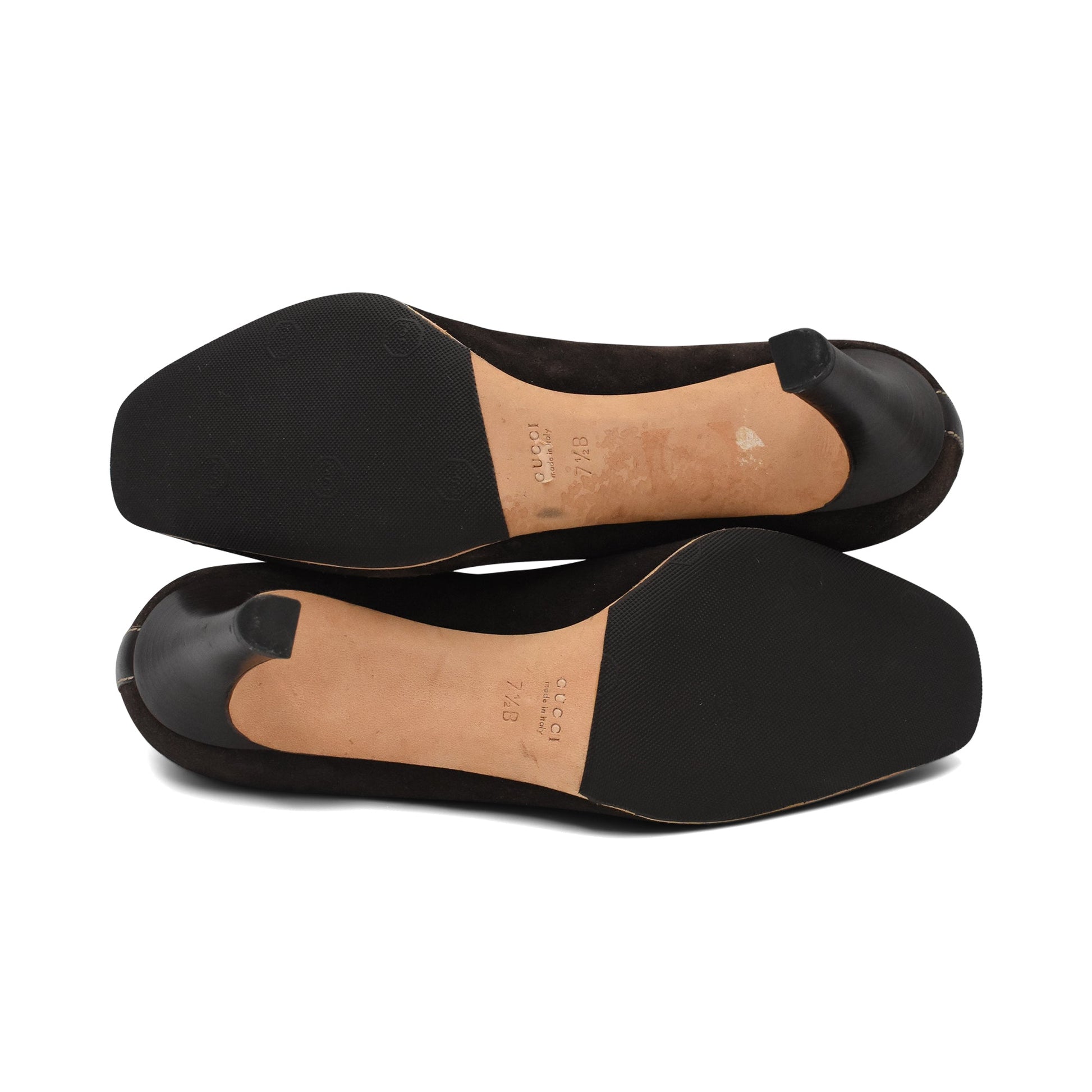 Gucci square toe pumps in brown suede with leather accents and stacked wood heels. Feature fold out toe box detail with gold interlocking GG logo and red-green racing stripe background.