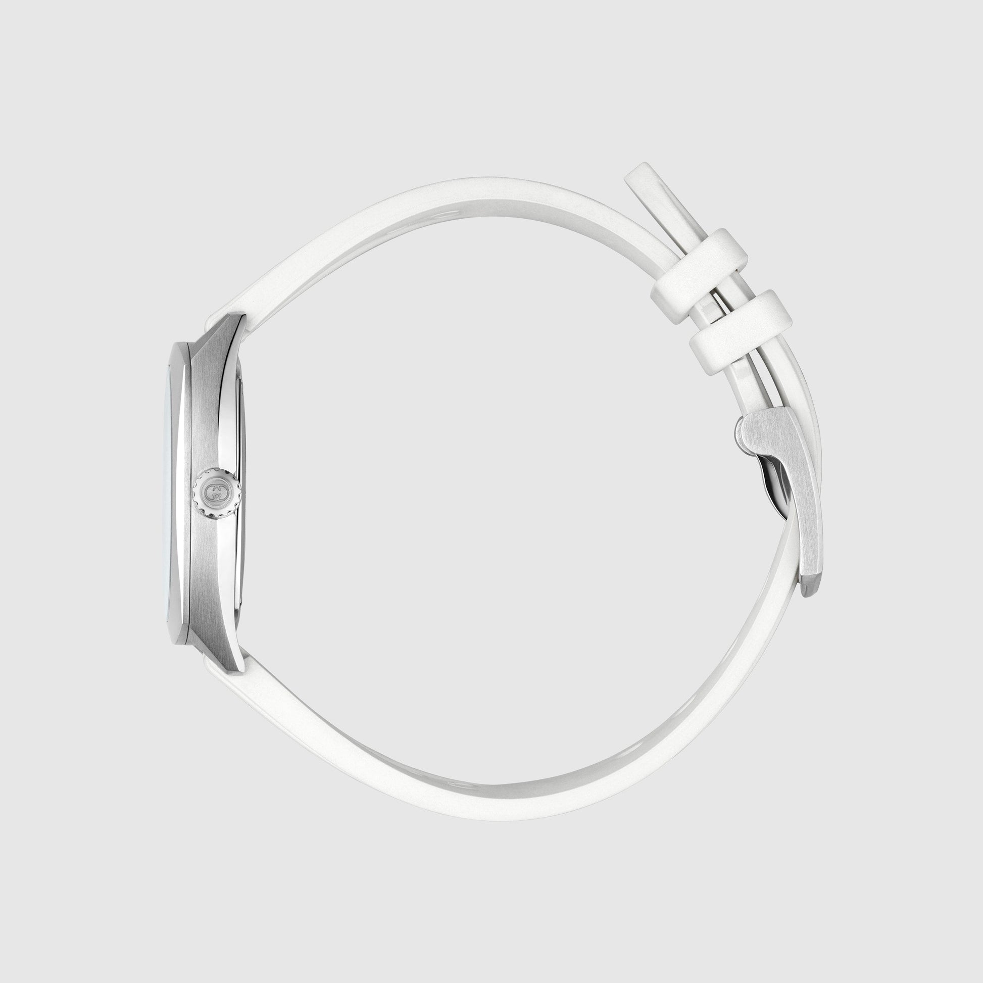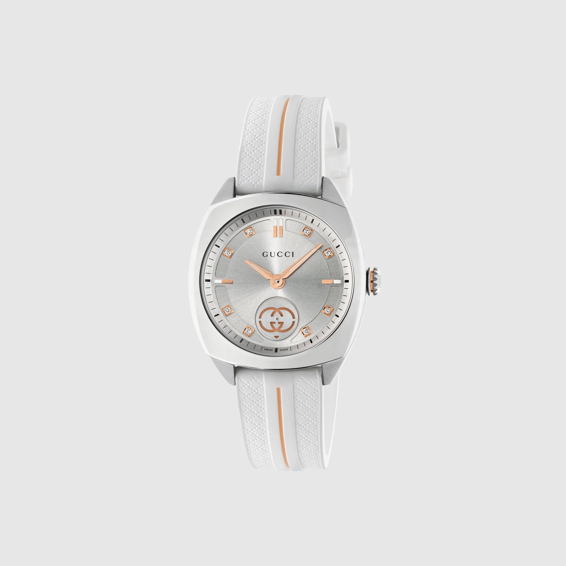 Blending sporty appeal with vibrant hues and signature archival symbols, the Gucci Interlocking line embodies the House’s heritage with a modern twist. Presented with a stainless steel case, this watch features a white rubber strap and a silver sunbrushed dial, enriched with diamonds and emblematic codes.