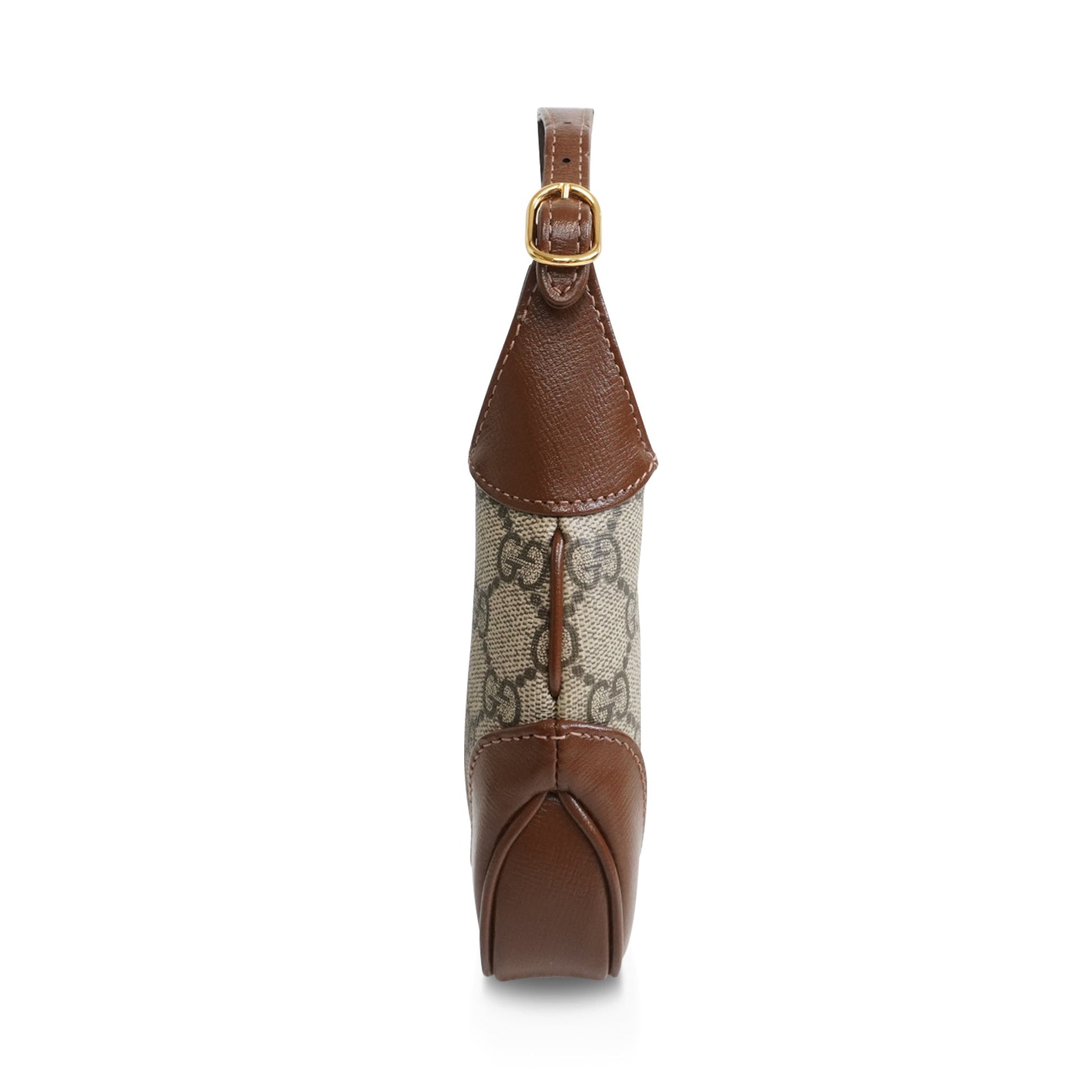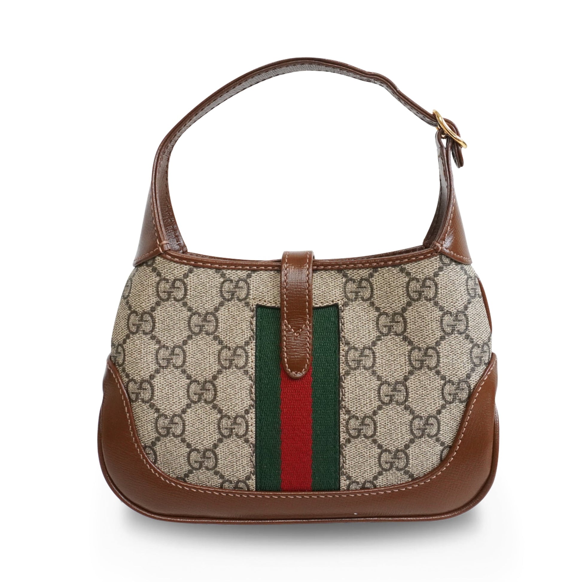 Gucci 'Jackie Mini' handbag in beige 'GG' monogram printed coated canvas with a brown leather trim, a red and green canvas racing stripe down the centre, and a push-lock closure in gold hardware. The bag has an adjustable top handle strap that can be extended into a crossbody.
