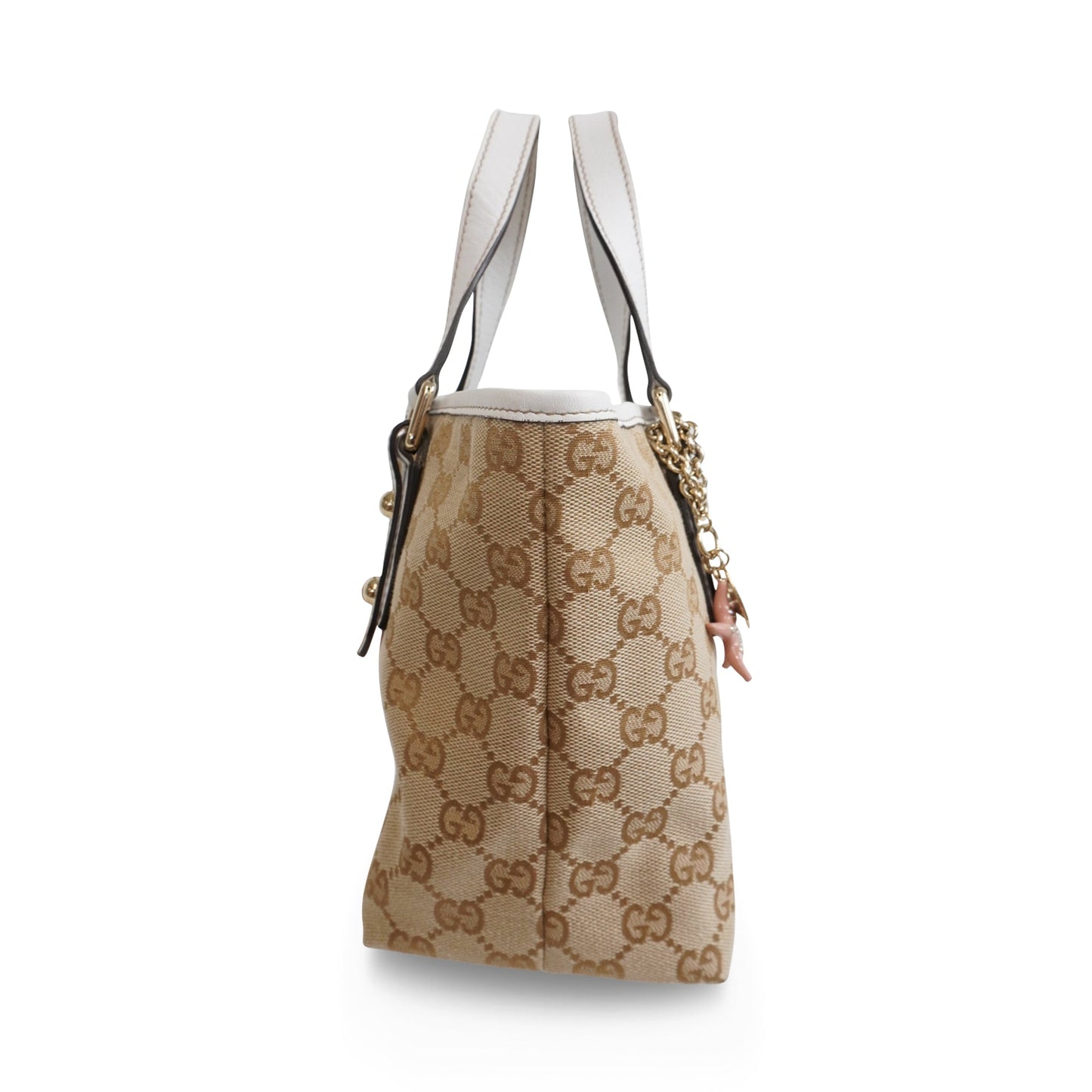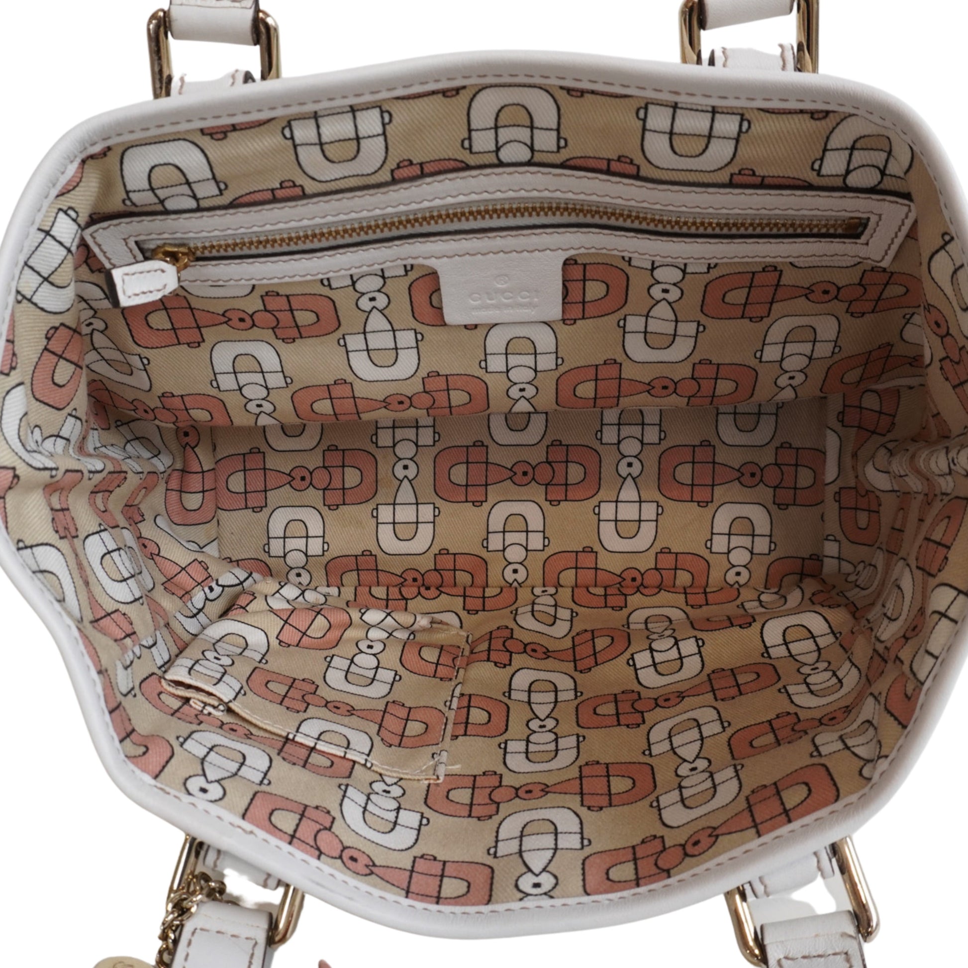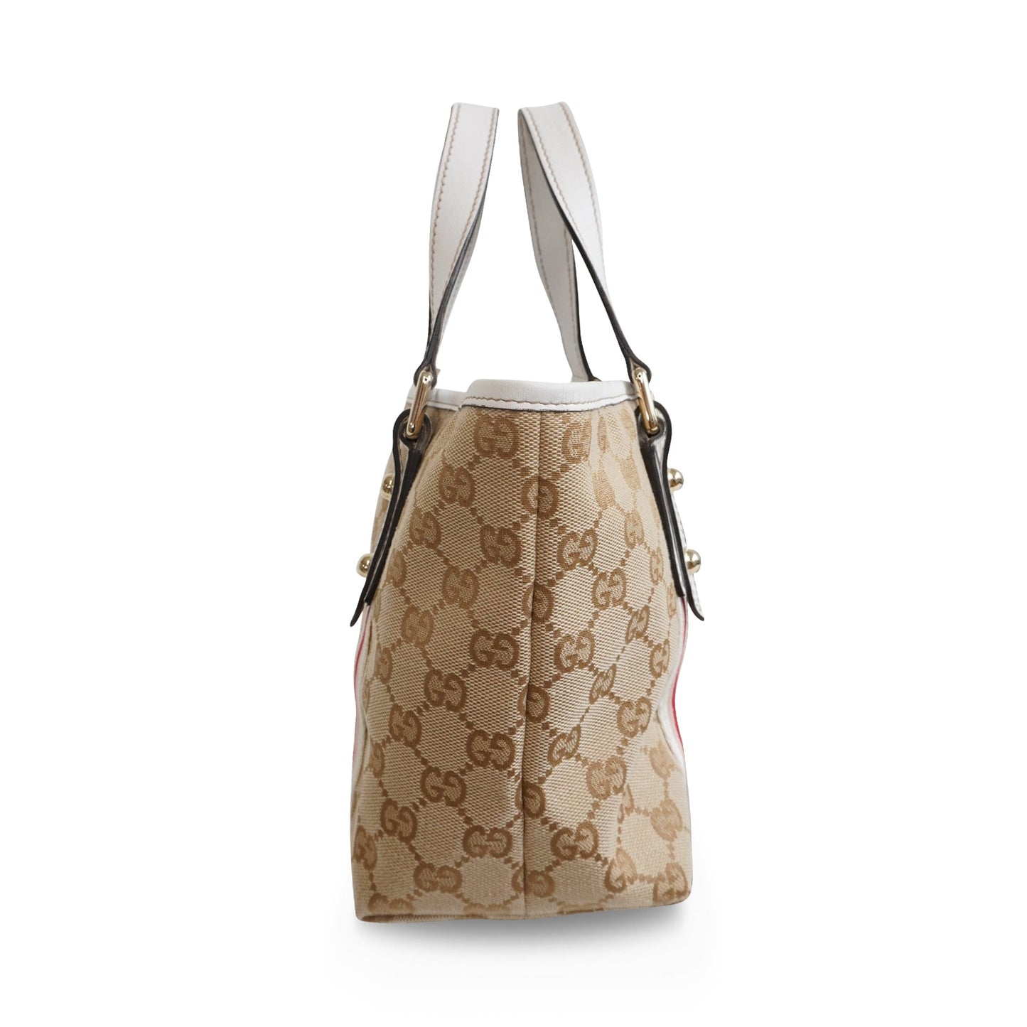 Gucci 'Jolicoeur' mini tote bag in beige monogram printed canvas with a white leather trim, pink and red canvas stripes, and dual top handles with gold stud hardware. The bag has a hanging pink starfish charm on the front, a graphic horse-bit printed interior, and an interior zip pocket.