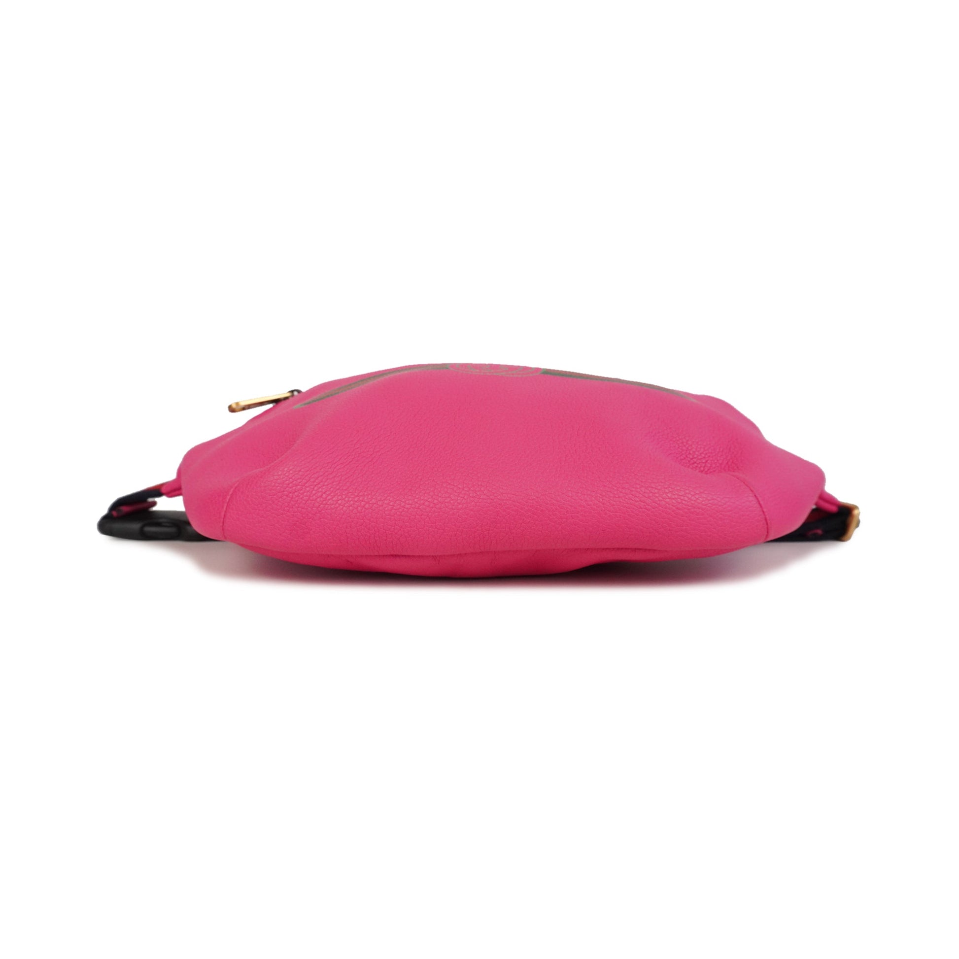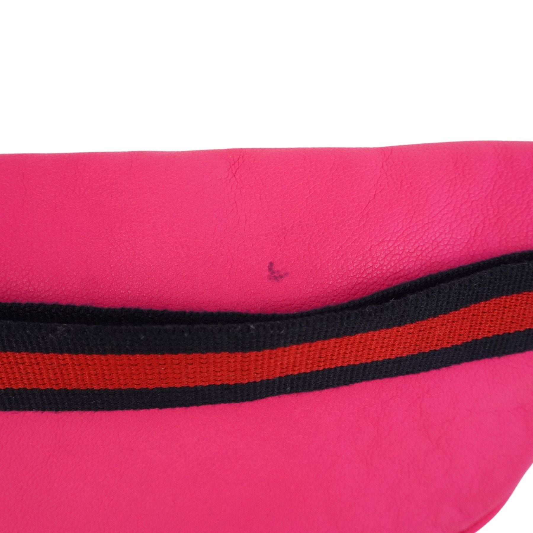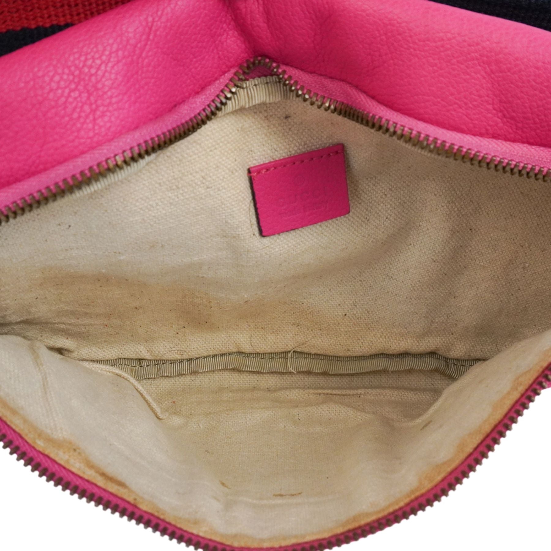 Gucci large waist bag in bright pink leather with green and red racing stripe and logo on the front. Features a navy blue and red striped adjustable canvas strap with a black plastic snap buckle, and a gold hardware zip closure on the front. The interior is beige canvas lined.