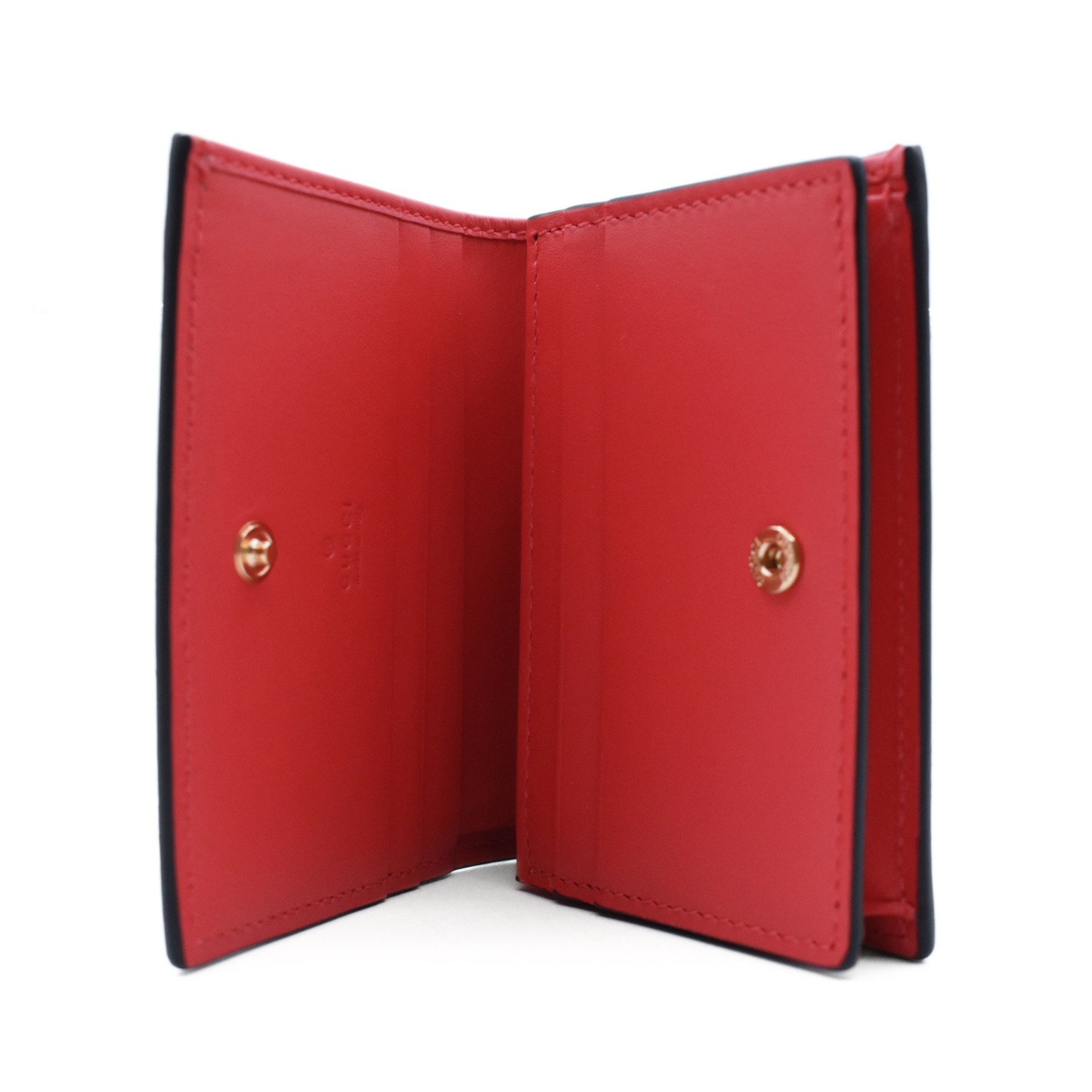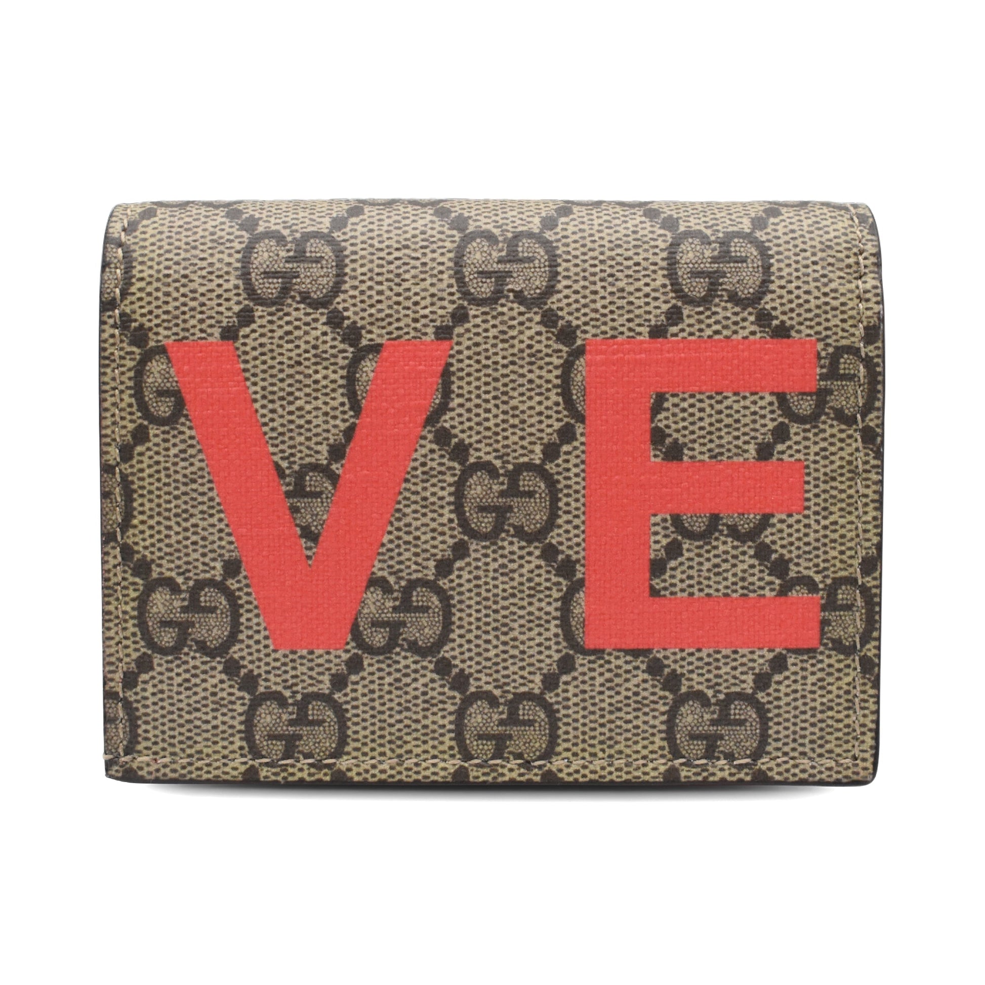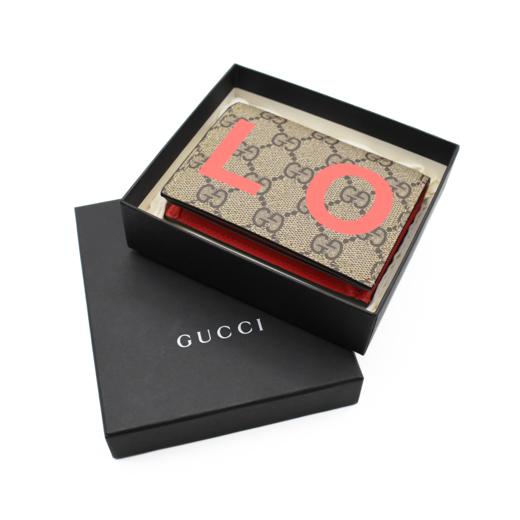 Gucci 'Love' compact wallet in brown monogram Guccissima coated canvas with red leather lining and 'LO VE' printed across both sides. Features a snap button closure, 6 card slots, a bill pocket, and a coin pocket with zip.