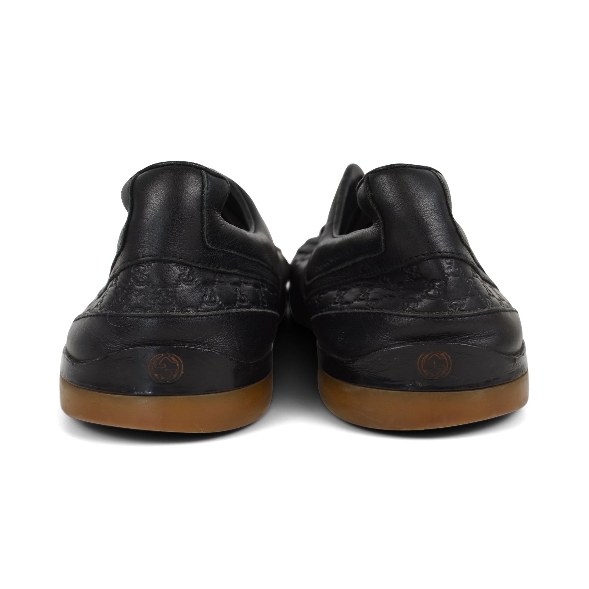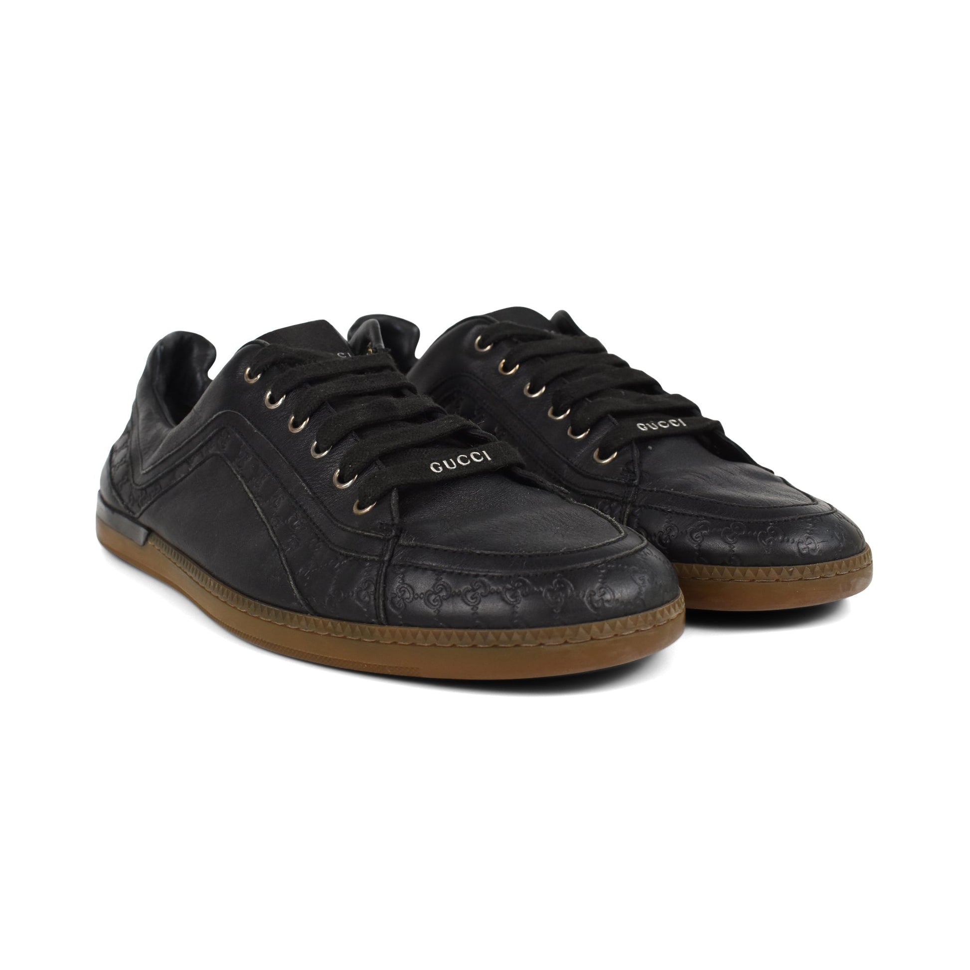 Gucci low-top sneakers in black leather with logo monogram detailing. Features black flat laces with silver logo, silver hardware lace grommets, and brown rubber gum sole.