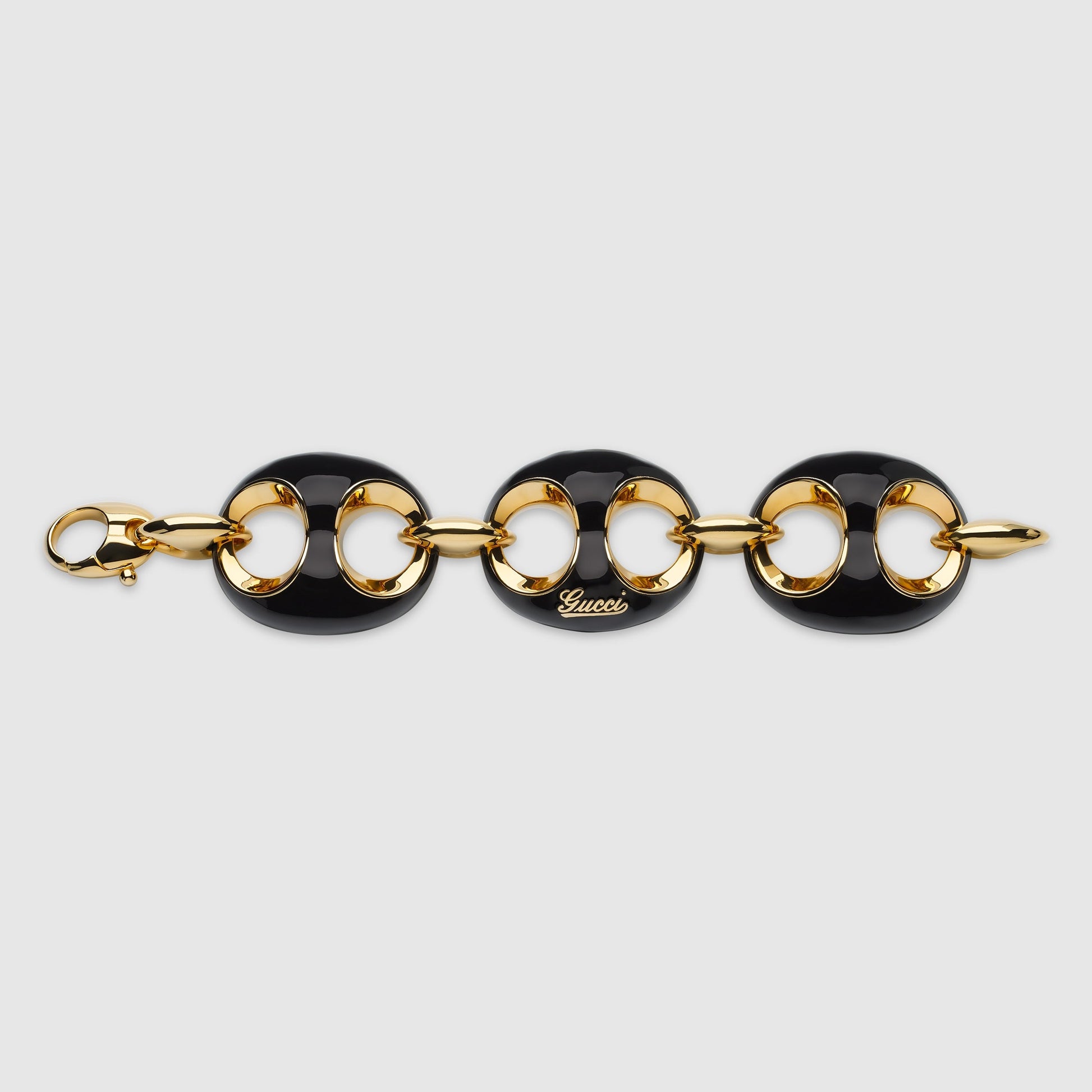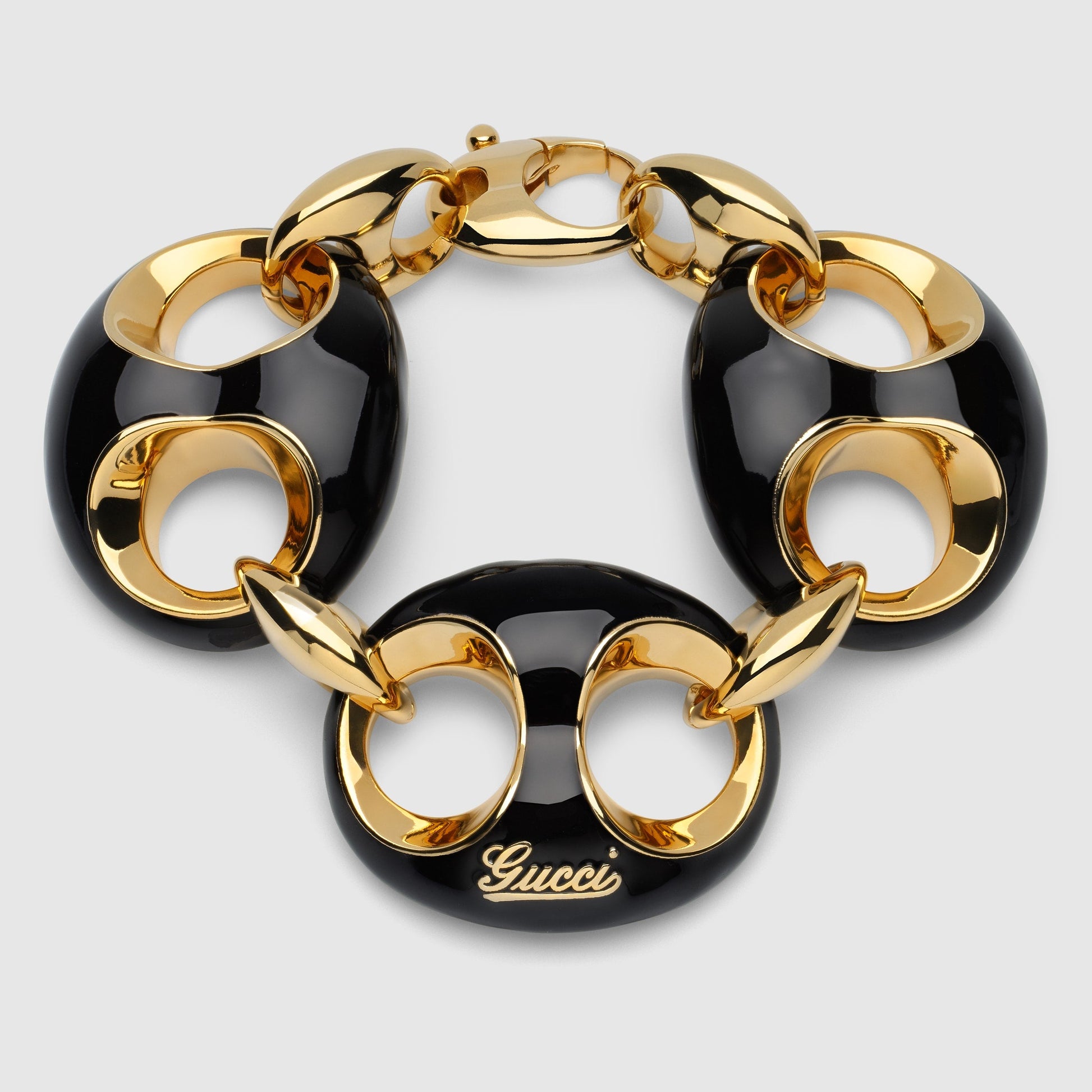 The Marina Chain is a signature design from 1960s, inspired by the glamorous world of yachting. Here, this fashion jewelry bracelet is proposed with black enamel, complete with the Gucci script.