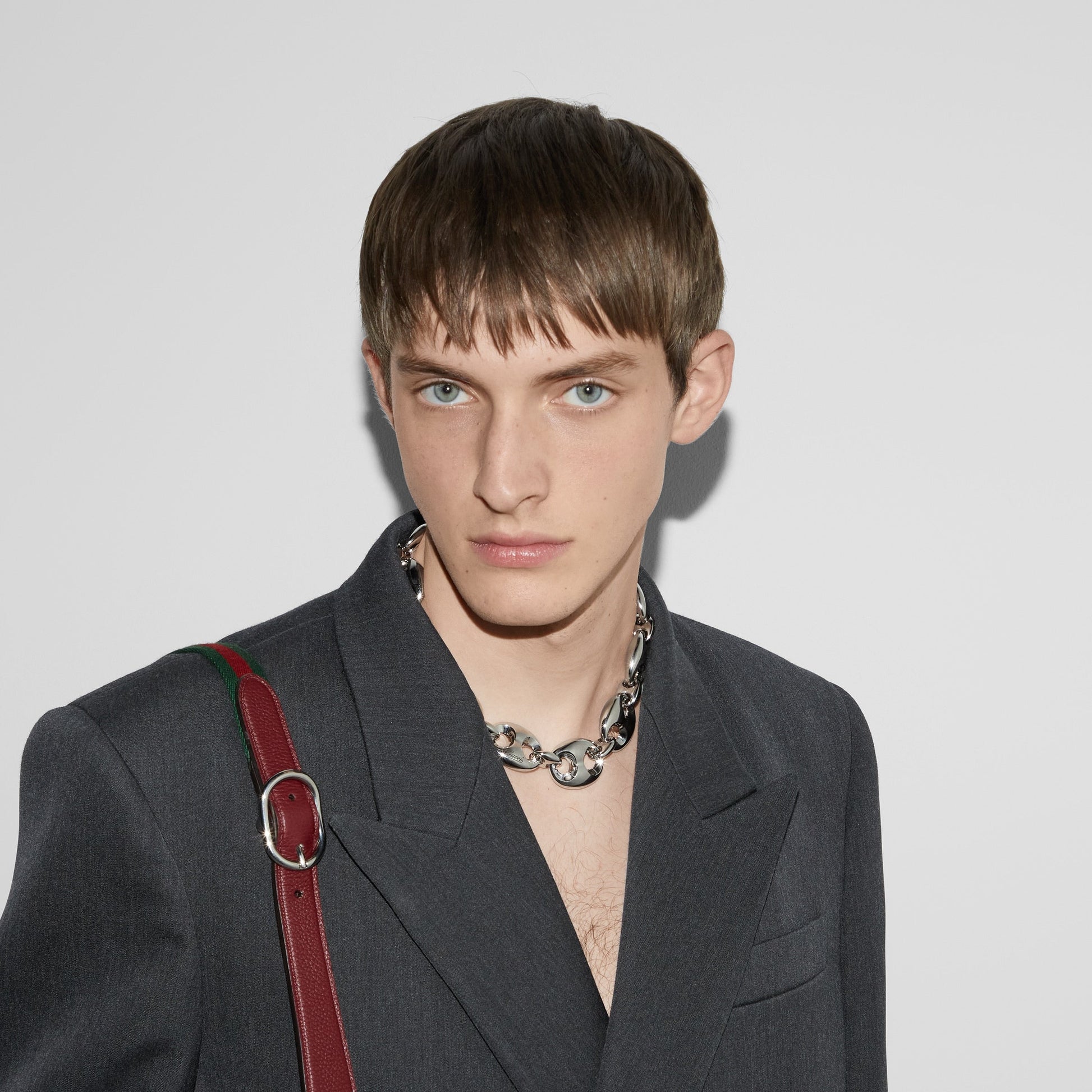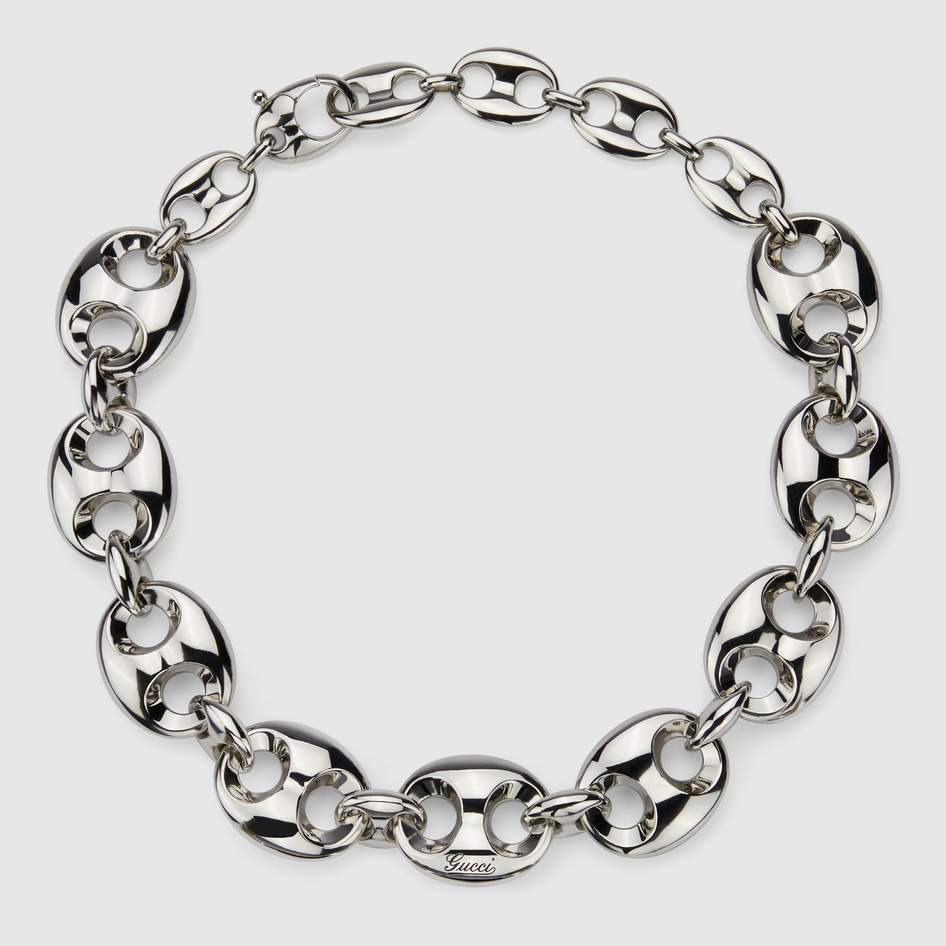 The Gucci script keeps defining iconic pieces of the fashion jewelry selection as it enhances its sculptural appeal for the men's Fall Winter 2024 collection. Here, it enriches this marina chain necklace crafted in palladium metal.