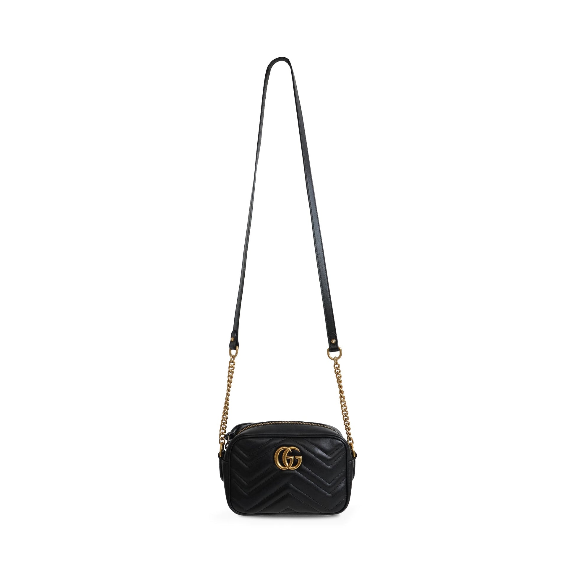 Gucci 'Marmont' mini crossbody bag in black matelassé chevron quilted leather with GG logo plaque in gold hardware on the front and embroidered GG logo on the back. Features a top zip closure, chain shoulder strap and beige suede lining with an inner open pocket.