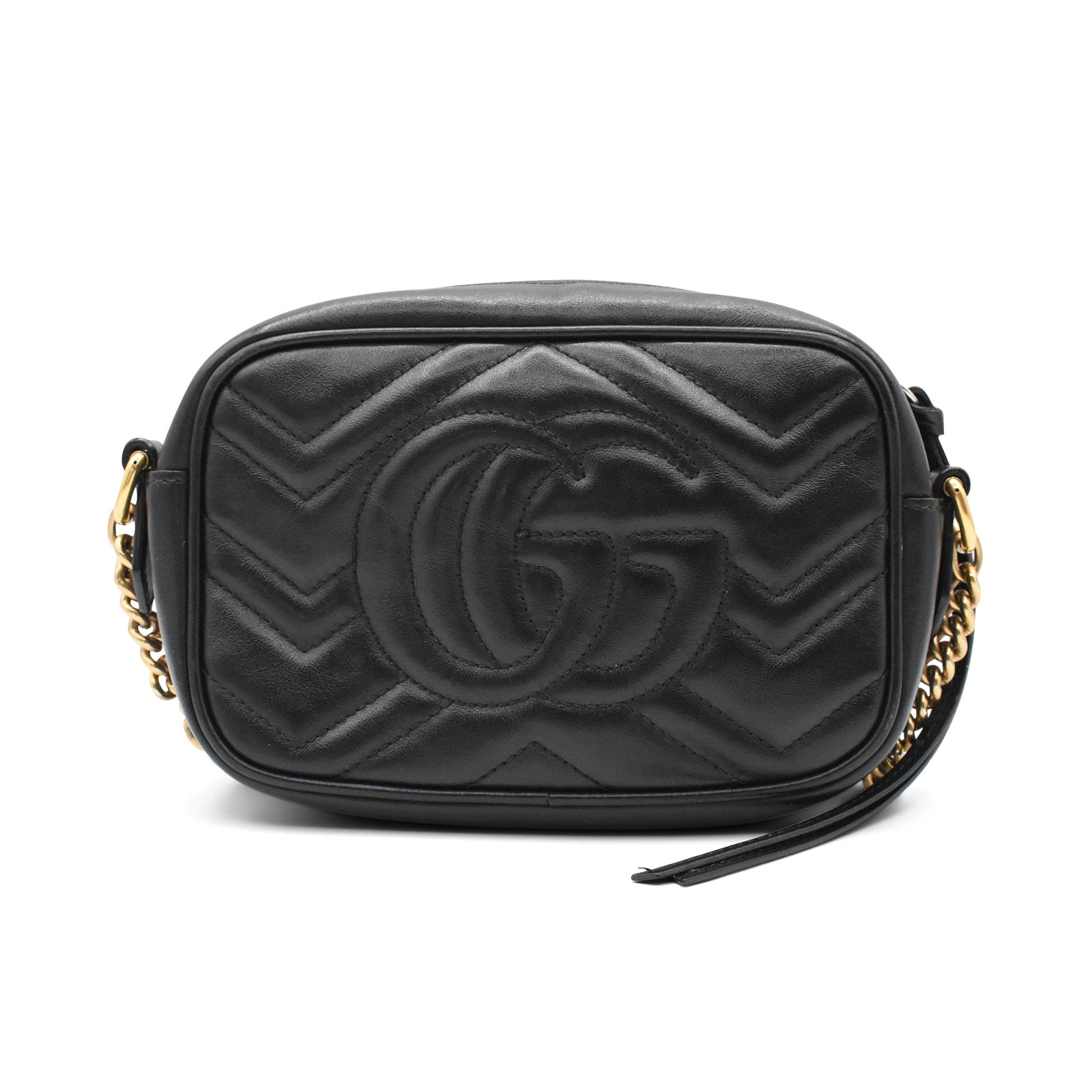 Gucci 'Marmont Mini' crossbody bag in black matelassé chevron leather with GG logo plaque in gold hardware on the front and embroidered GG logo on the back. Features a top zip closure, chain shoulder strap and beige suede lining with an inner open pocket.